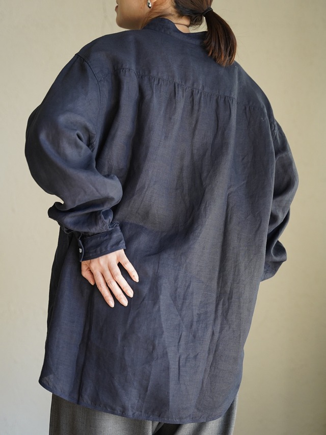 MITTAN 大麻シャツ 3 SH-137 濃紺 サイズ 3 植物繊維(大麻)100% ¥29,700(本体価格¥27,000) 大麻100%の糸を経糸、緯糸に使用しています。大麻は強靭な繊維ですが、経年変化で肌に徐々に馴染んでゆき、麻から綿のような質感の変化が楽しめます。大麻の特性であるひんやりとした触感は洗濯を繰り返しても継続し、真夏でも快適に着用が可能です。 シャツは現代の民族服を構成する洋服としての提案になります。構成は洋服のルールに則りながら、極力デザインを削ぎ落とし、機能性に基づいたパターンメイクとしています。具体的には袖山をいせ込み、袖底を高めに設定することで腕周りの運動量を、背中のヨークにタックやギャザーではなく、いせを入れることで背中の運動量を確保しています。オーバーサイズでゆったりとしたシルエットです。 取り扱い方法 ※天然素材独特の糸の節やムラ感があります。風合いを重視し、繊維長が不均一な原料を使用している為ですので、表情の一部としてお考えください。生地の糸が切れ、穴が開く可能性がある為、糸の節は無理に引っ張らないようご注意ください。 商品購入金額の合計が、20,000円以上(税込)で、送料無料となります。 スタッフモデル身長 156㎝