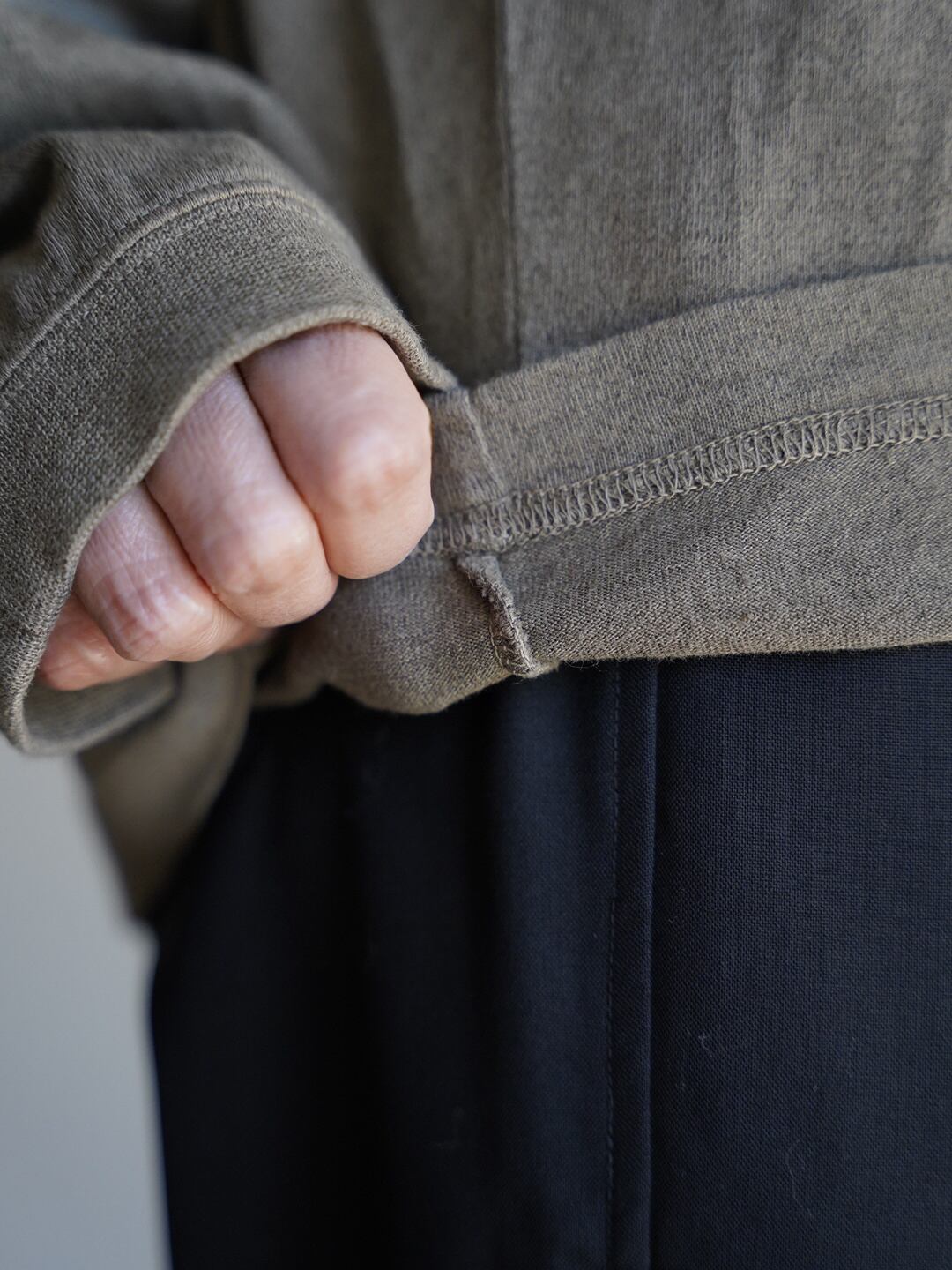 大麻の中では非常に細い、毛番手で60番の大麻の糸と、インドの超長綿であるスビンコットンのコンパクト紡績で作った綿番手40番の糸を撚糸をかけて糸を作り、天竺編みで編んでいます。大麻だけでなく、綿を混ぜることでキックバックを保ち、着用を続けても伸びきってしまわないように設計しています。また、衿ぐりや一部の袖口に使用しているフライス生地には、ポリウレタンの伸縮糸を入れて編んでいます。これにより、より堅牢な仕様となっています。