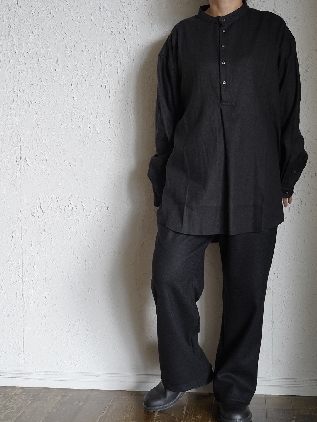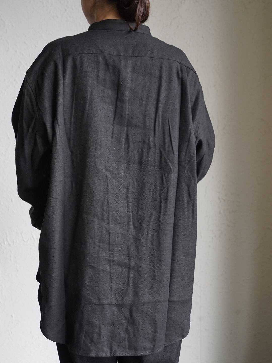 身幅を広めに取ったしっかりとしたボリューム感のあるプルオーバーシャツです。前立ての下から大きくタックをとり、身体とのゆとりを保つと同時に生地の綺麗な波打ち感を強調しています。タックインのしやすさを考慮し、裾は丸くカーブしたシルエットを採用しています。