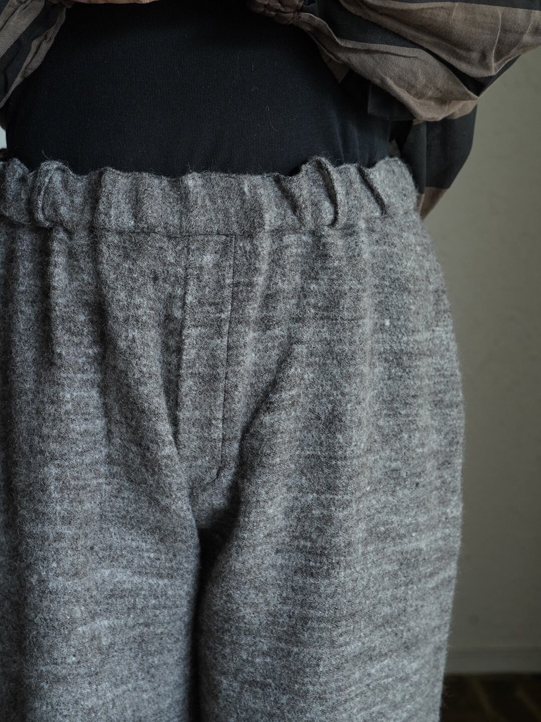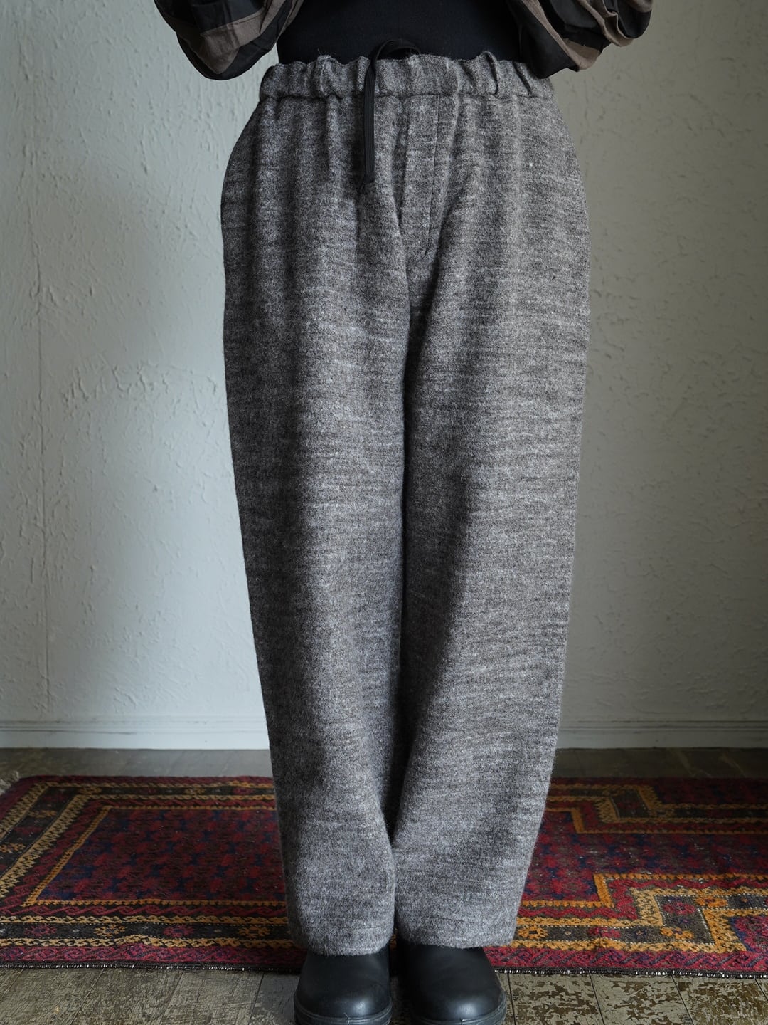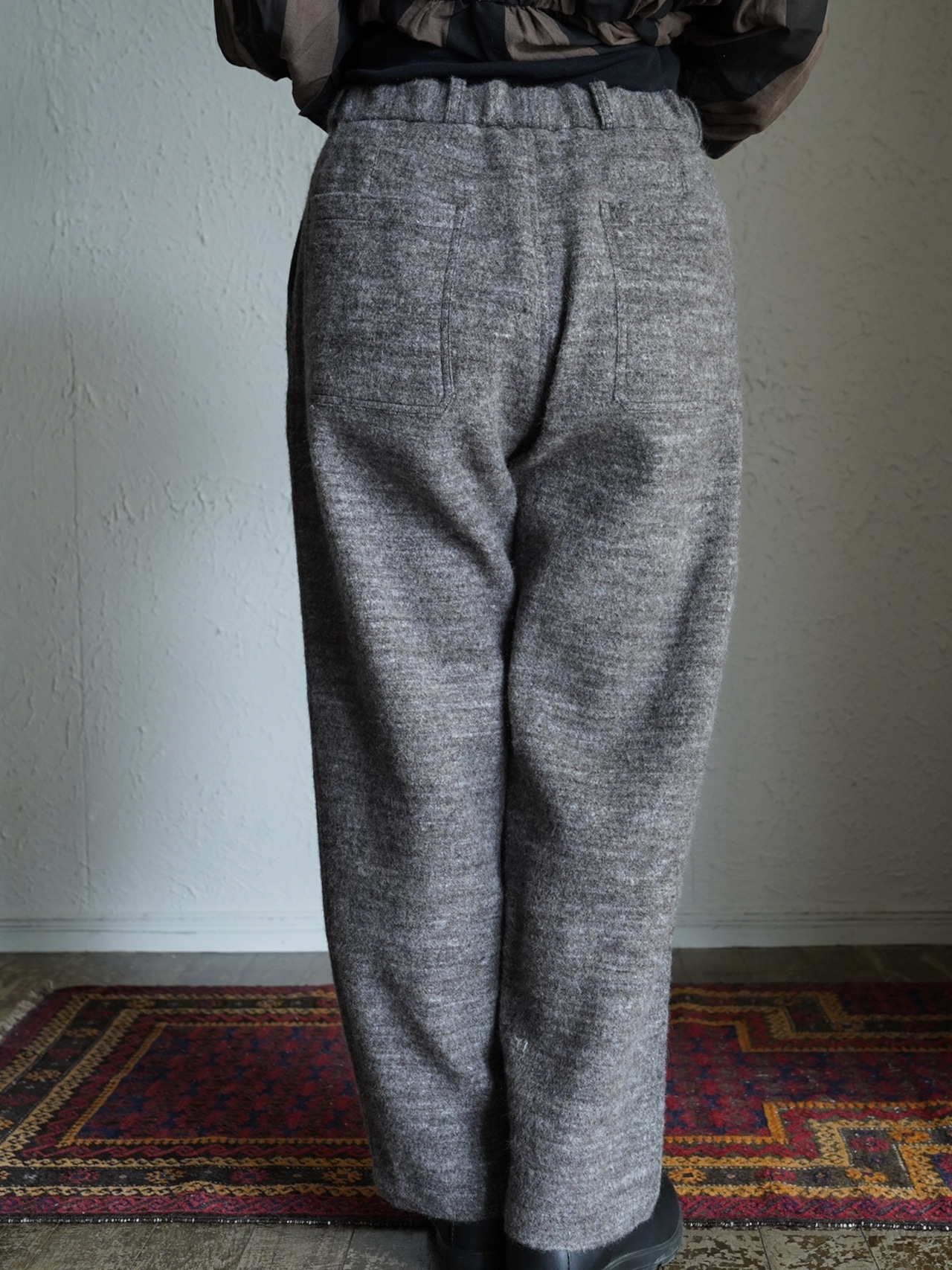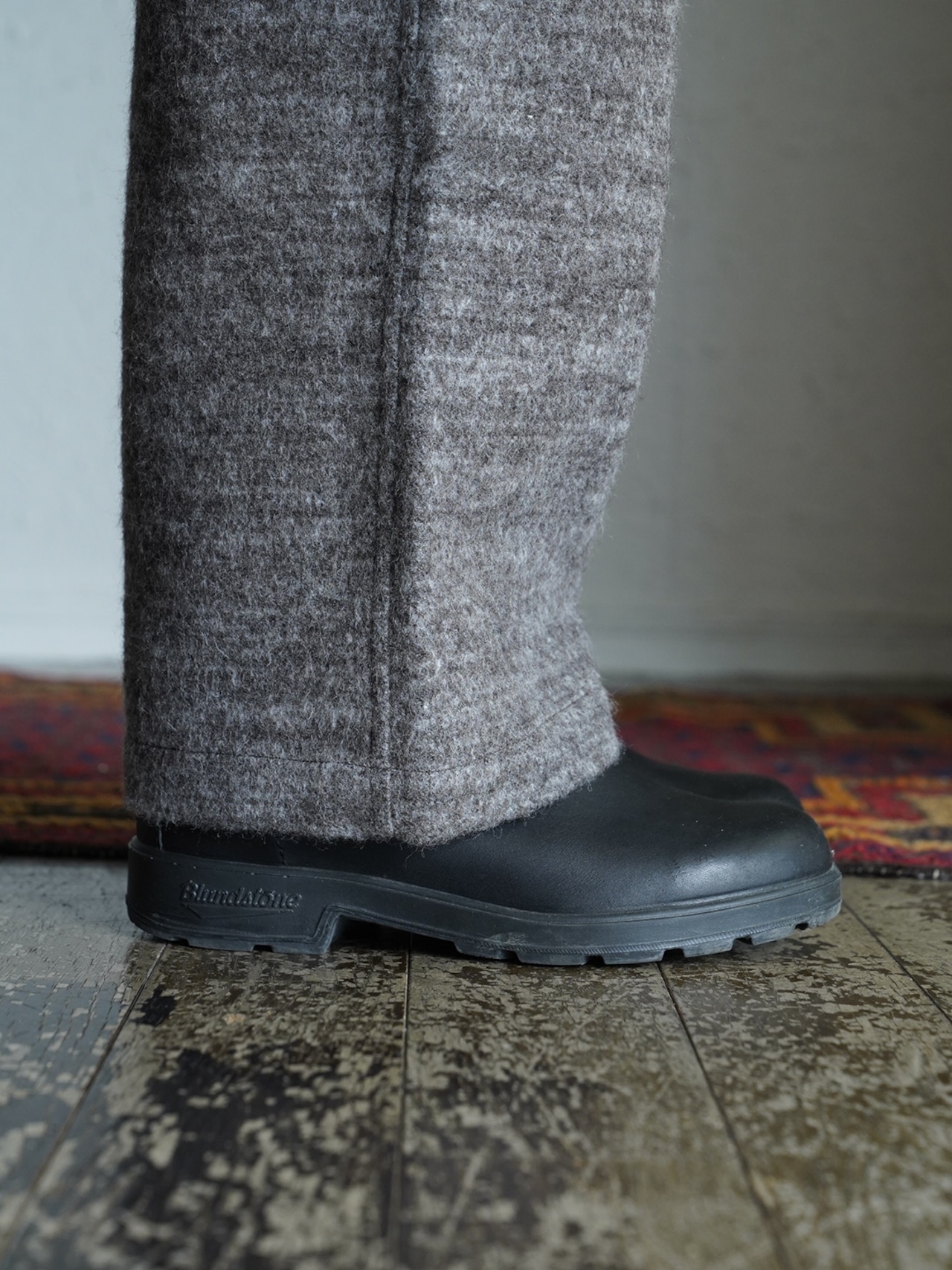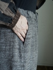 経糸には毛番10番の黒に染めた大麻を使用し、緯糸には毛番14番のシェットランドウールとリネンの混紡糸を使用したオリジナル生地です。生地の組織は朱子織りで、裏側を表として使用するバックサテンの構造になっています。これにより、表側に緯糸のシェットランドウールリネンが多く現れます。さらに、表面にのみ起毛加工を施しているため、暖かさと強度を兼ね備えた生地となっています。