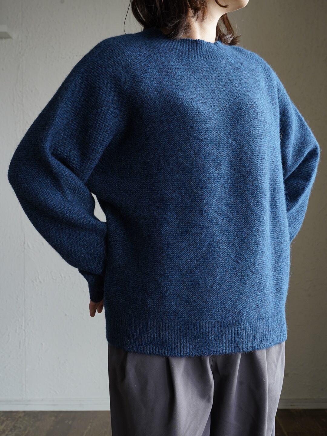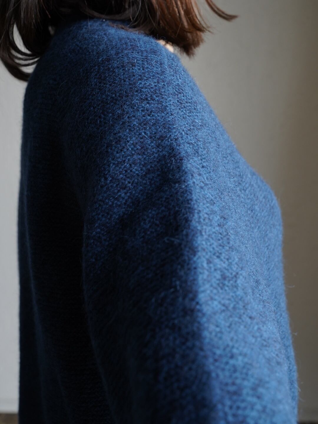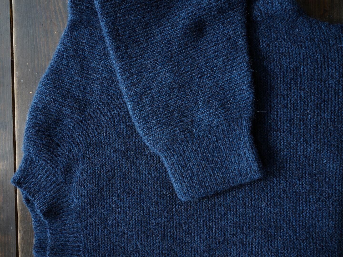 身頃と袖を広めに設計することで、動きやすさとゆとりを実現したデザインです。また、しっかりとした質感のガーター編みを本体に使用することで、立体的なボリューム感が生まれるシルエットになっています。長過ぎない丈で、すっきりと着用することが可能です。