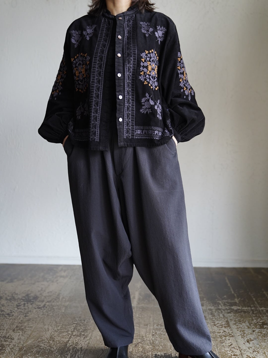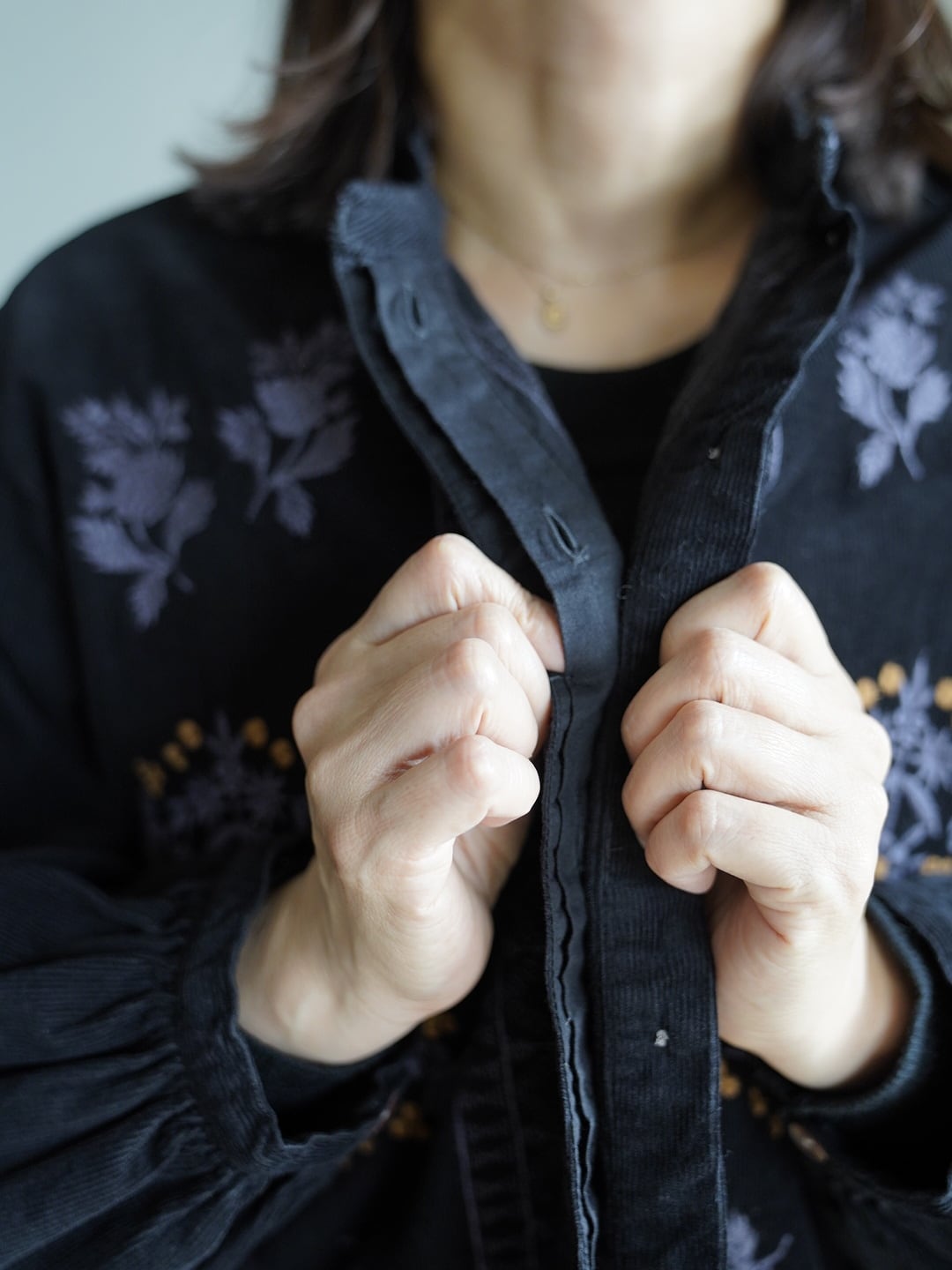 生地には、インドの細コール(コーデュロイ)を使用。やわらかく軽やかで、起毛の質感が肌にそっとなじみます。二色の糸で描かれた刺繍は、立体感と奥行きを生み出し、手仕事ならではの温かみを感じさせます。