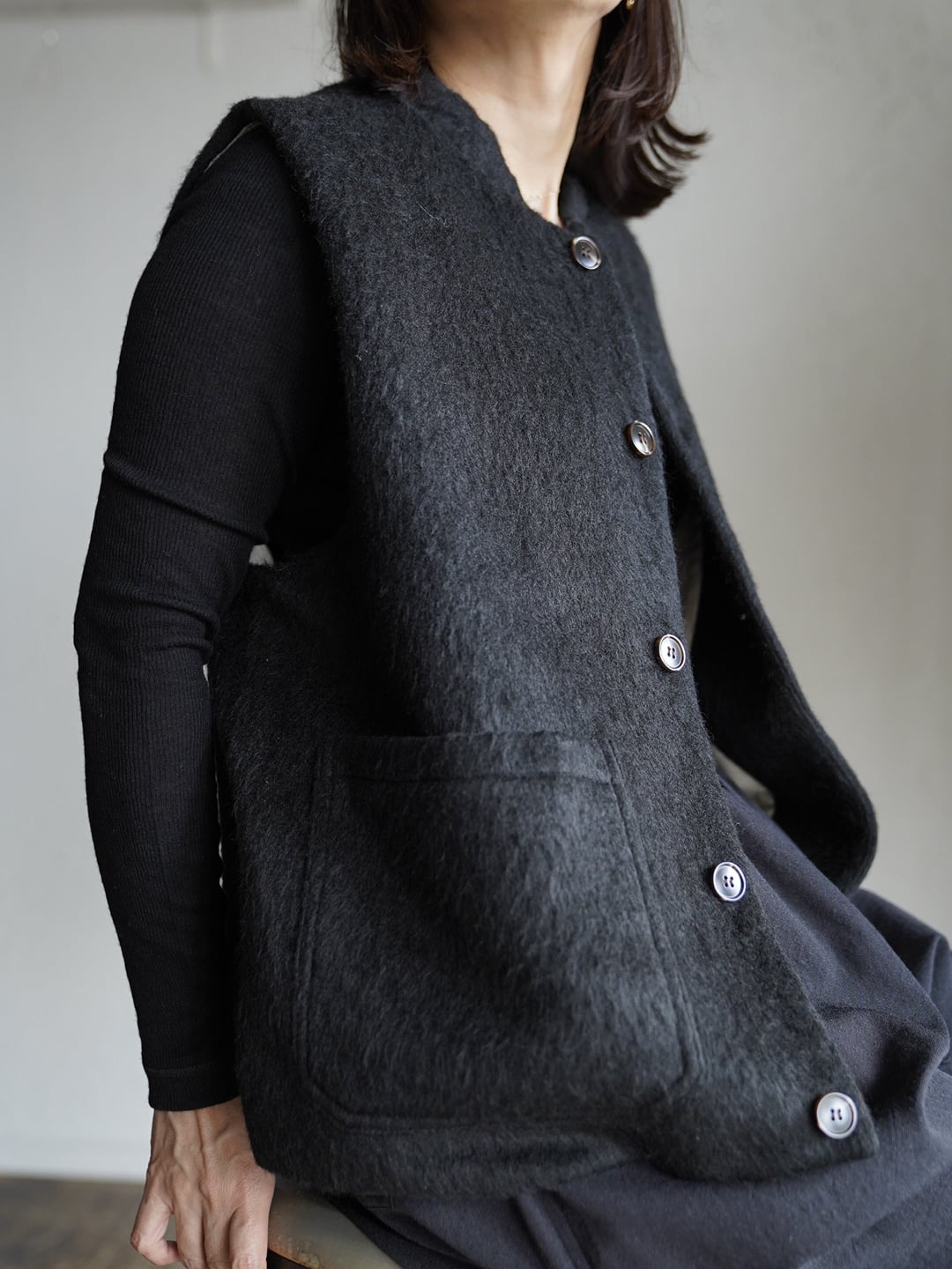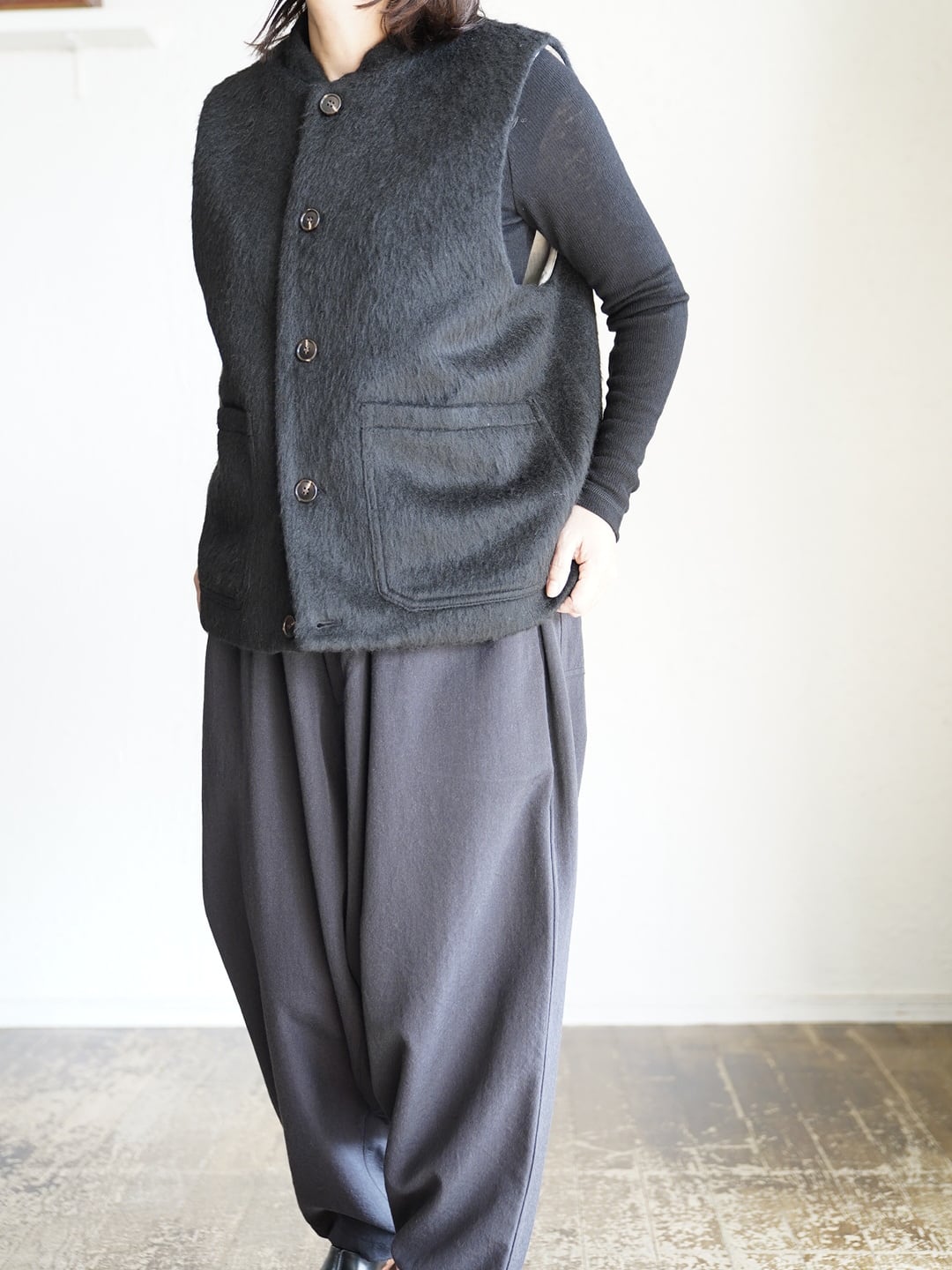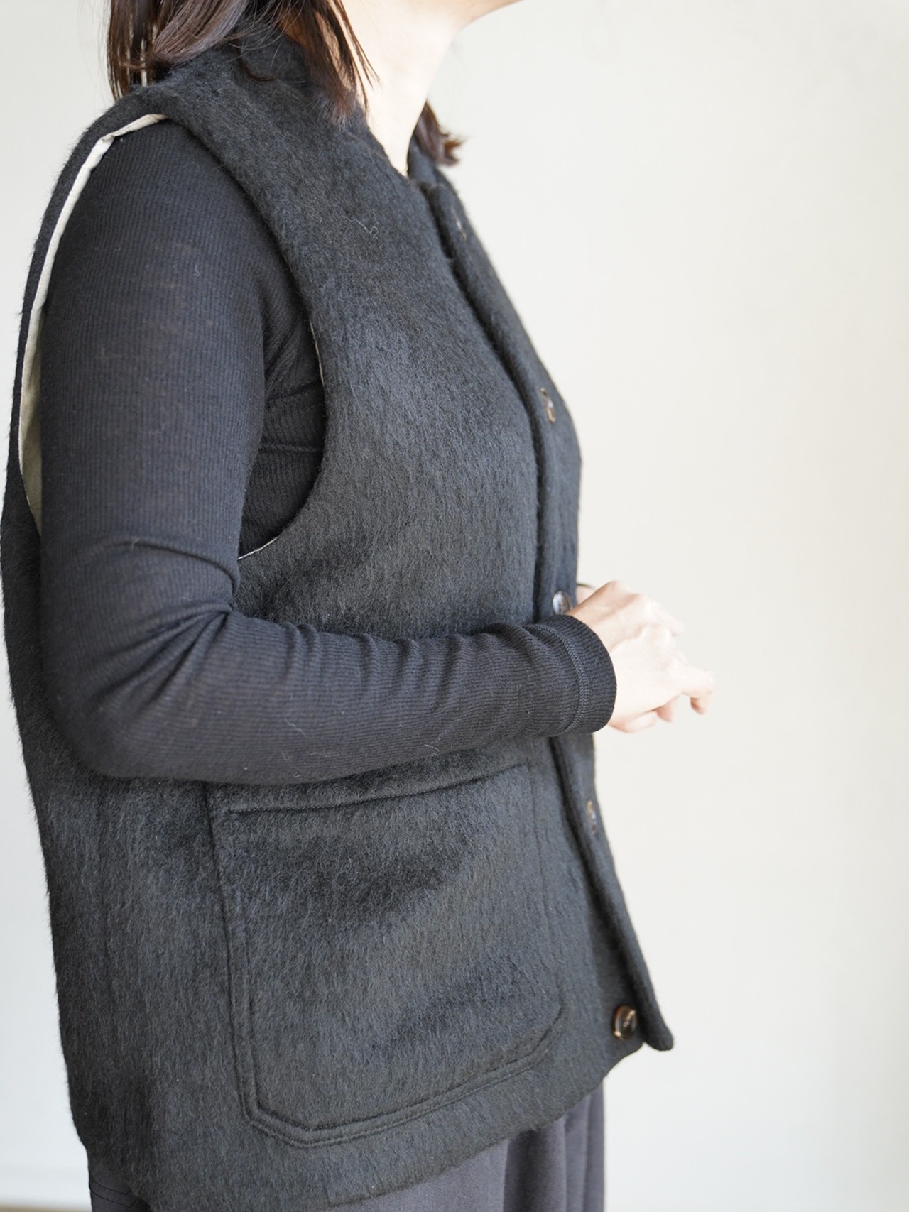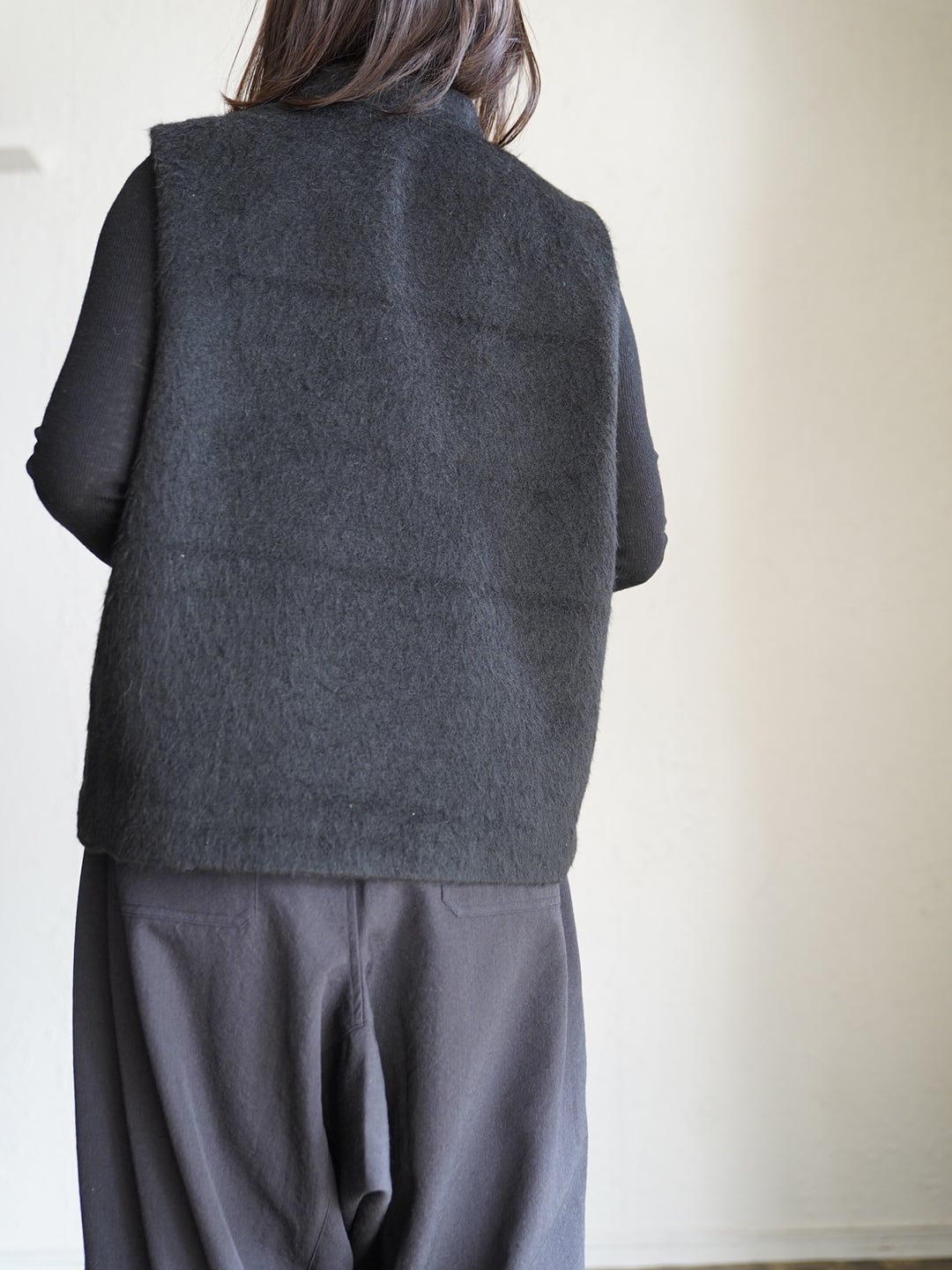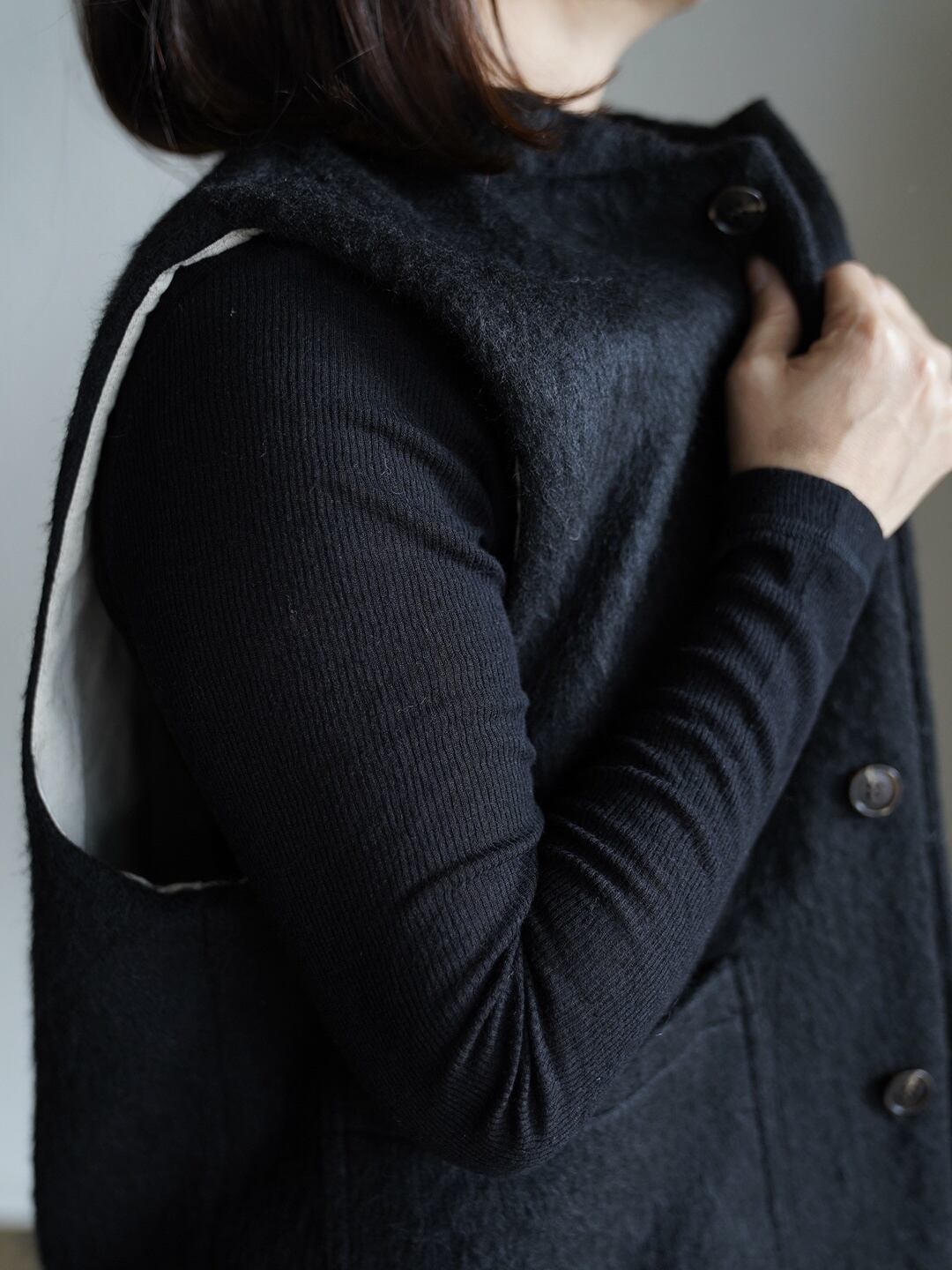 表地には、毛足の長いあたたかくソフトな触り心地のシャギー生地。裏地には、綿の持つ柔らかさと保温性、リネンの持つ通気性の良さと独特のシャリ感。表地裏地共に、デザイン性と機能性を兼ね揃えた万能ベスト。寒い時期に長く活躍します。雰囲気があり、大変表情豊かな一枚で、重ね着による体温調節やレイヤードのアクセントとして広く着用できます!