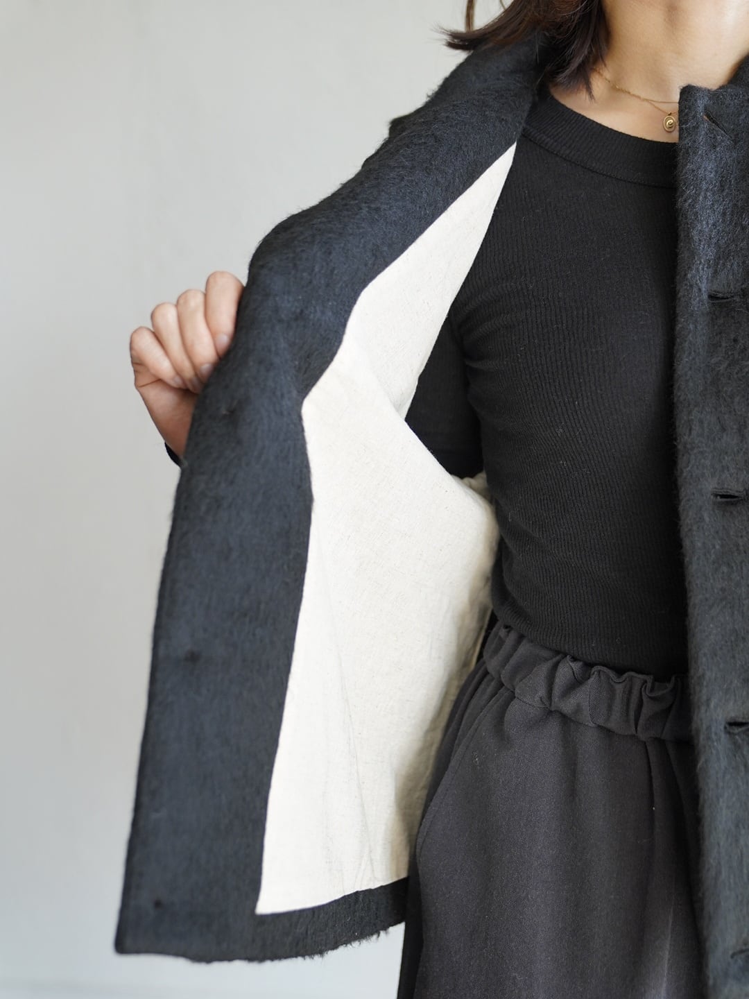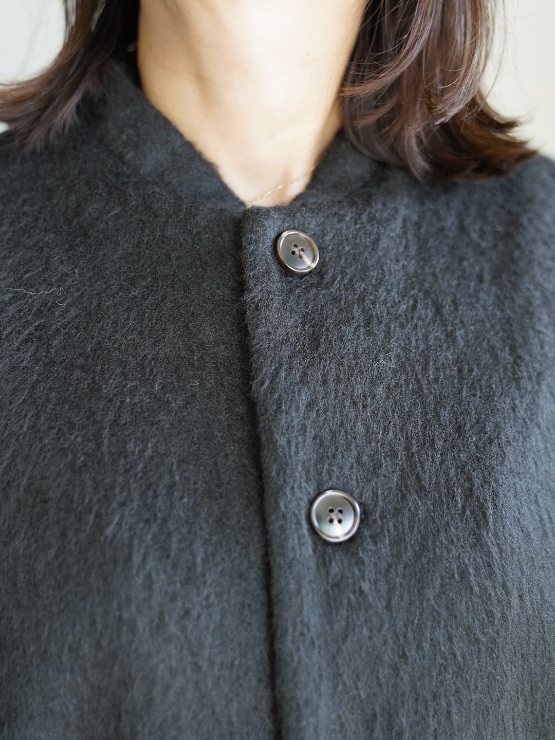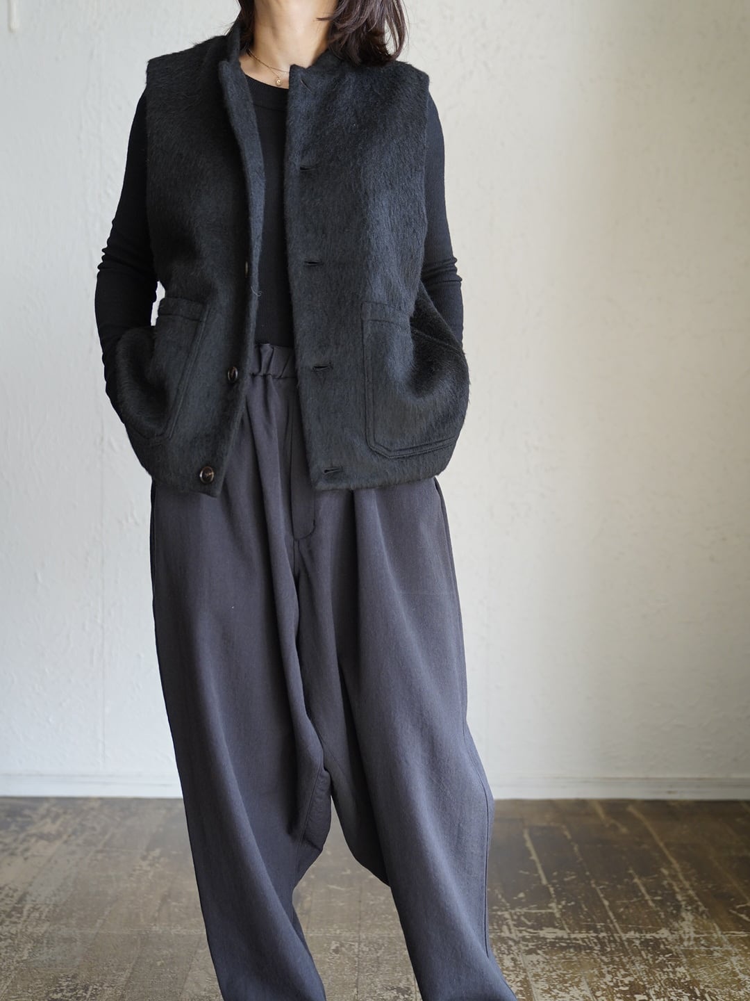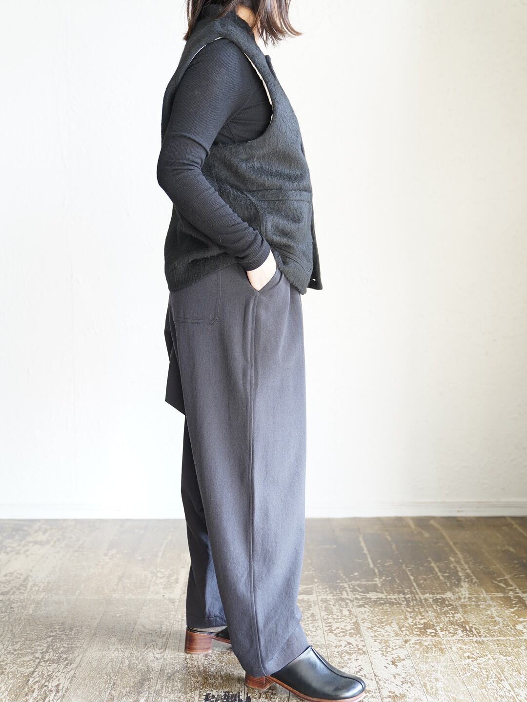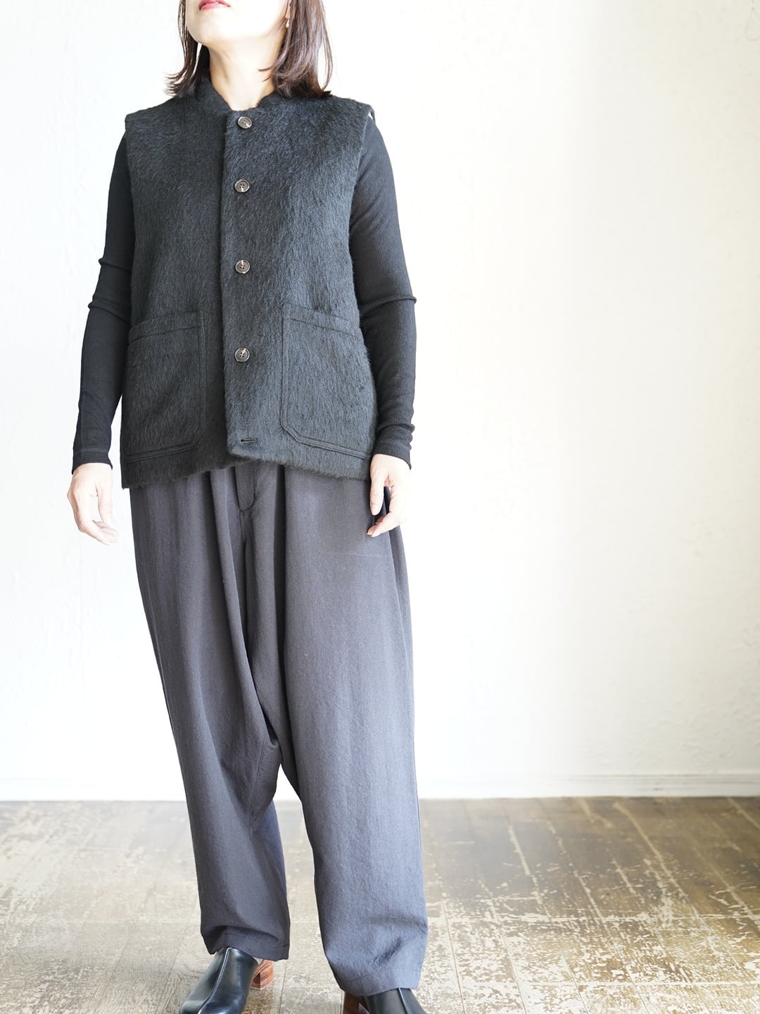 表地には、毛足の長いあたたかくソフトな触り心地のシャギー生地。裏地には、綿の持つ柔らかさと保温性、リネンの持つ通気性の良さと独特のシャリ感。表地裏地共に、デザイン性と機能性を兼ね揃えた万能ベスト。寒い時期に長く活躍します。雰囲気があり、大変表情豊かな一枚で、重ね着による体温調節やレイヤードのアクセントとして広く着用できます!