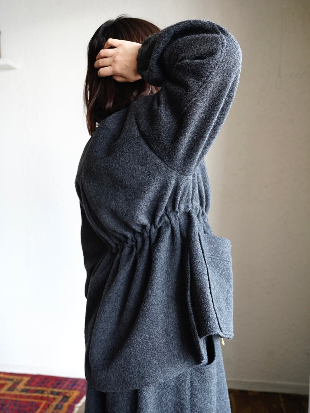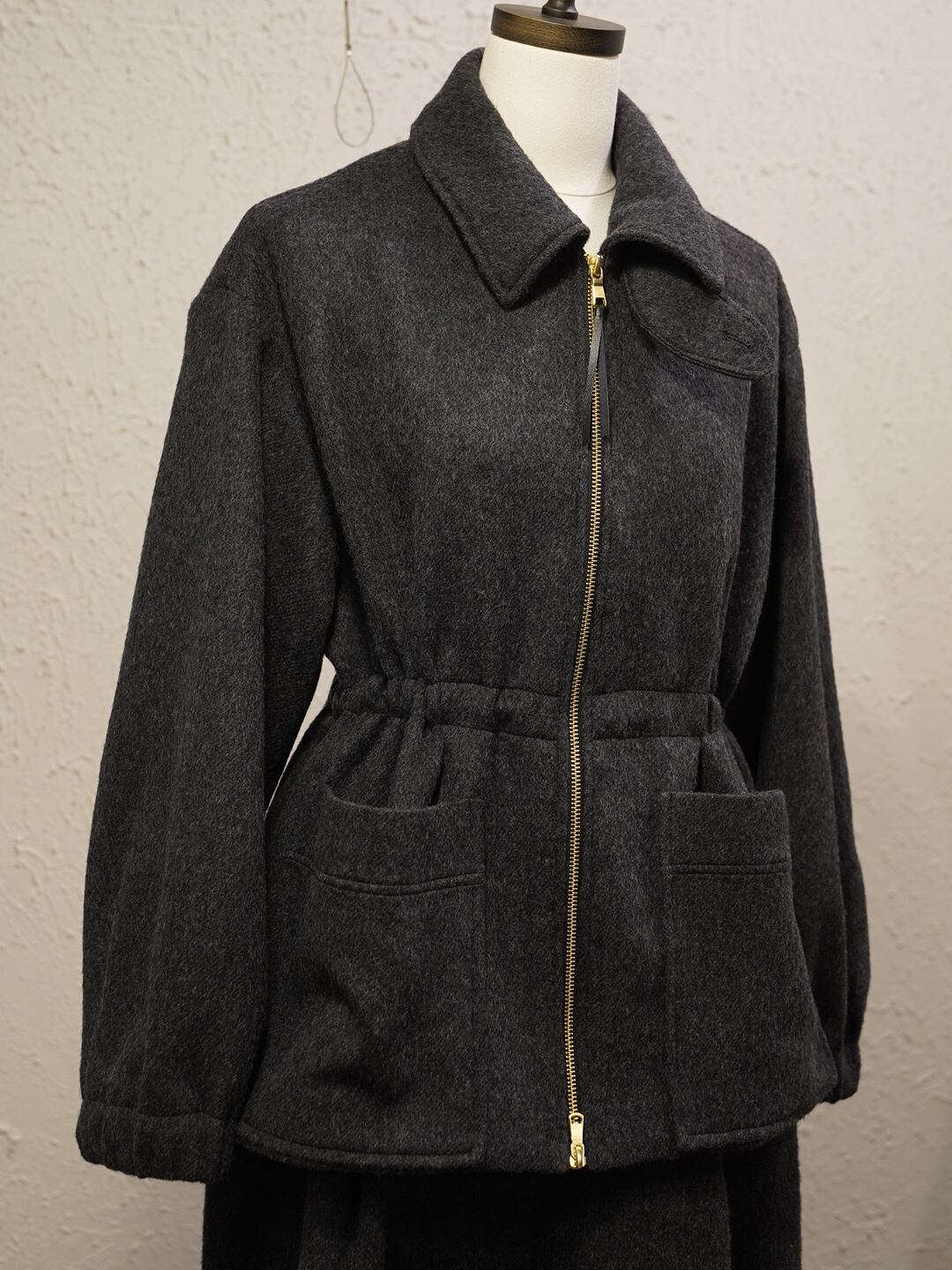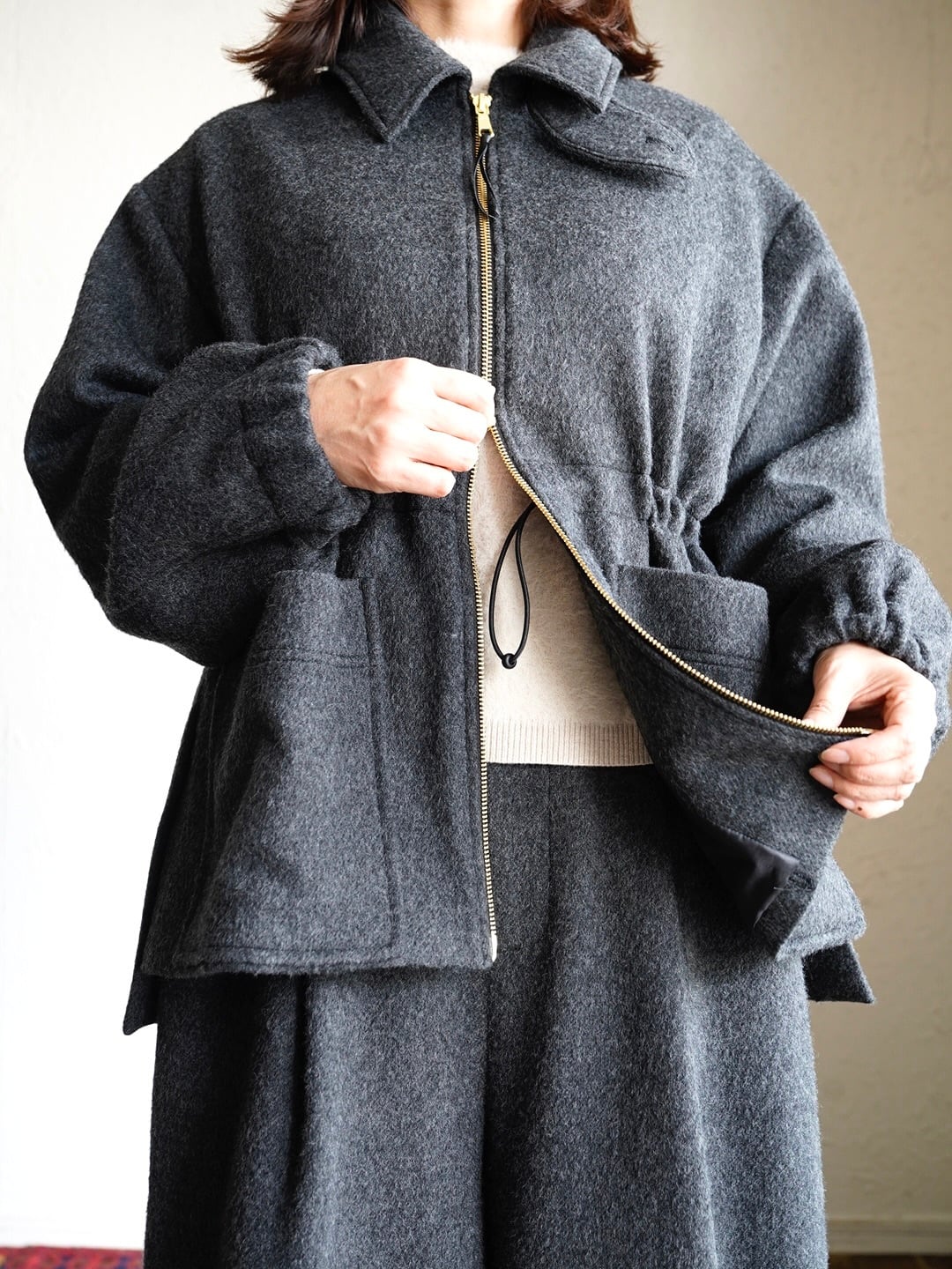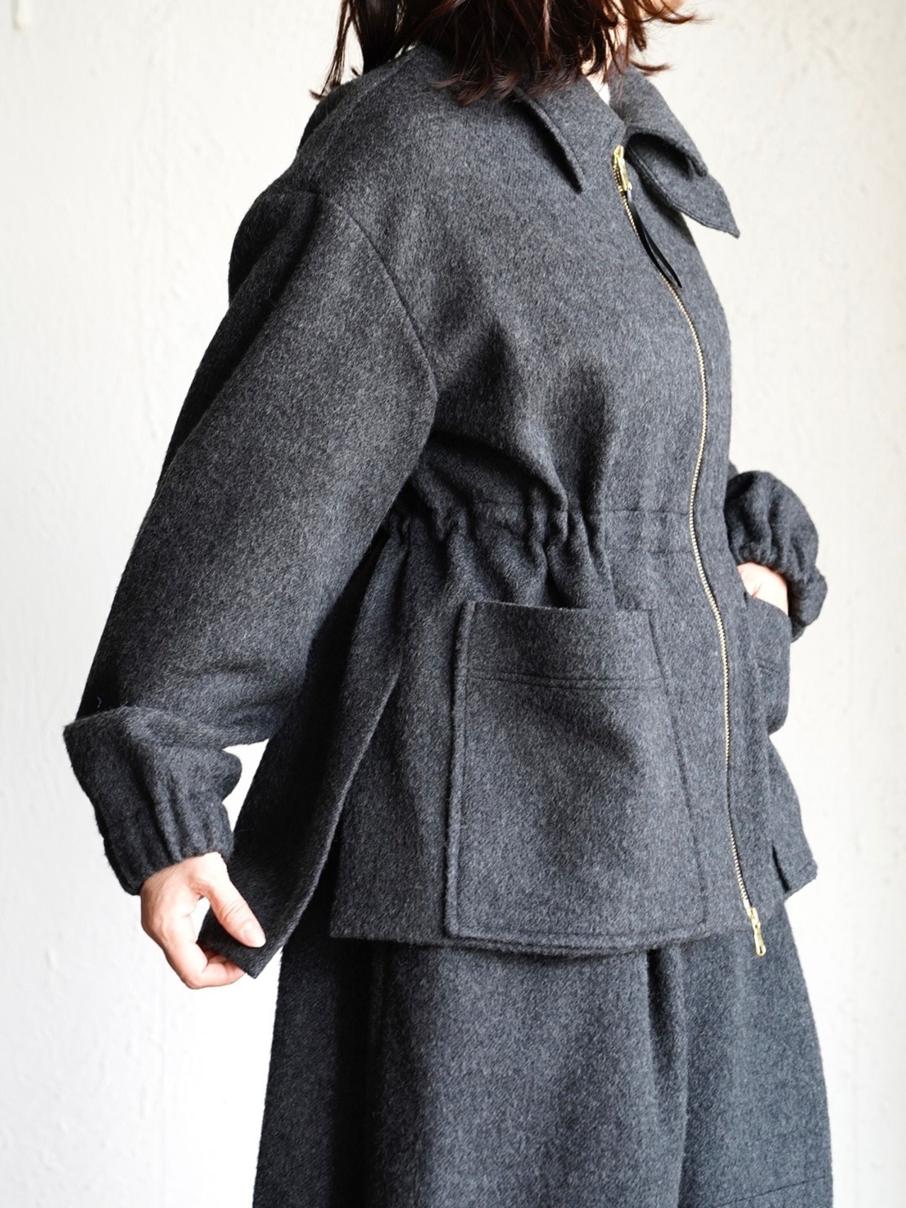 ボックスシルエットでウエストのスピンドルでシルエットが調整できます。
