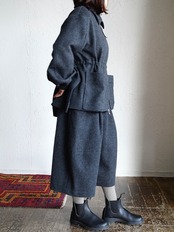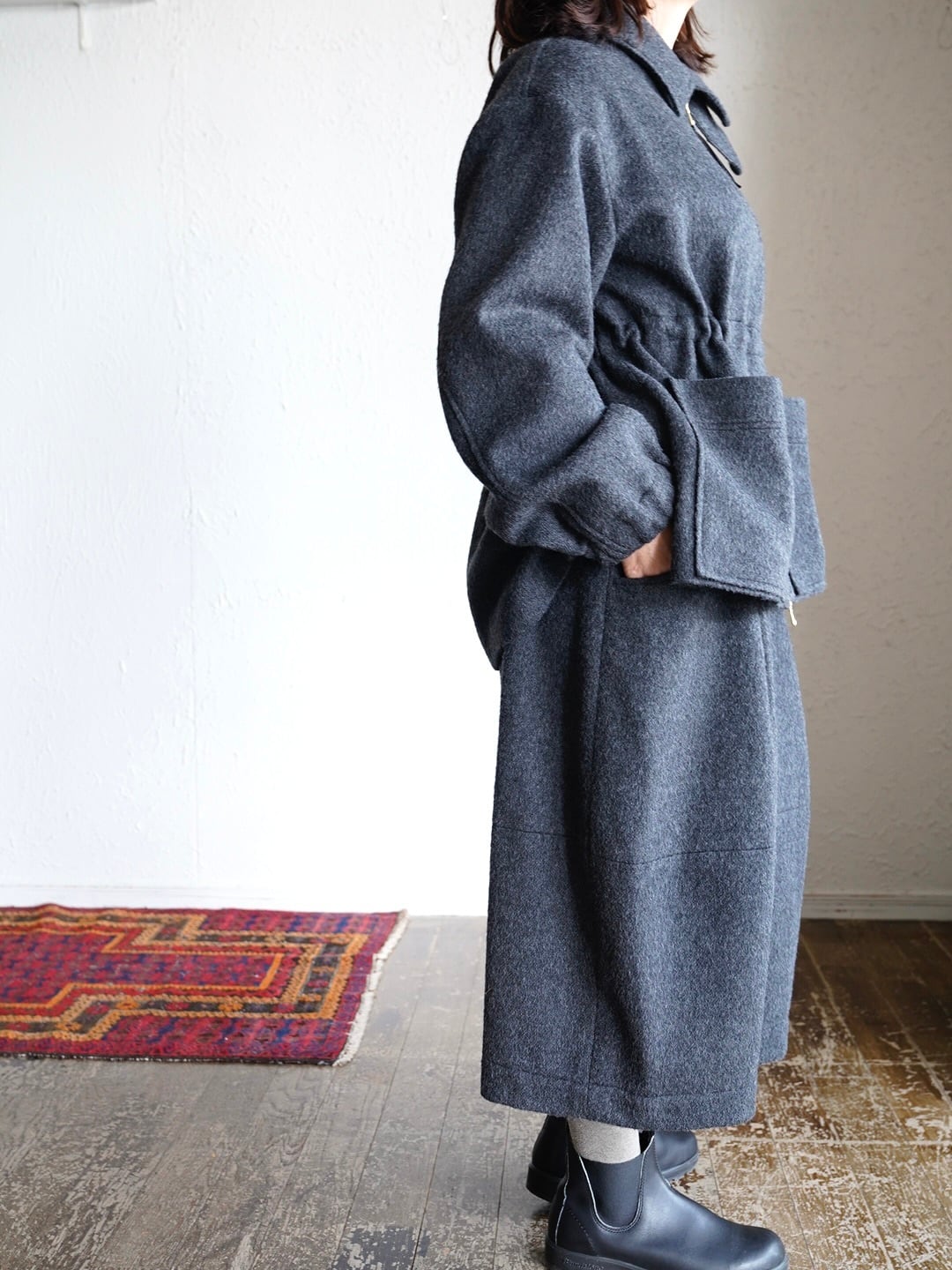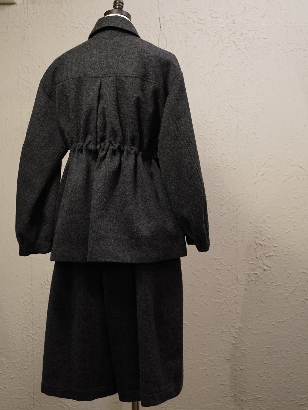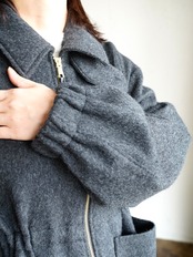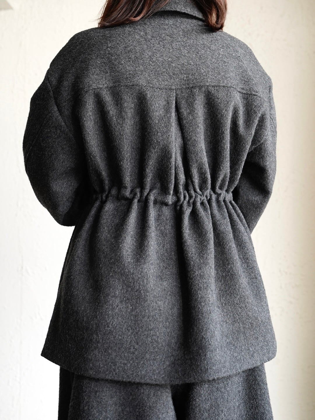 ボックスシルエットでウエストのスピンドルでシルエットが調整できます。