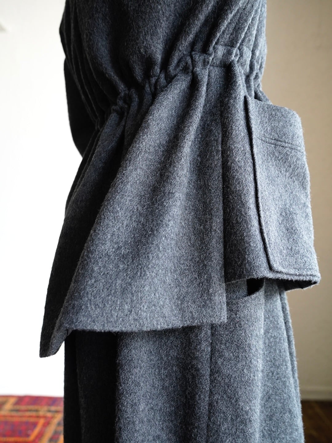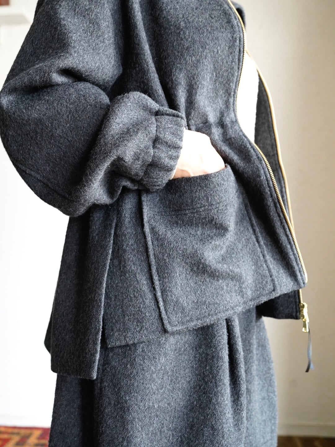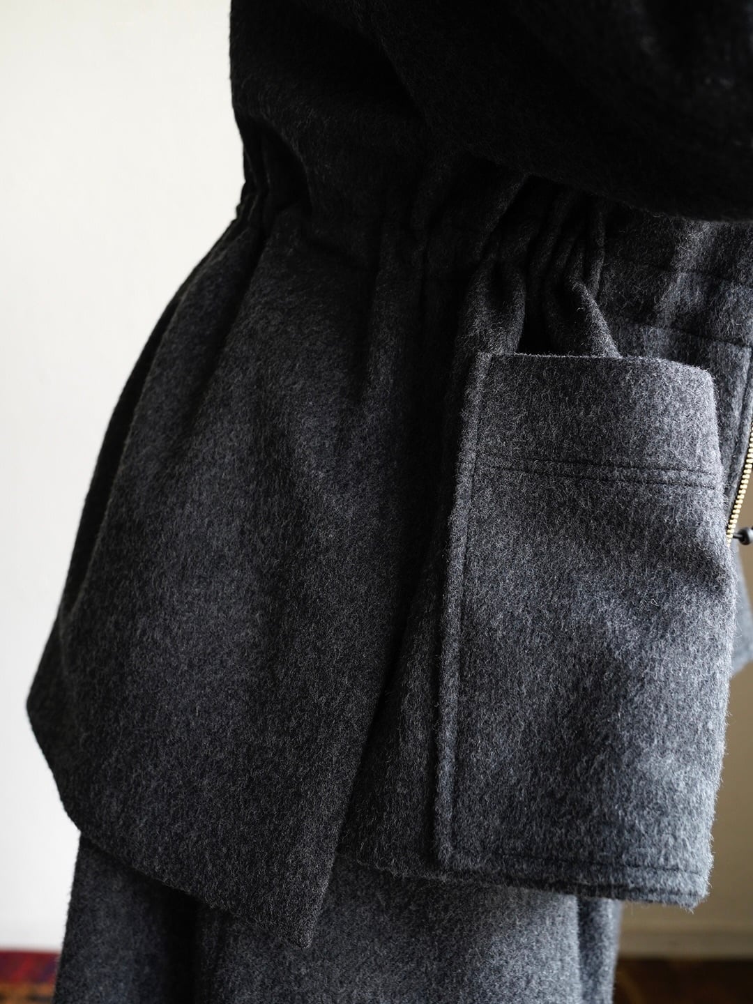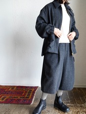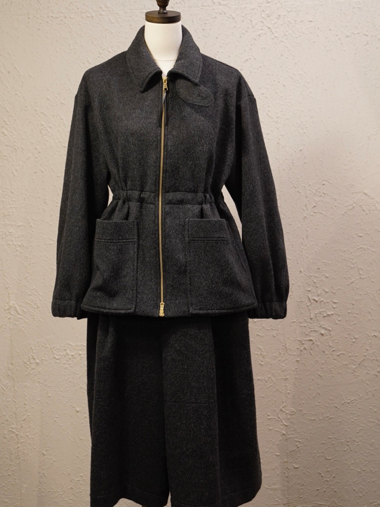 ボックスシルエットでウエストのスピンドルでシルエットが調整できます。
