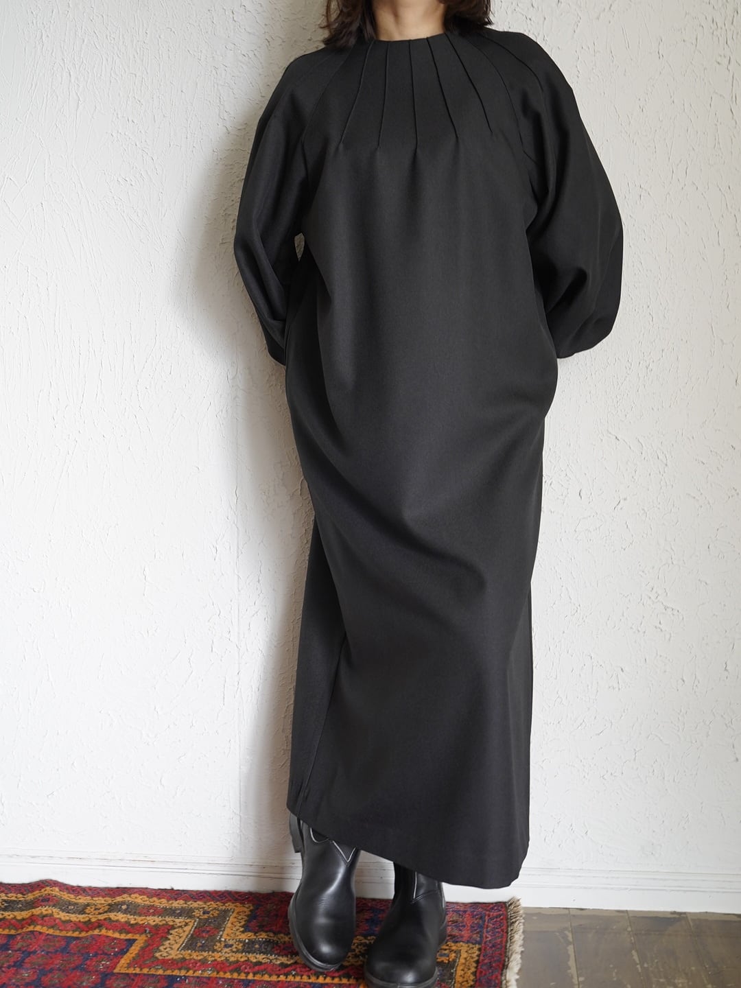 カジュアルにもフォーマルにも対応が可能なワンピース。シンプルながら、さりげなく主張する、一枚持っていると汎用性が高いアイテム。シワになりにくく、お手入れも簡単。滑りの良い裏地は暖かく、着心地の良さを向上させます。アクセサリーや小物、羽織る物によっても様々な表情をみせる着回し力の高いワンピースです。