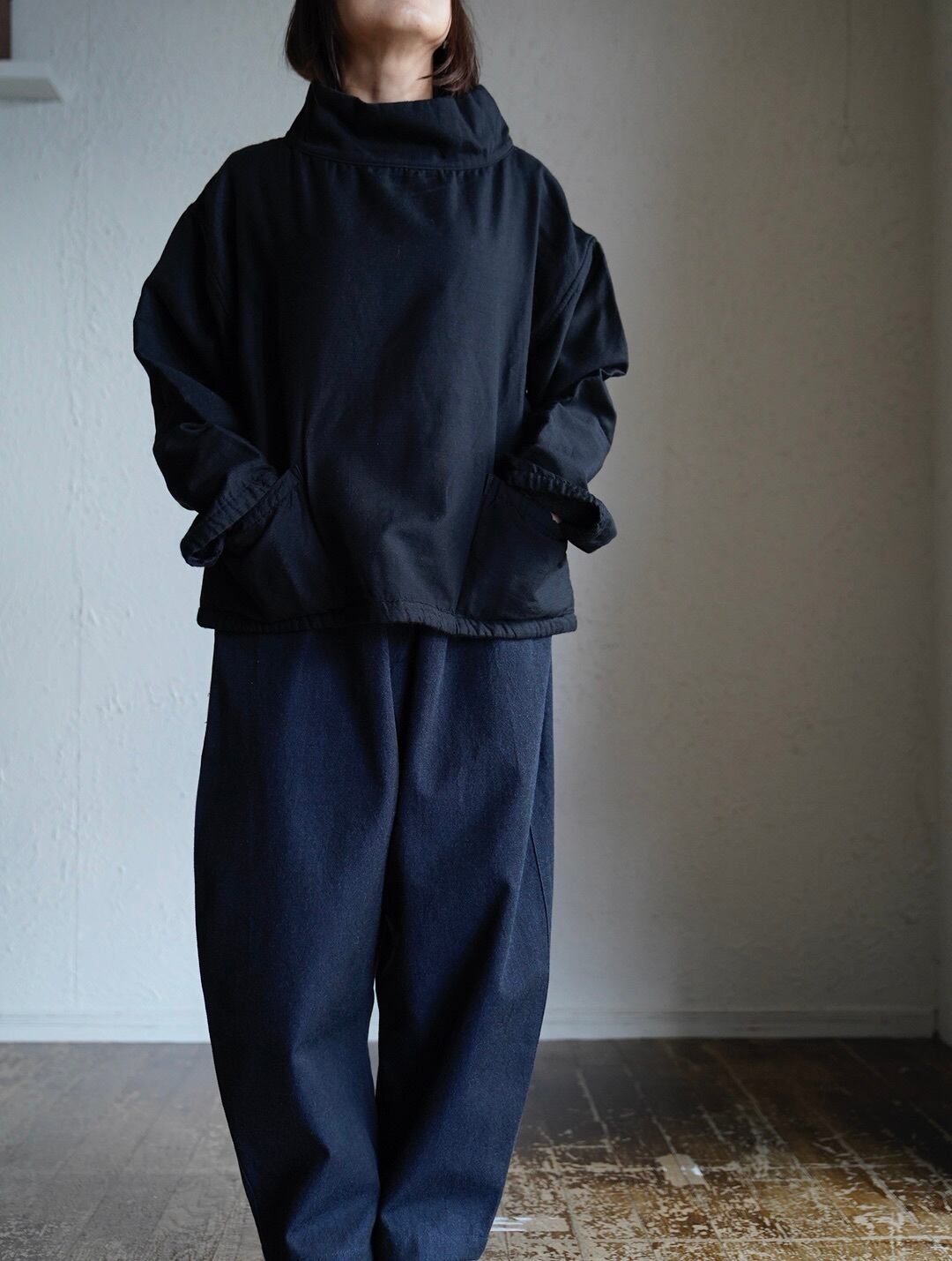 パターンはもんぺやたっつけを参考にしたMITTANの定番的なシルエットのパンツです。股上は深いものの、運動量を確保しているので動きやすいのが特徴で、膝から裾にかけて入っている急なテーパードは、ロールアップによって調整が可能です。機能性を備えながらもシンプルなデザインの為、体型を問わず好みのサイズ感を選んでいただけます。後ろポケットは、切り替えを利用した仕様になっています。