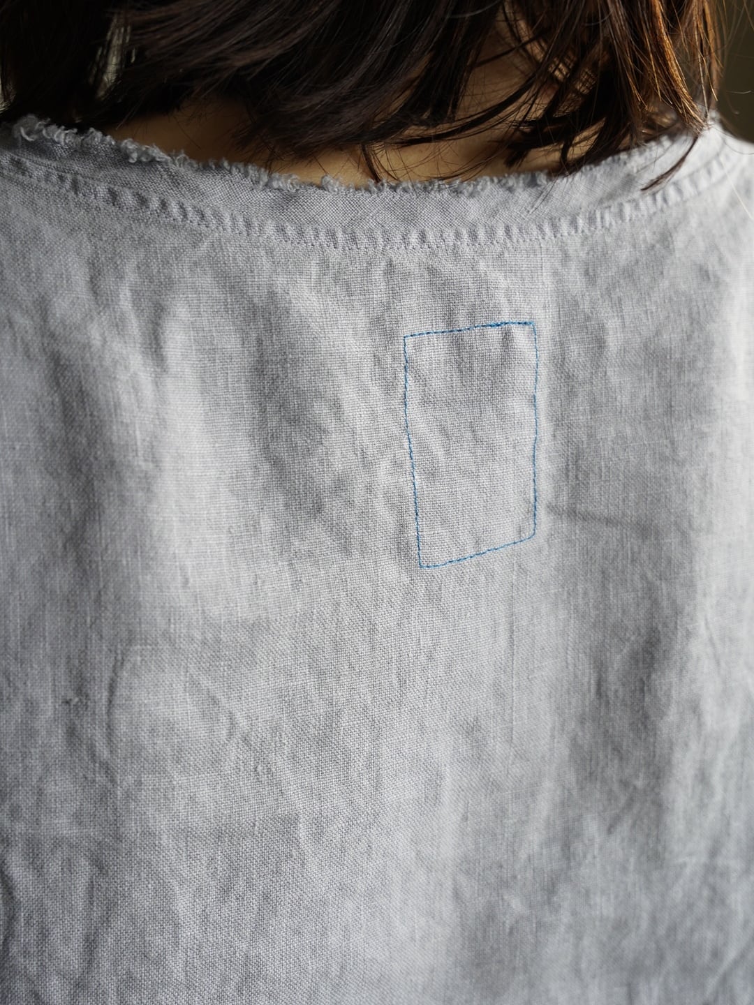 一緒に染めたリネンの共生地のブランドネームは、ステッチ糸がポイントにもなりつつ、
