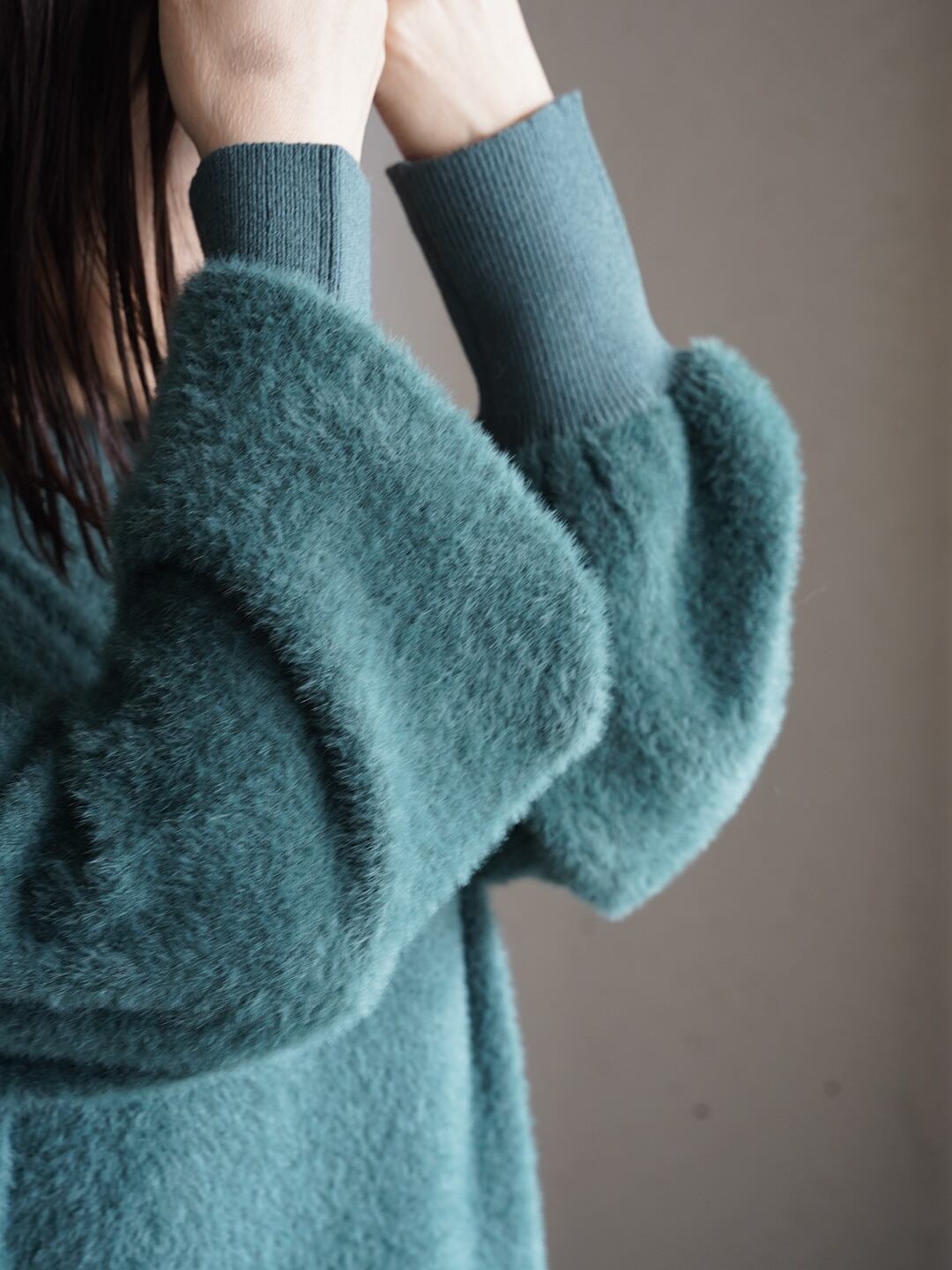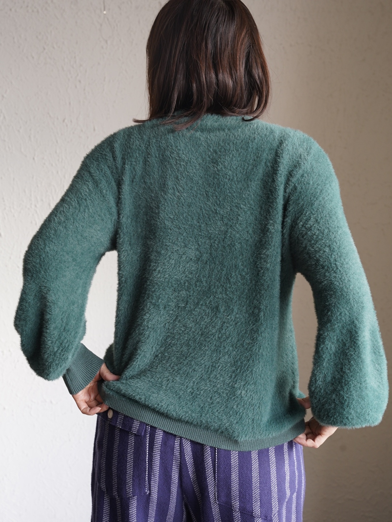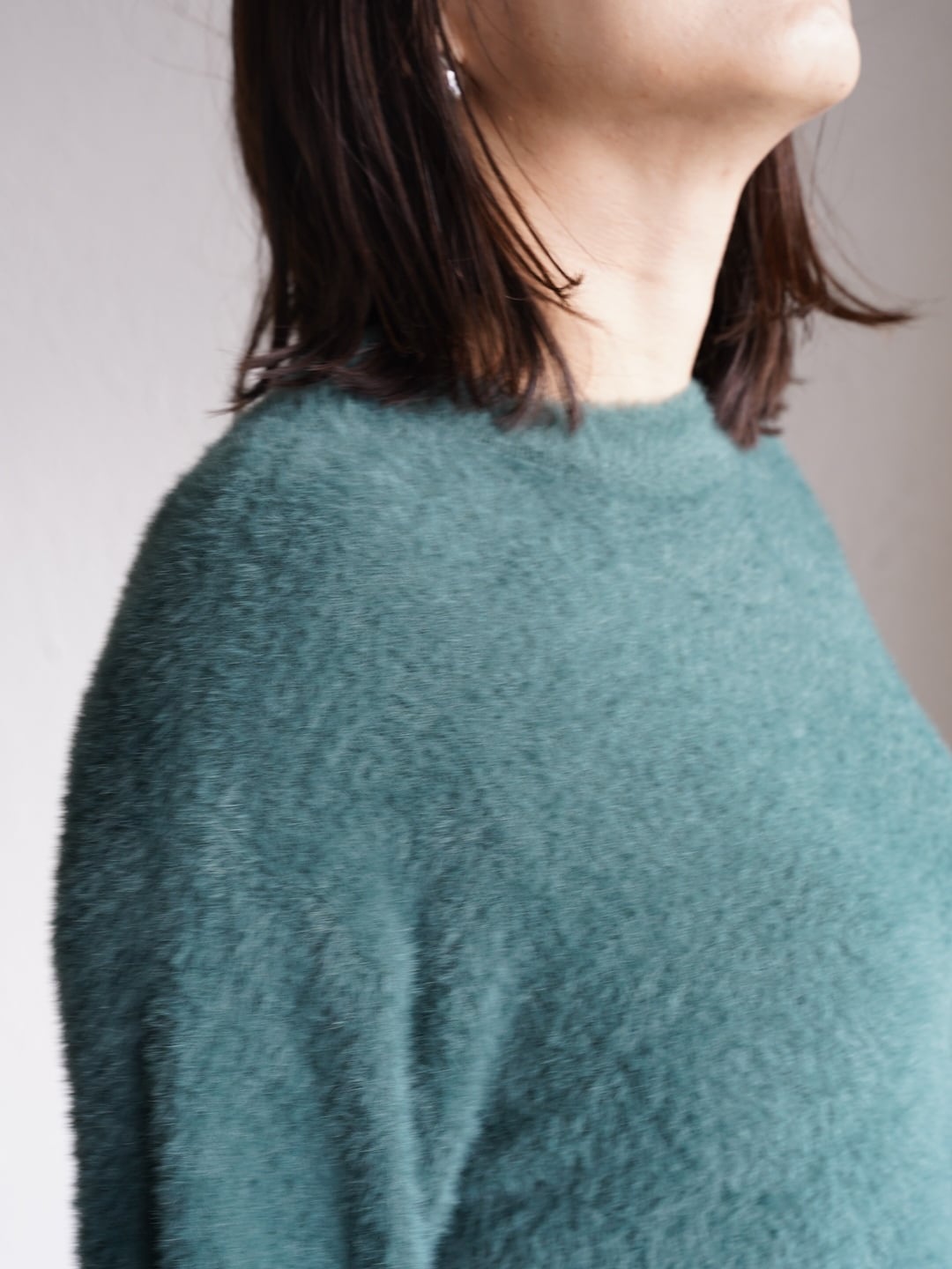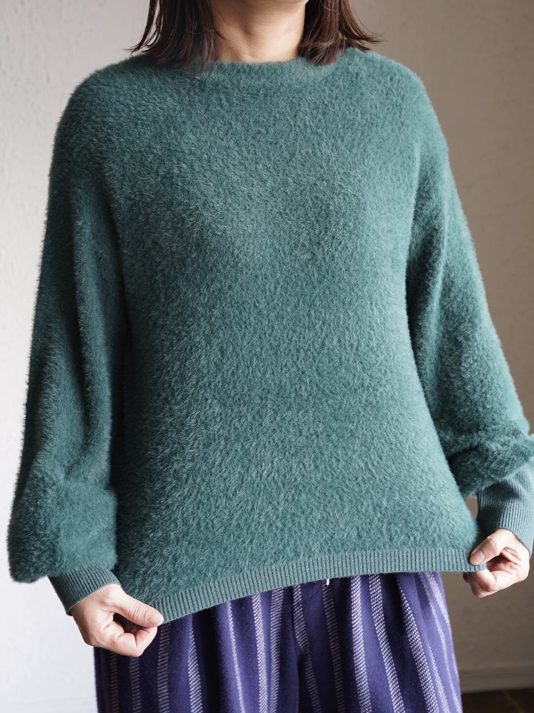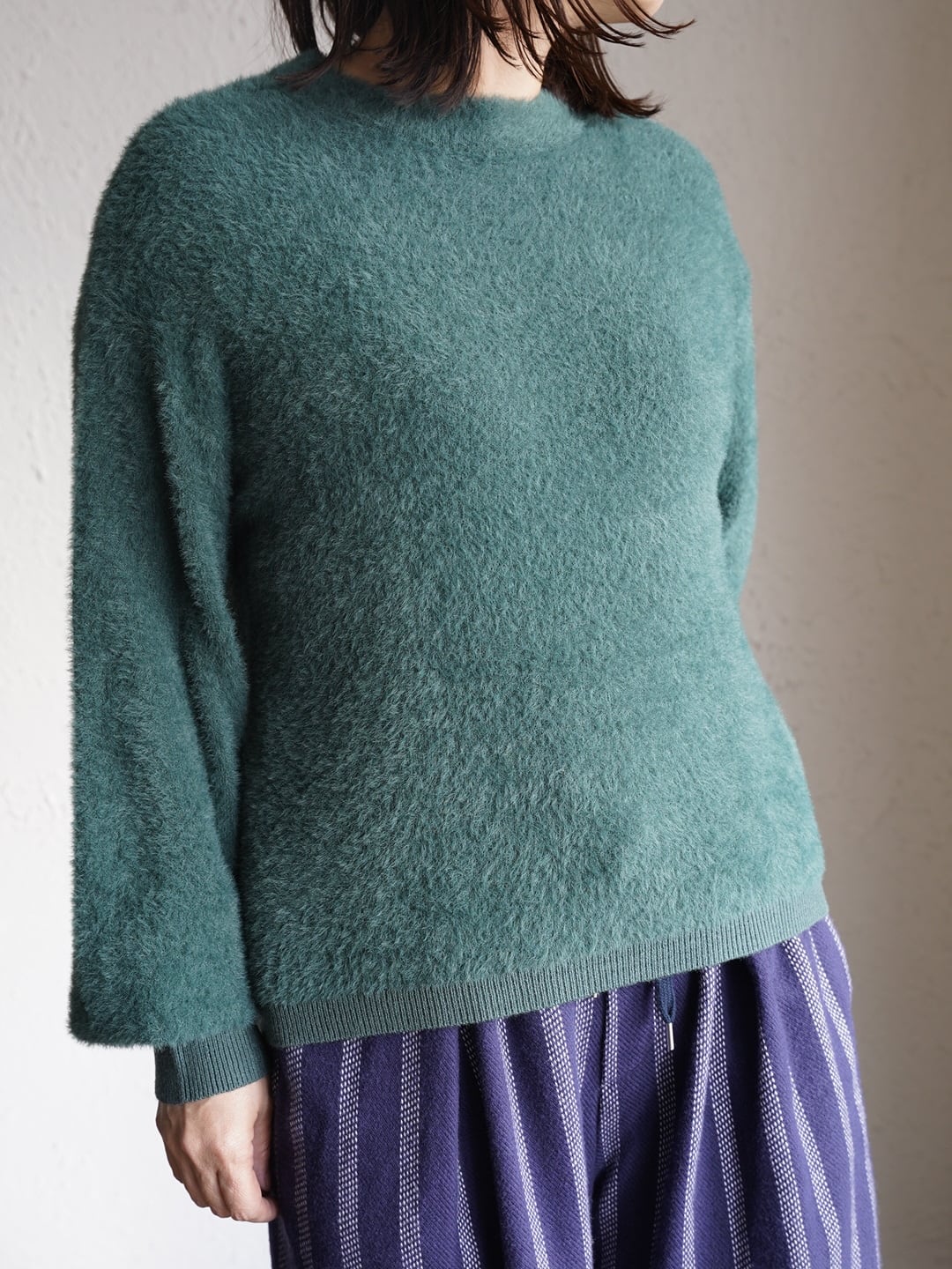 軽くてあたたかい着心地のシャギーニット。空気を含みやすい素材感のため、見た目以上に軽く、保温性に優れています。シンプルなシルエットでも毛足のある素材感がアクセントになり、1枚で着映えするアイテム。チクチク感がでにくいので、リラックスして着用できます。フェミニンからカジュアルまで、スカート、デニム、ワイドパンツにと幅広い着こなしが可能です。