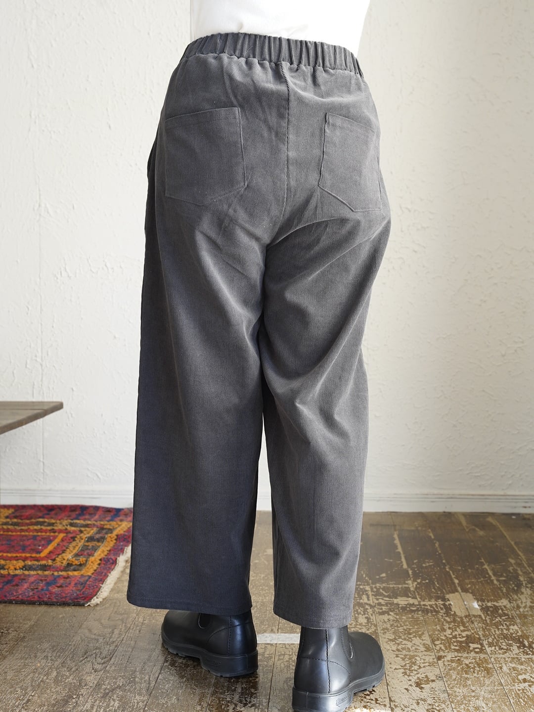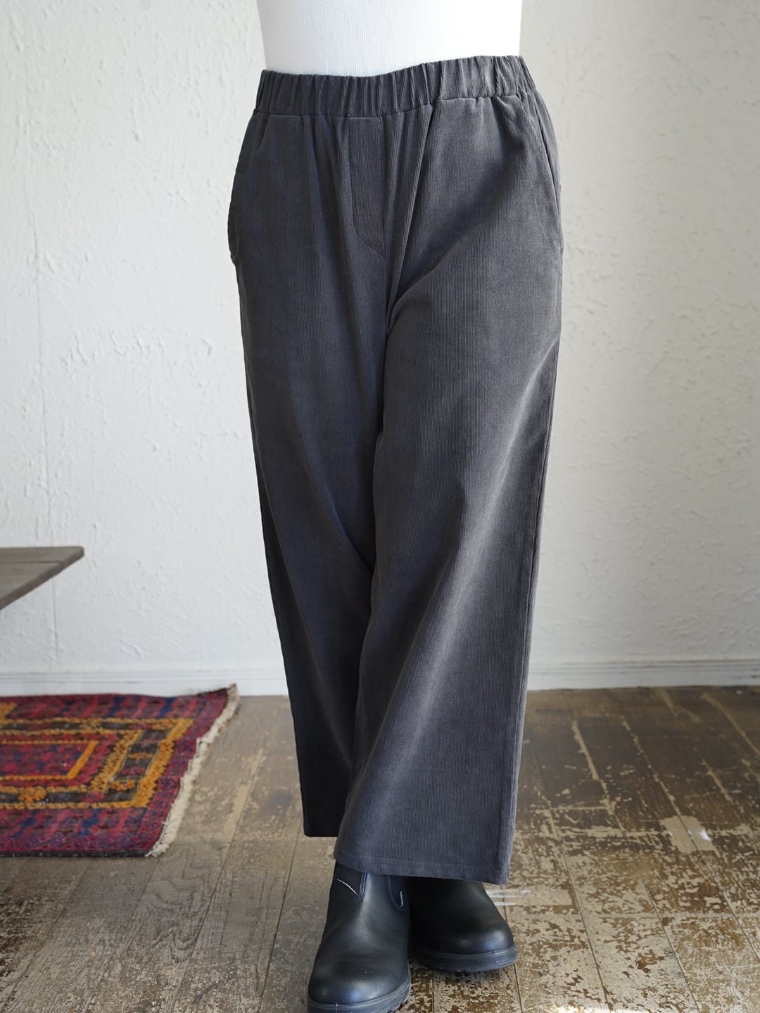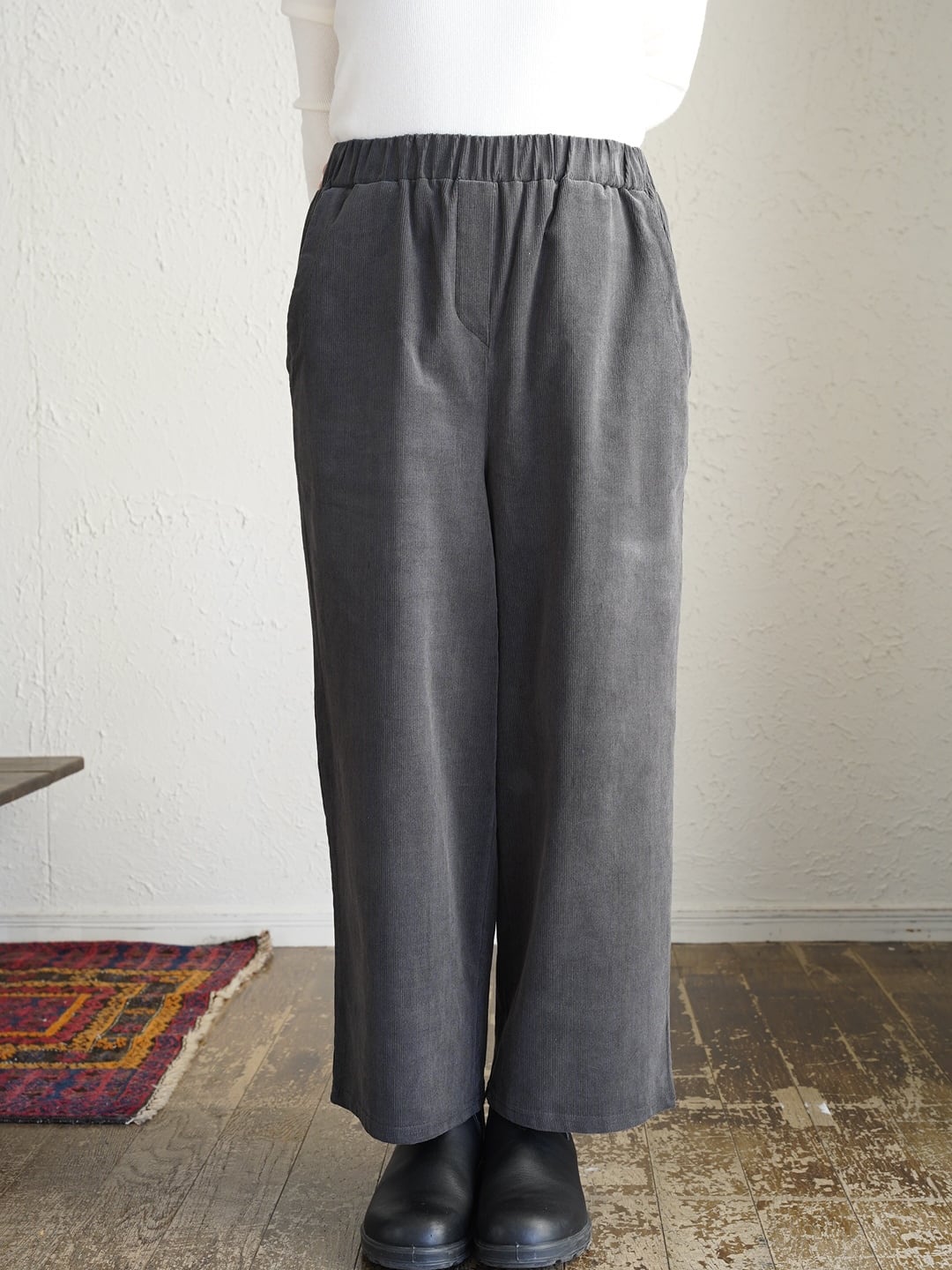 ウエストゴムで楽な履き心地。ニットやスウェットを合わせて季節感のあるコーデや、ブーツやスニーカーでカジュアルや上品コーデにもおすすめのパンツです。