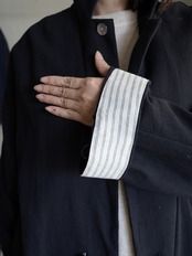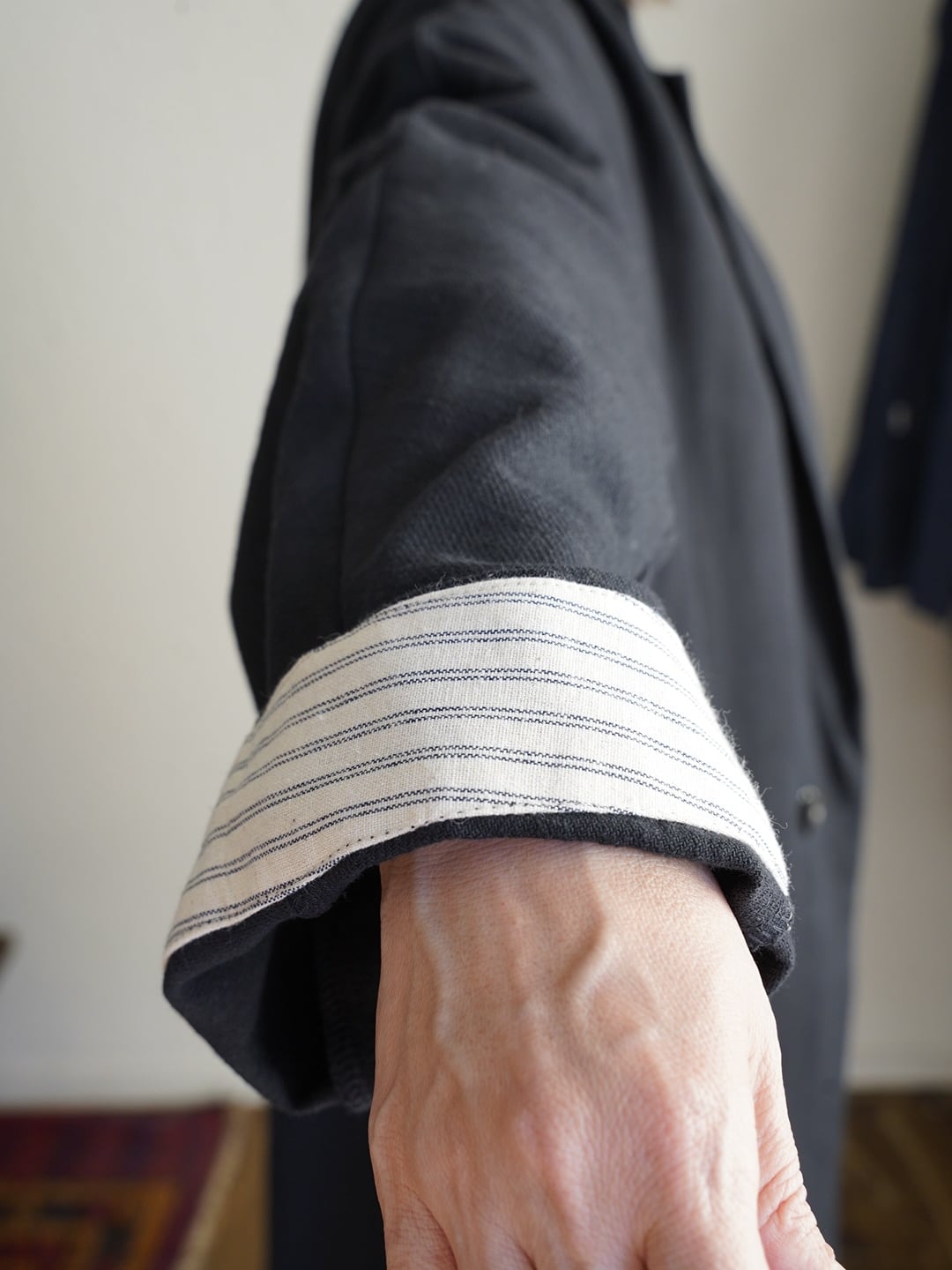 襟と袖口の裏地にはストライプ地が使われており、折り返してさりげないアクセントになります。