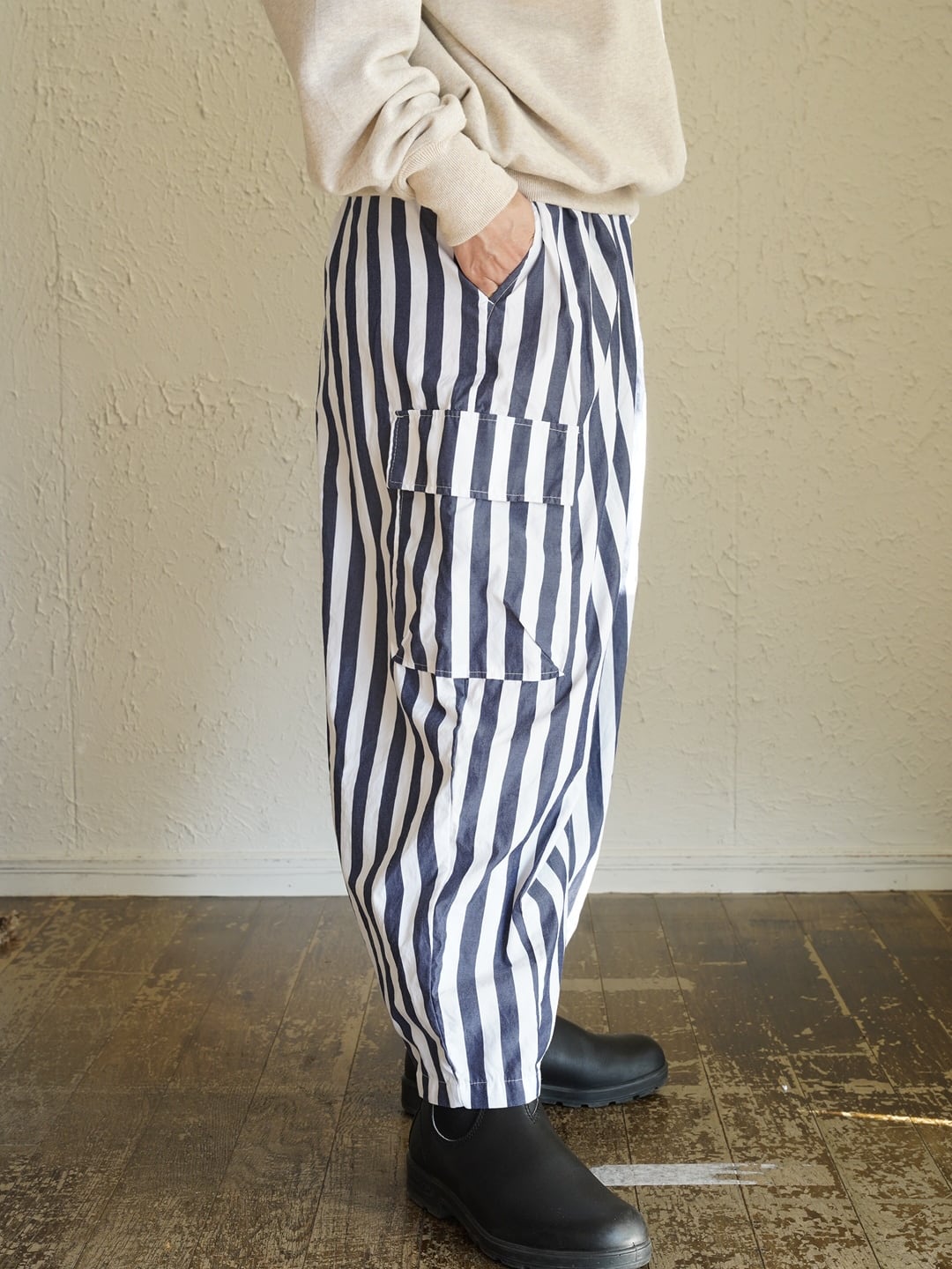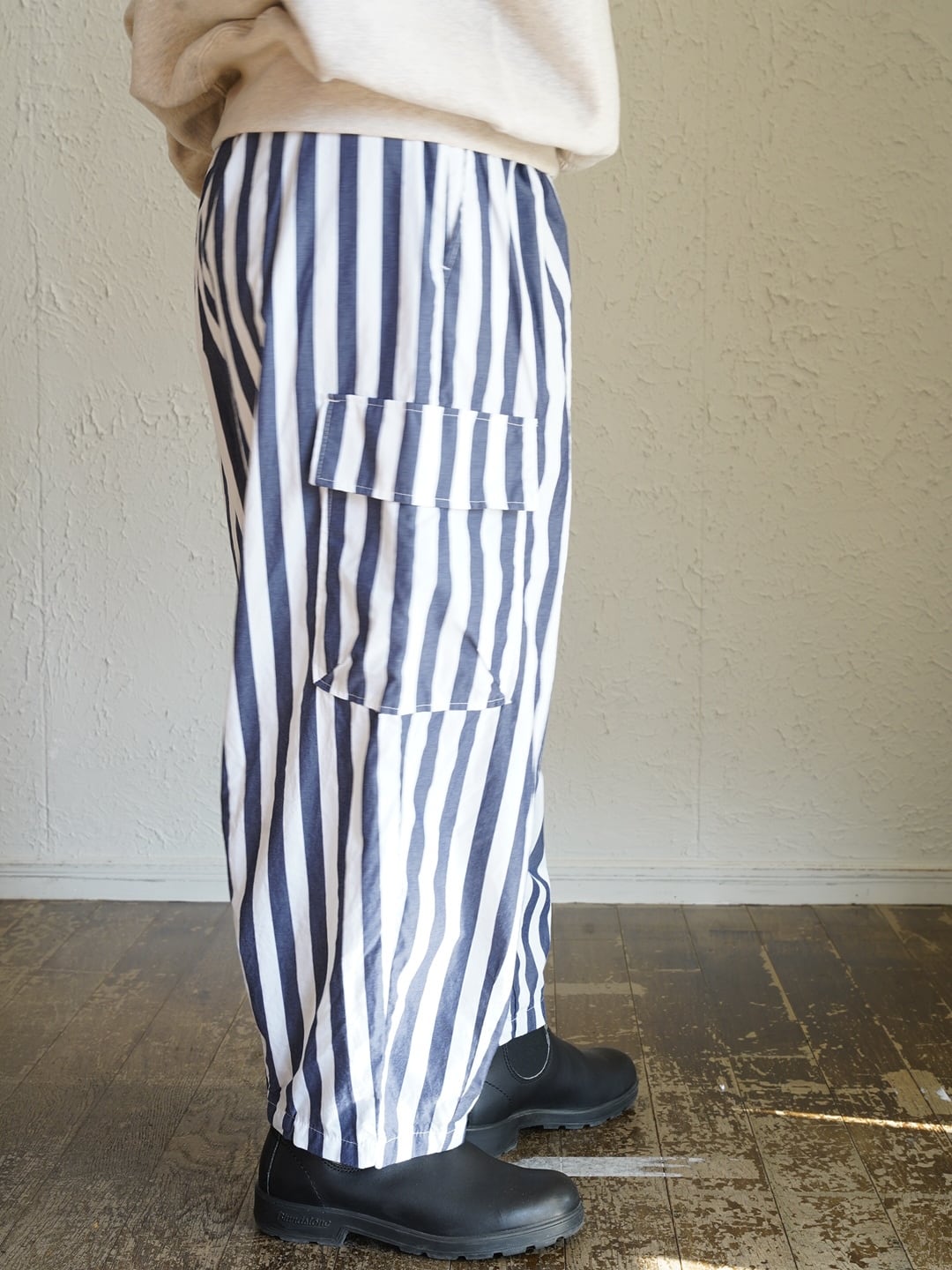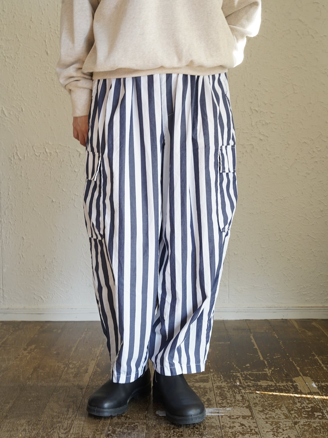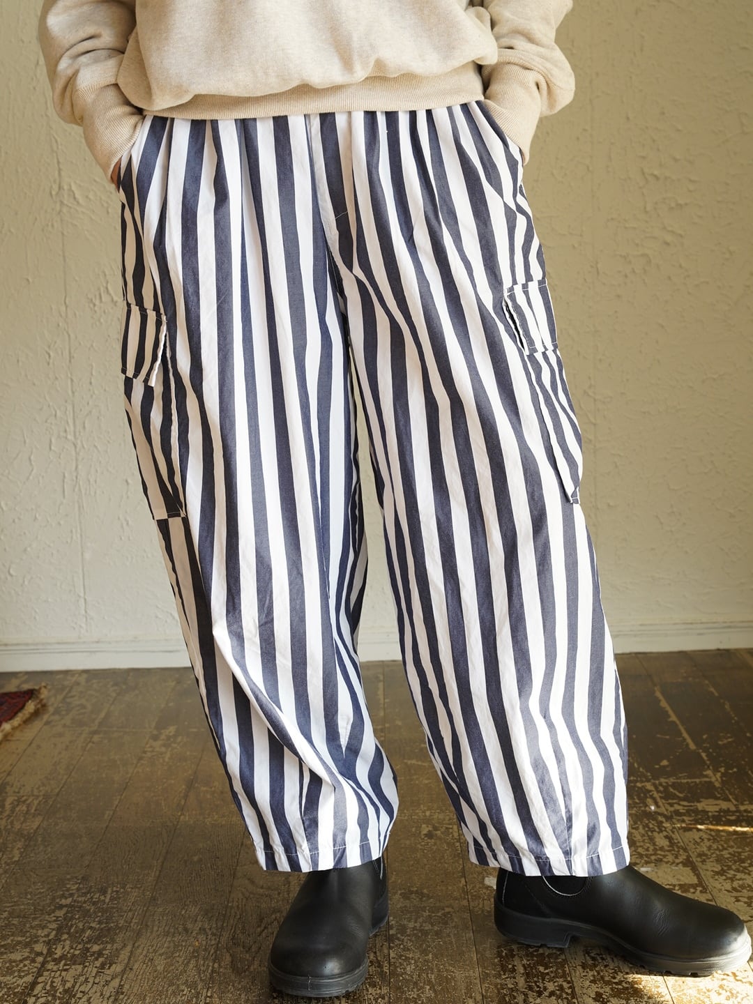 両サイドにカーゴポケットが付き、収納性とよど良い立体感。ウエストはリラックス感のあるゴム仕様。しっかりとしたコットン素材でストライプ柄が軽やかで爽やかさを演出。