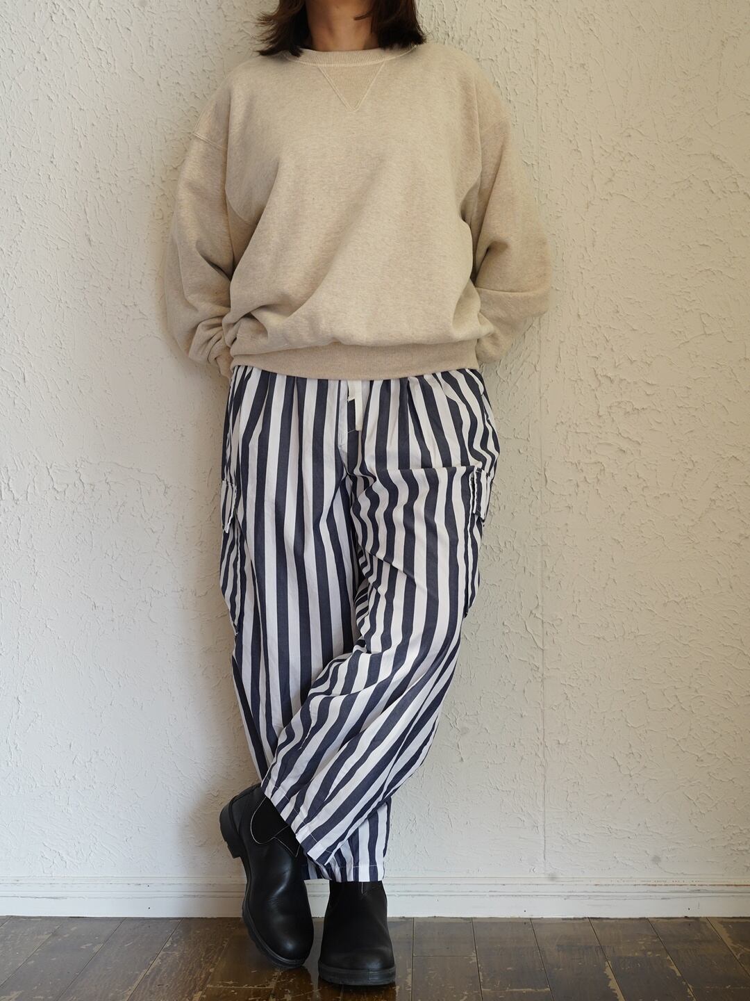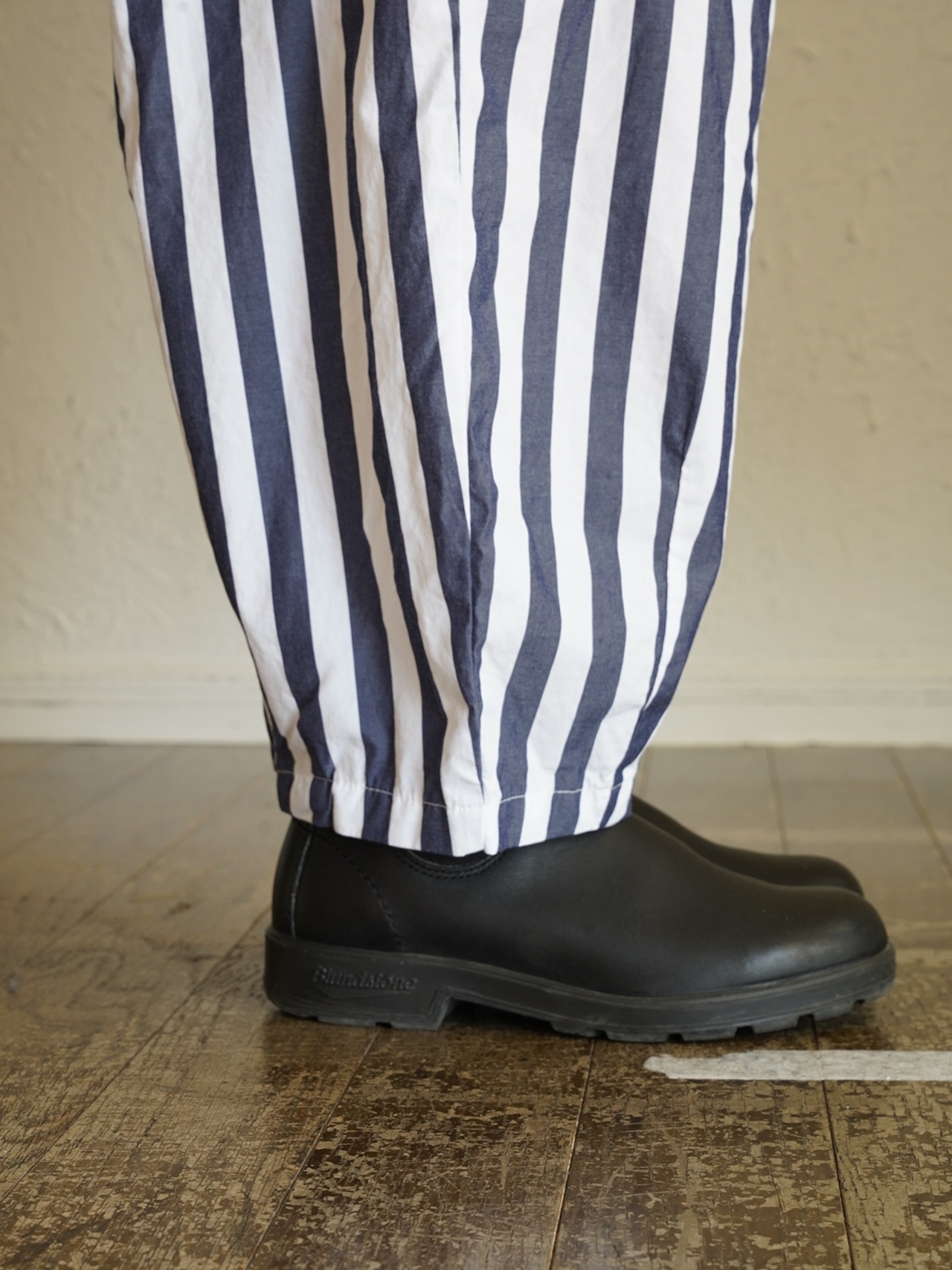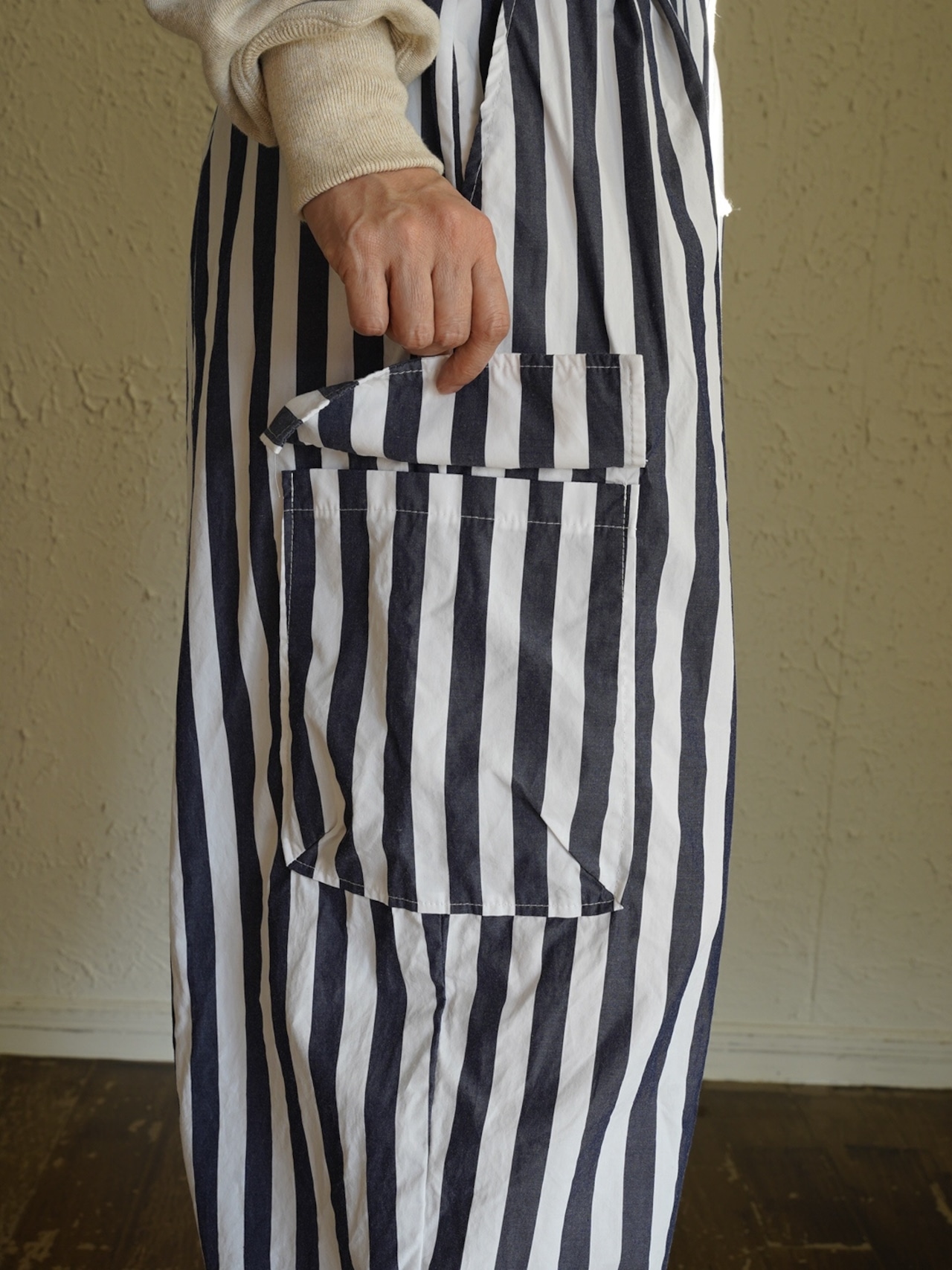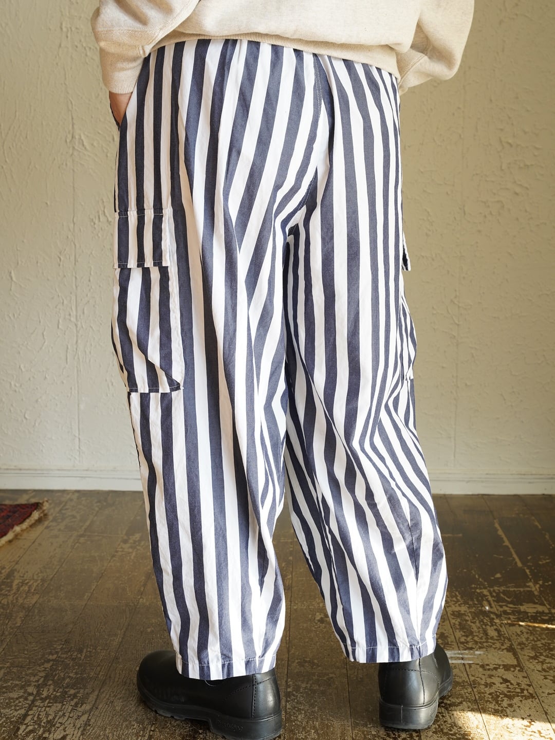 両サイドにカーゴポケットが付き、収納性とよど良い立体感。ウエストはリラックス感のあるゴム仕様。しっかりとしたコットン素材でストライプ柄が軽やかで爽やかさを演出。