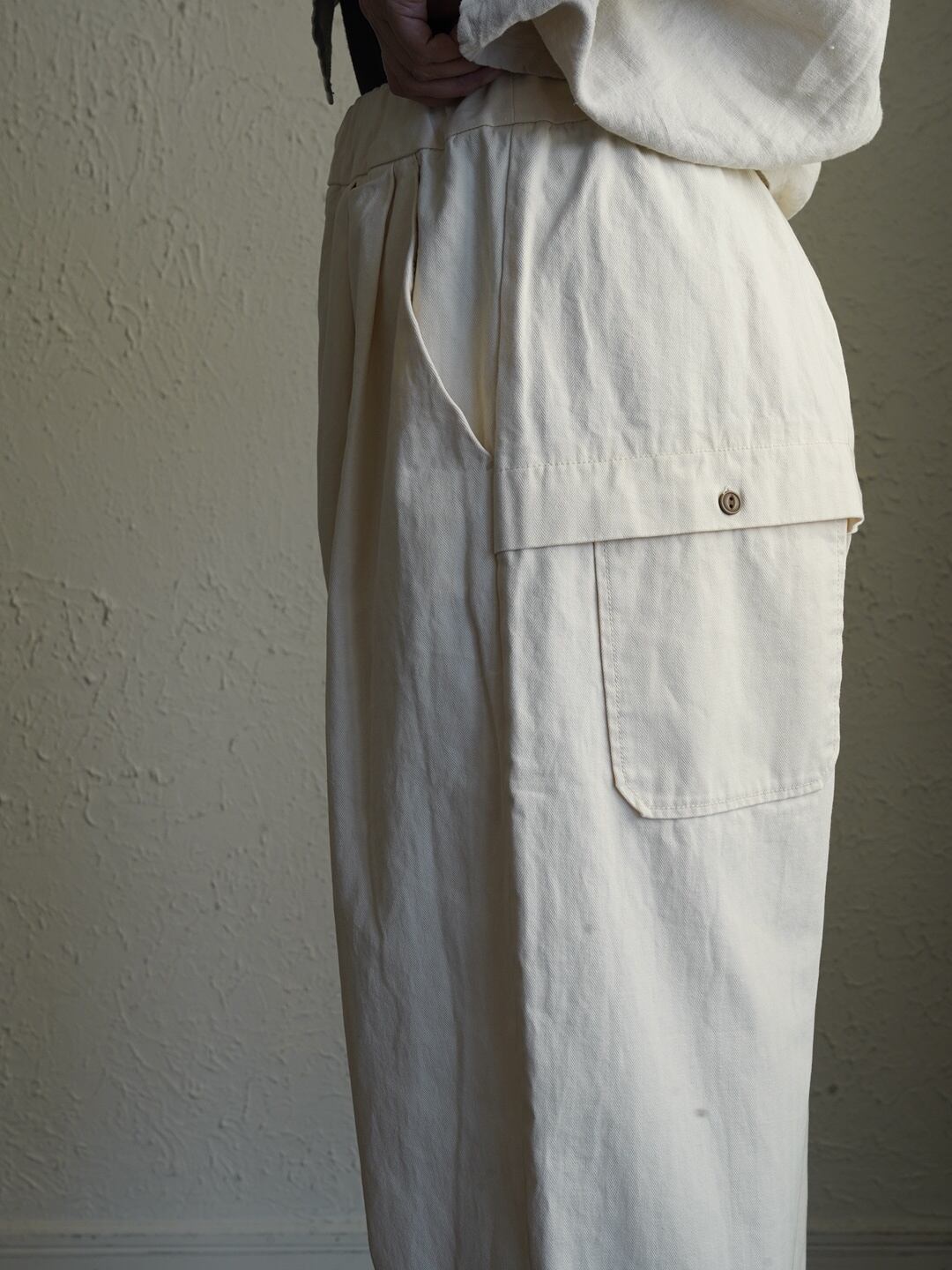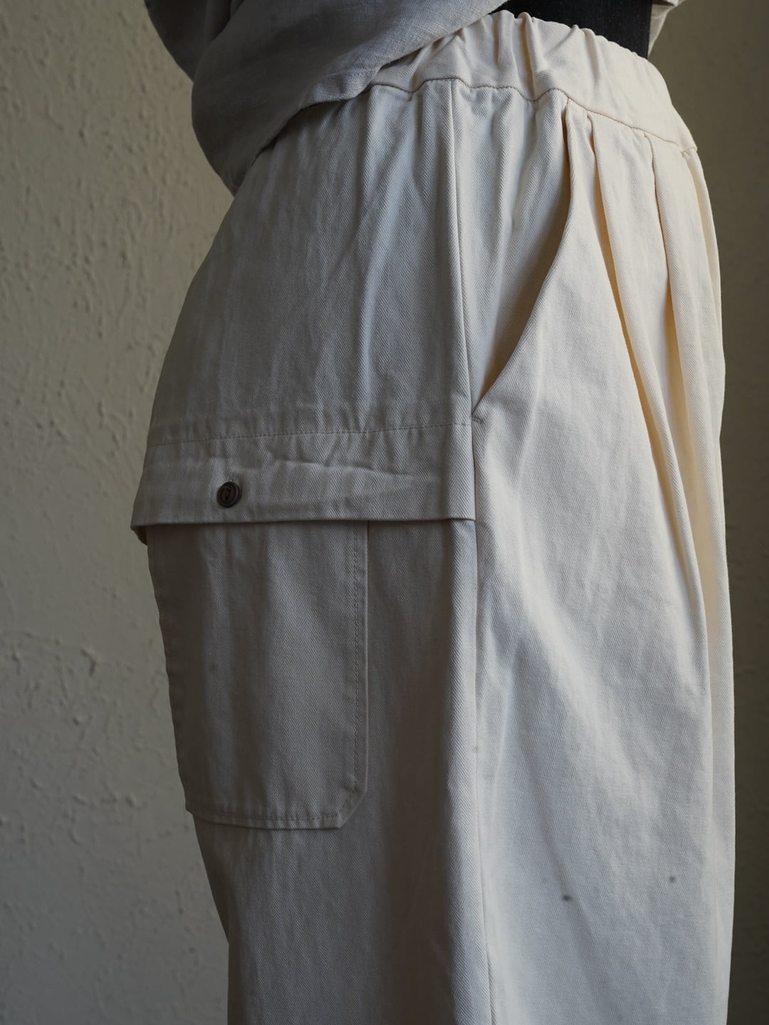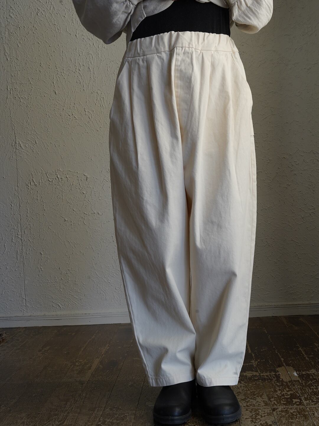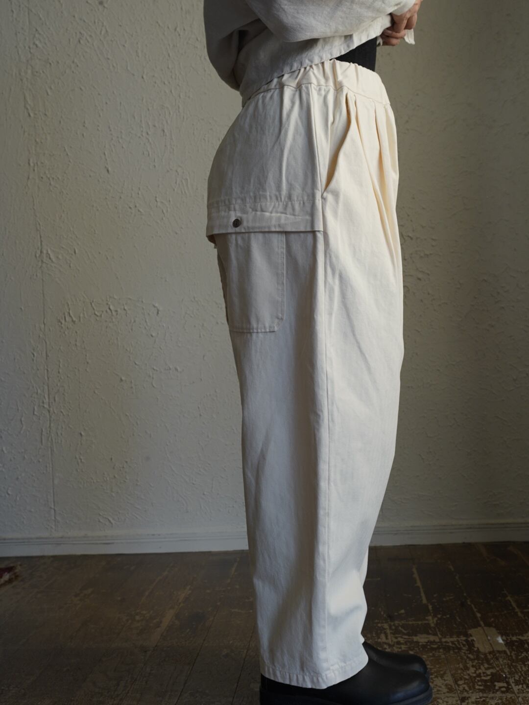 少しハリのある中厚程度のしっかりとしたコットン生地。タック入りでゆったり感のあるシルエット。ヘリボーン柄がさりげなくコーデに奥行きと上品さをプラス。