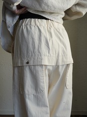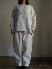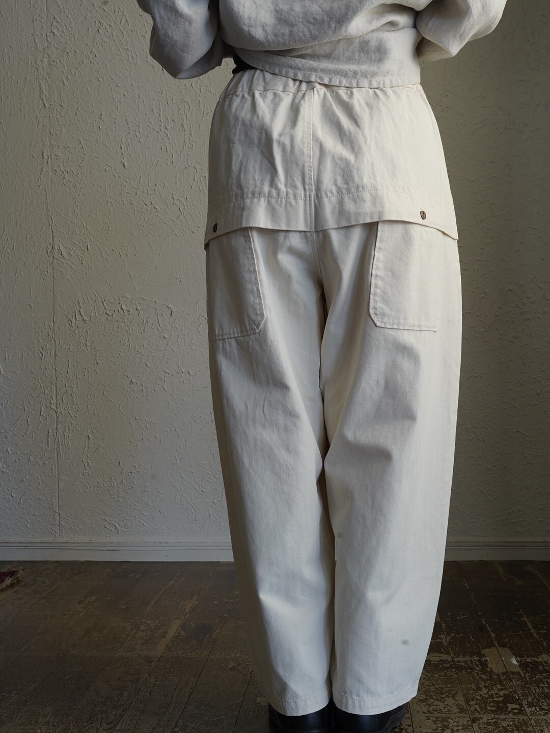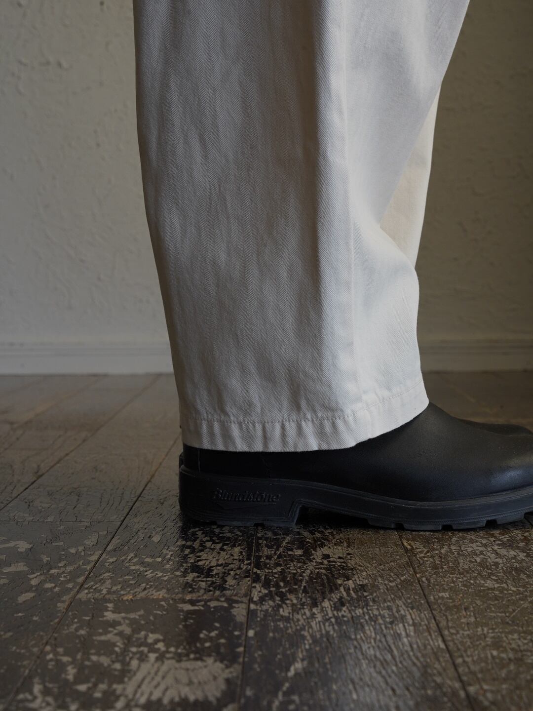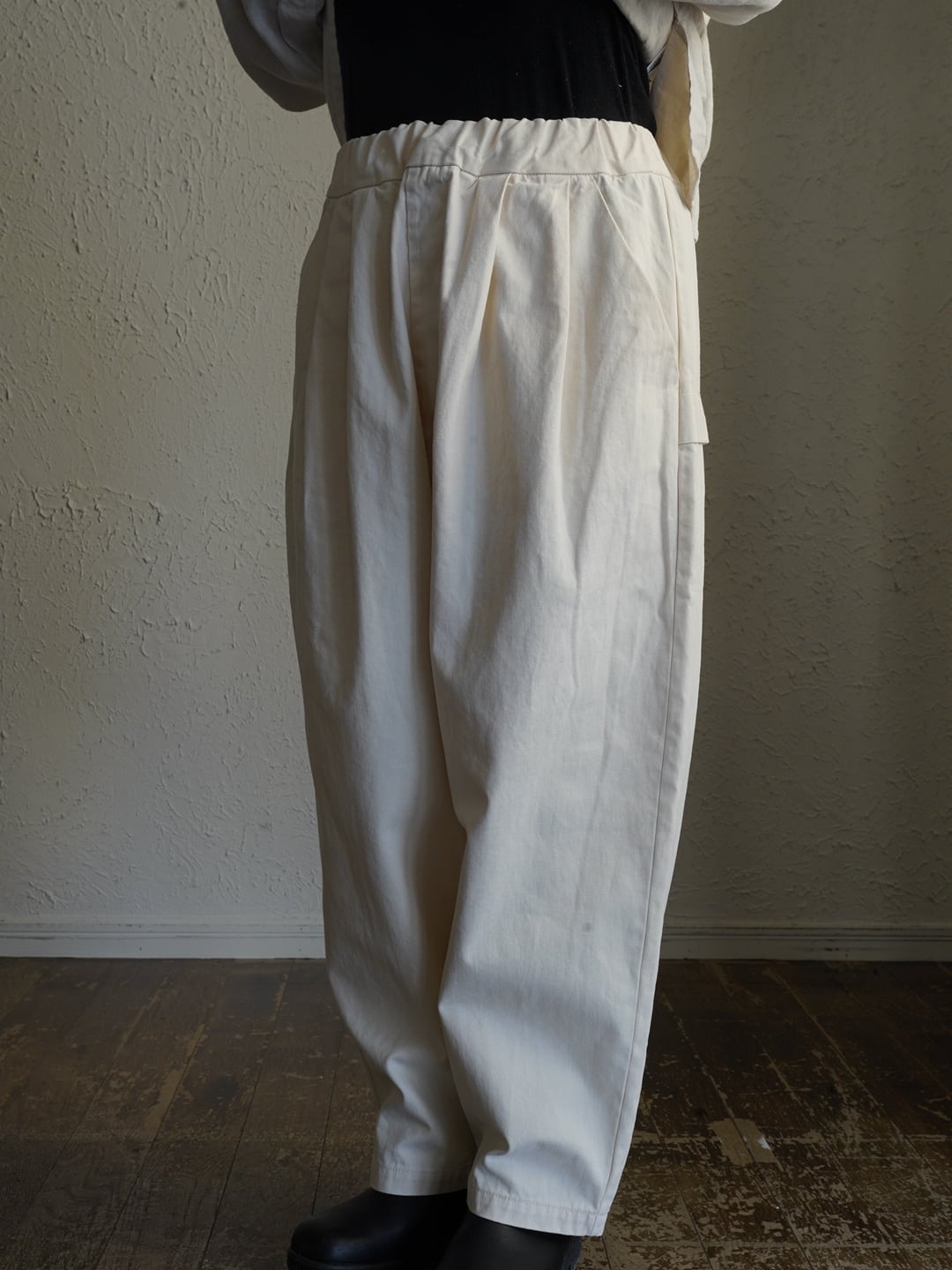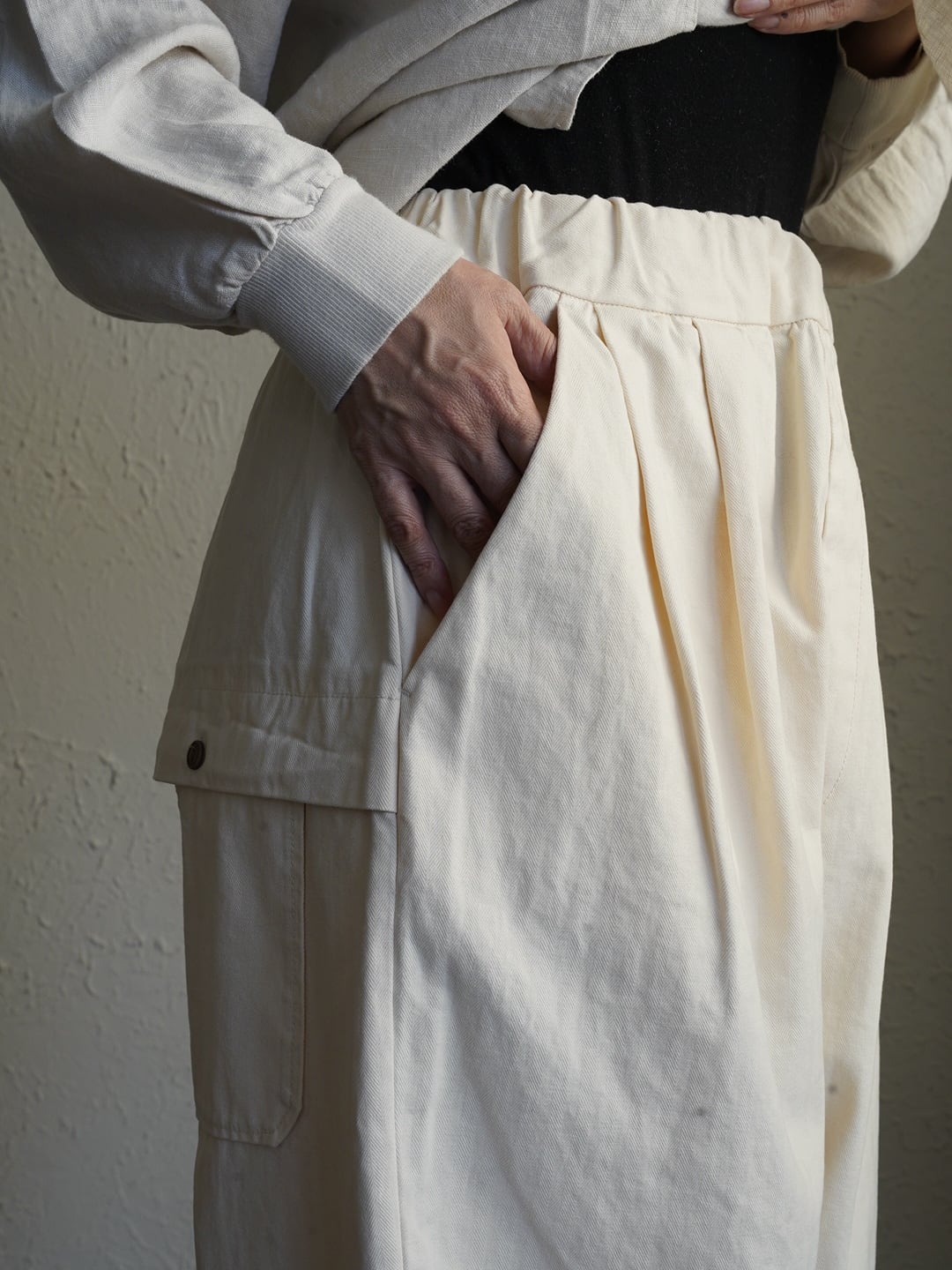 少しハリのある中厚程度のしっかりとしたコットン生地。タック入りでゆったり感のあるシルエット。ヘリボーン柄がさりげなくコーデに奥行きと上品さをプラス。