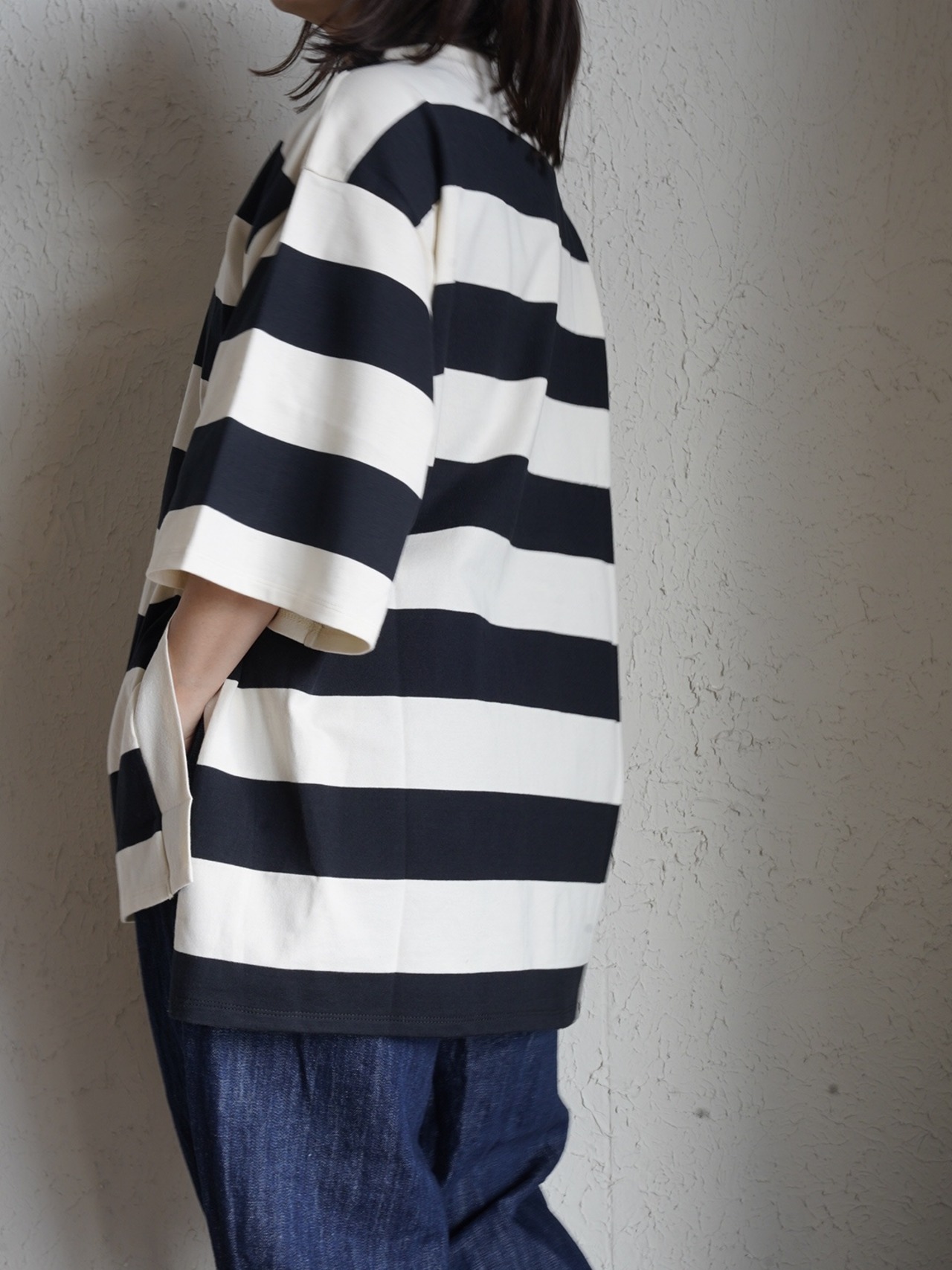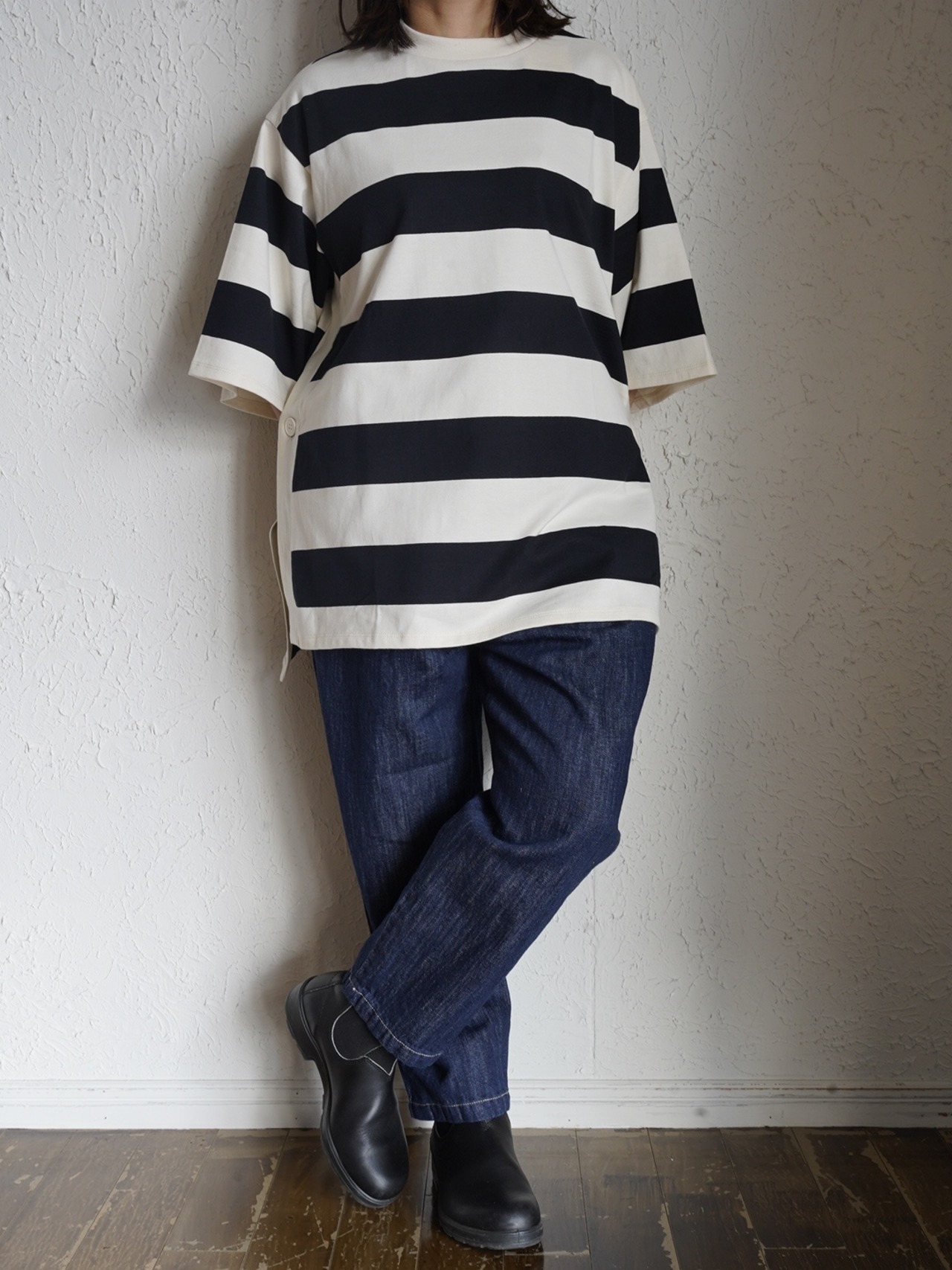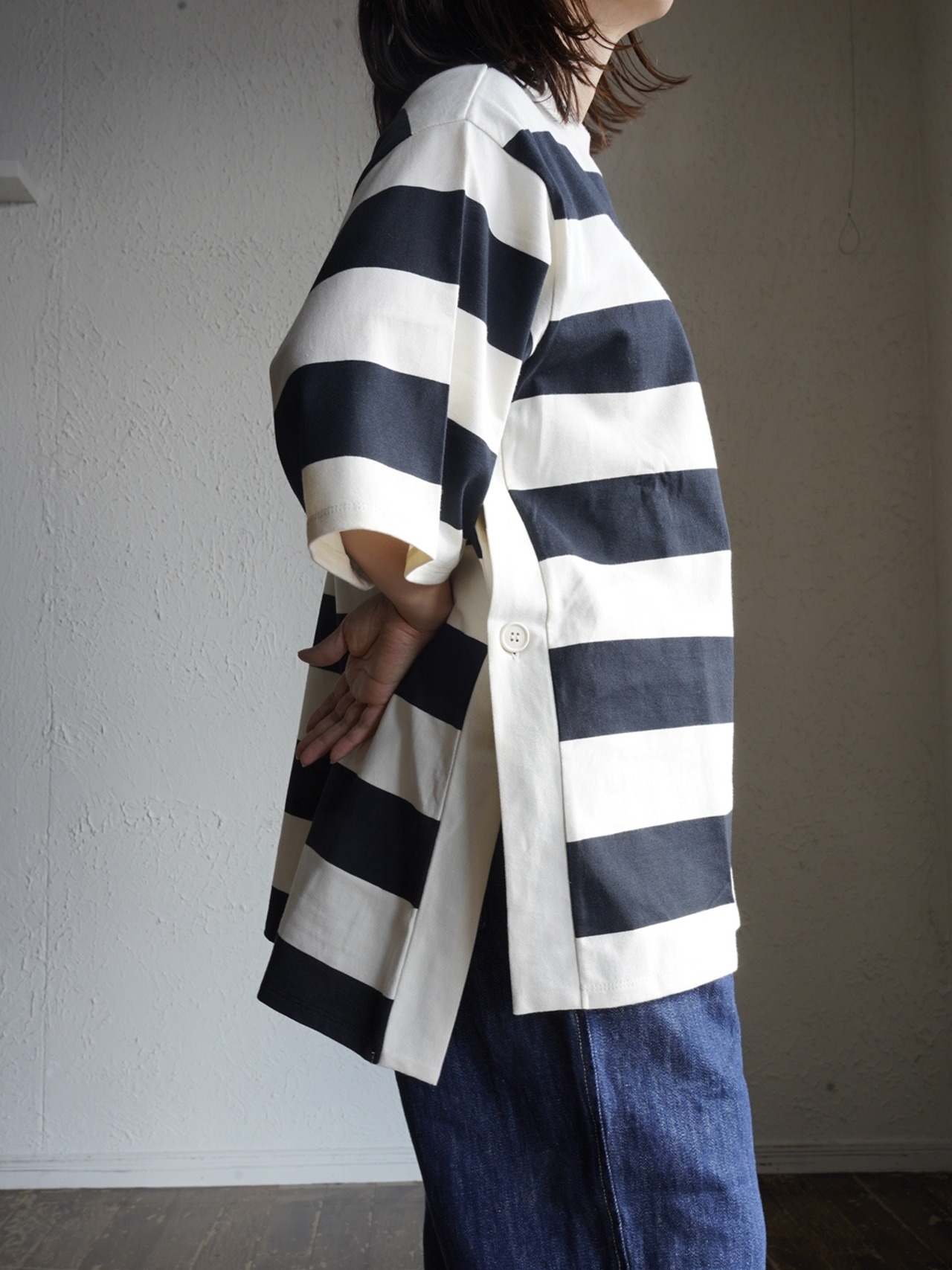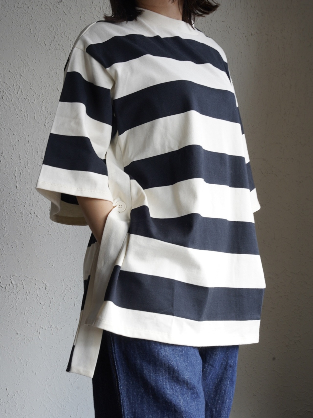 サイドスリット入りの太ボーダー・トップスは、程良い存在感があり、ゆったりめで日常に合わせやすいシルエット。サイドの切り替えスリットと、ワンポイントのボタンでメリハリを持たせつつ、縦長シルエットにすることで太ボーダーがすっきり見え。
