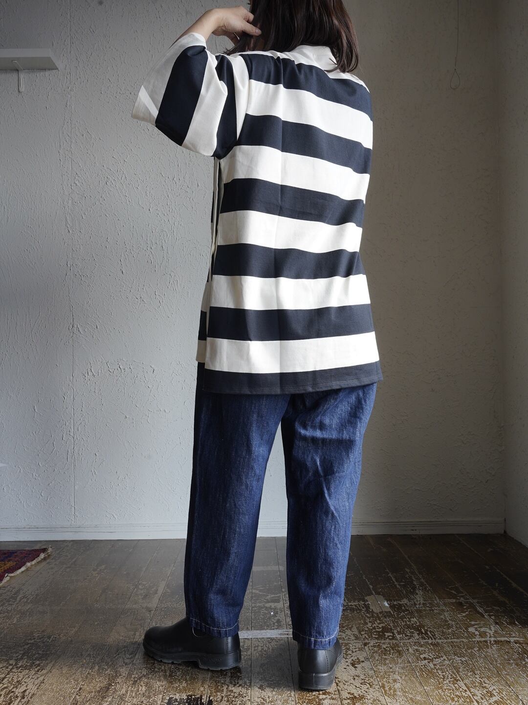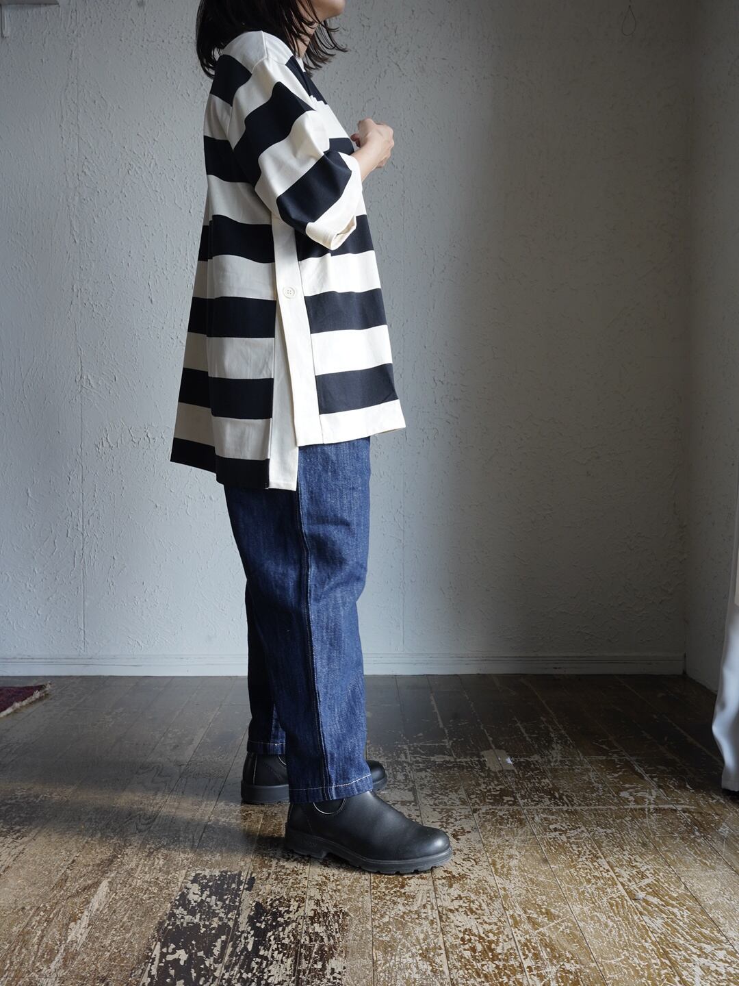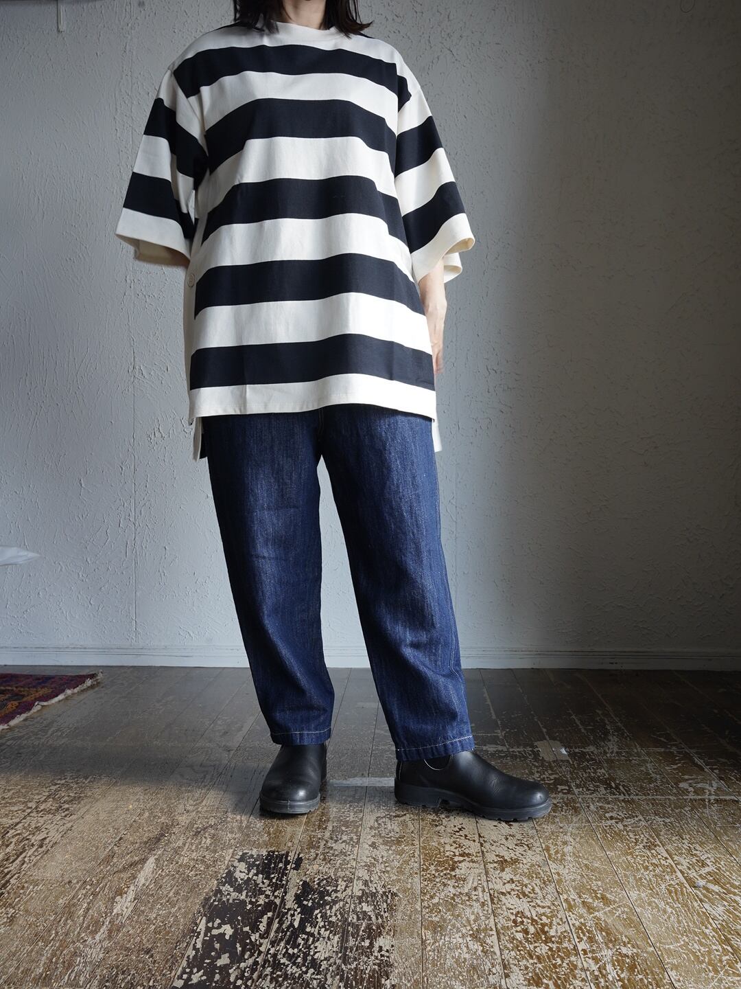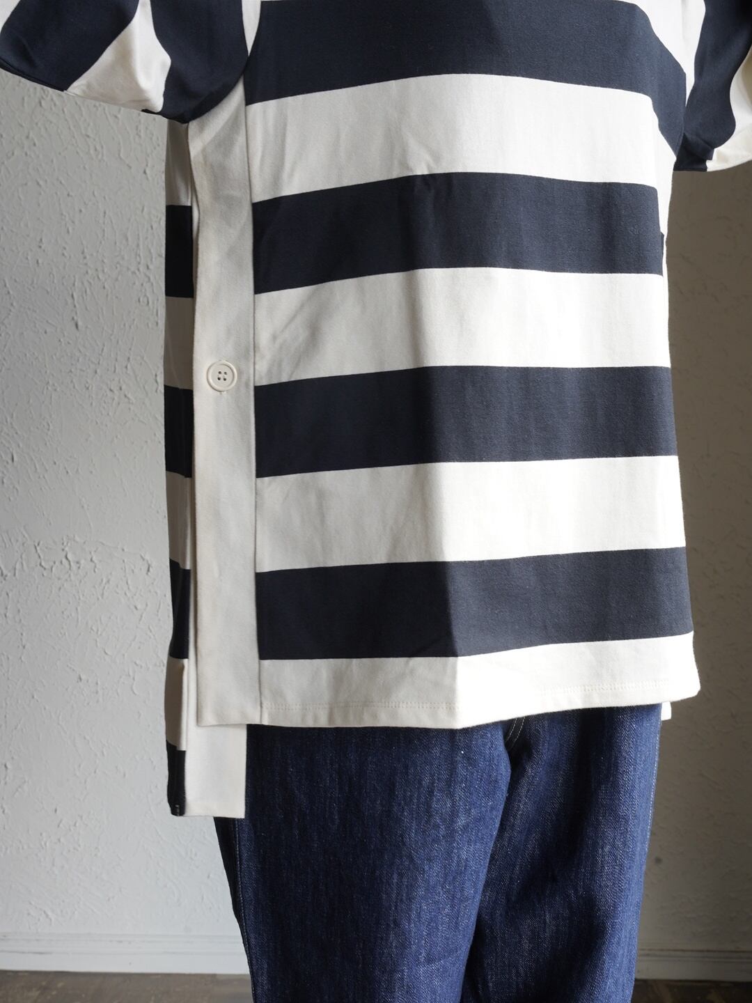 サイドスリット入りの太ボーダー・トップスは、程良い存在感があり、ゆったりめで日常に合わせやすいシルエット。サイドの切り替えスリットと、ワンポイントのボタンでメリハリを持たせつつ、縦長シルエットにすることで太ボーダーがすっきり見え。