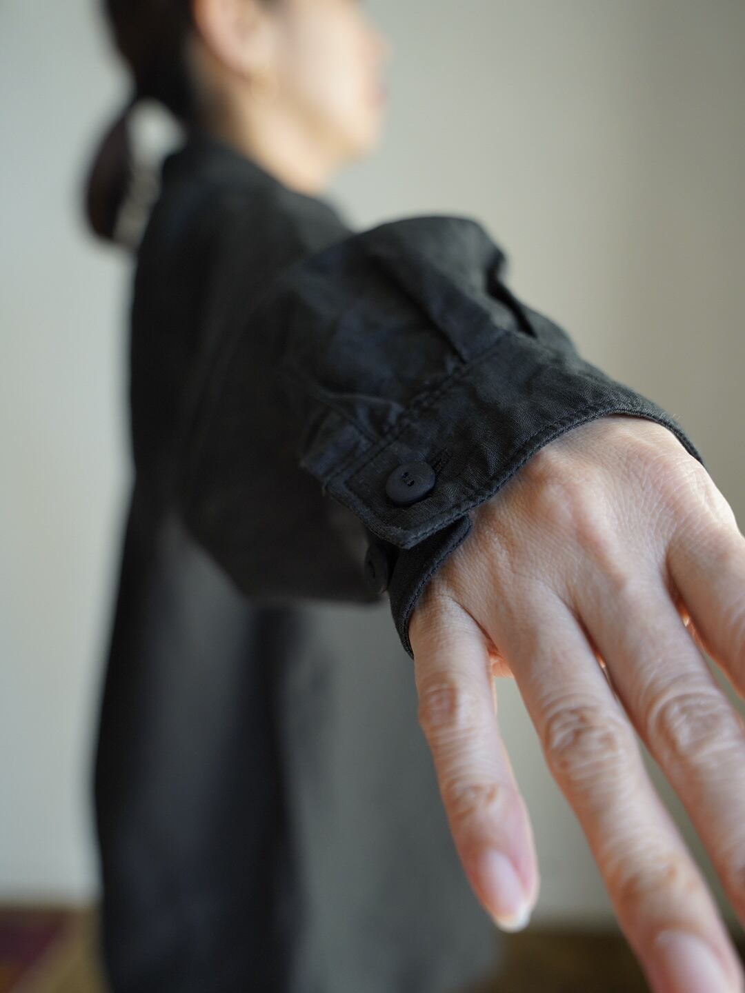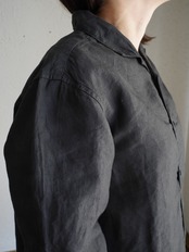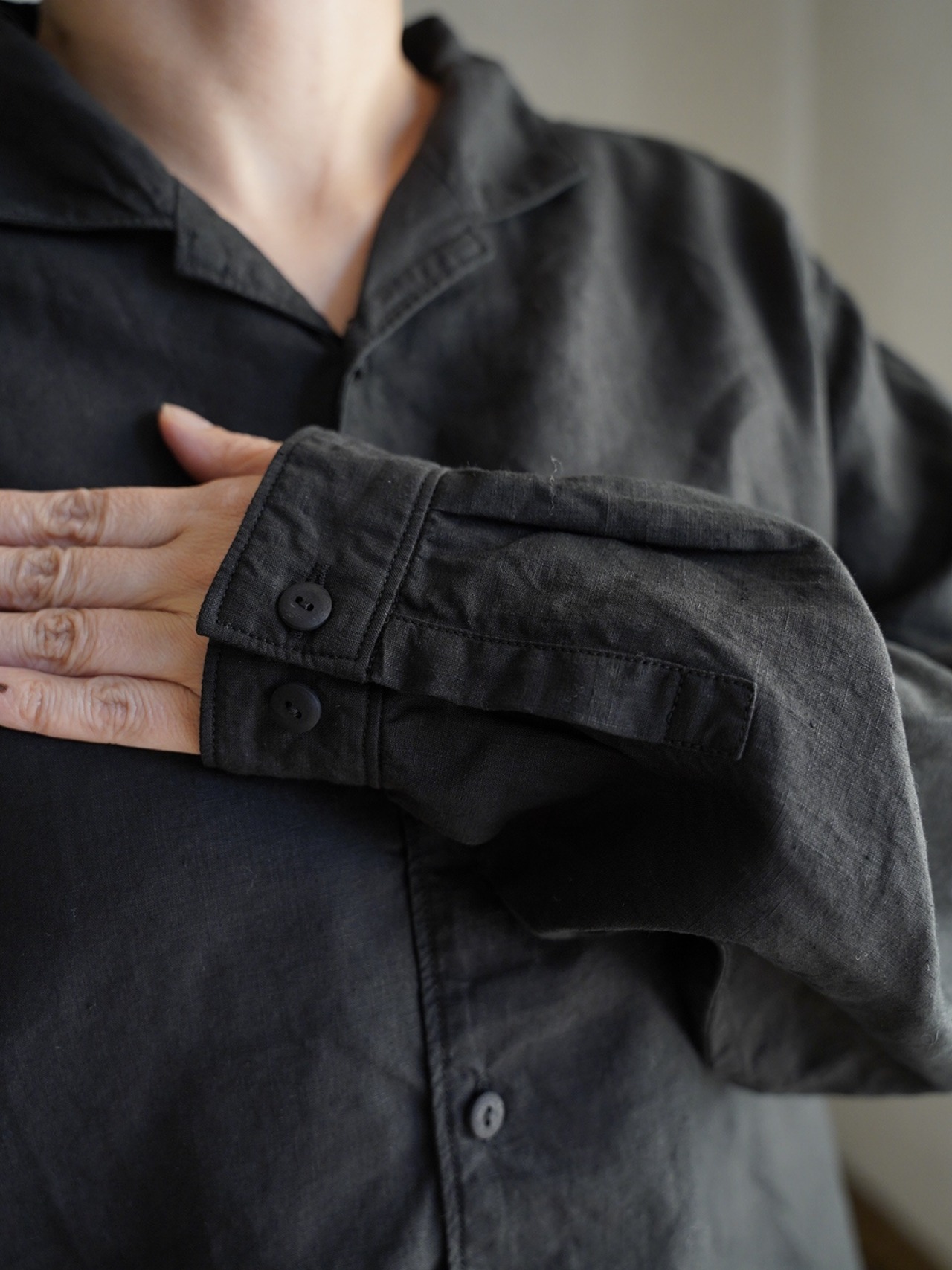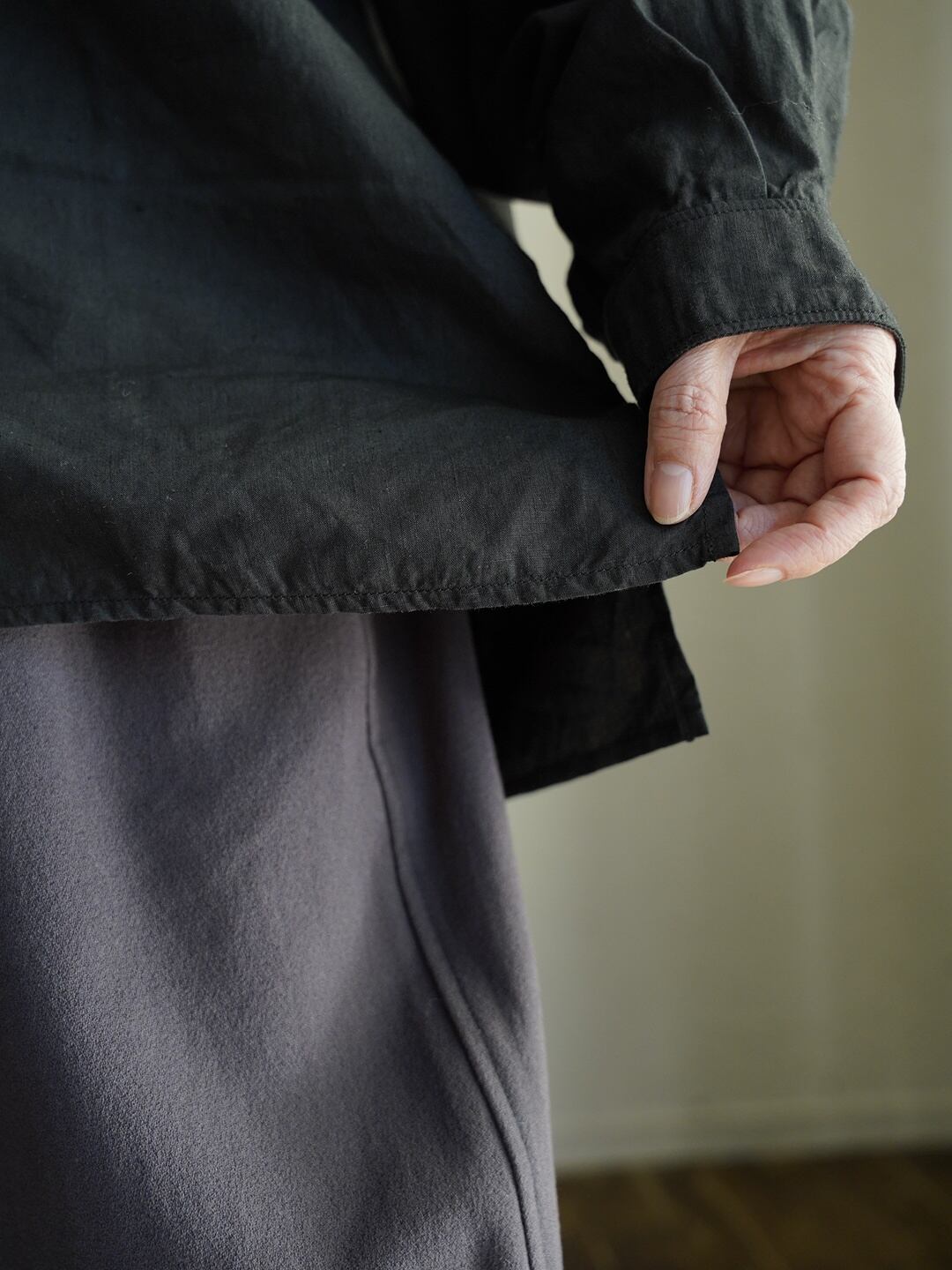 シャツは現代の民族服を構成する洋服としての提案になります。構成は洋服のルールに則りながら、極力デザインを削ぎ落とし、機能性に基づいたパターンメイクとしています。具体的には袖山をいせ込み、袖底を高めに設定することで腕周りの運動量を、背中のヨークにタックやギャザーではなく、いせを入れることで背中の運動量を確保しています。新しい定番となるベーシックなシルエットです。ボタンには綿素材を圧縮したボタンを使用しているため、製品染めによりボタンも染まります。