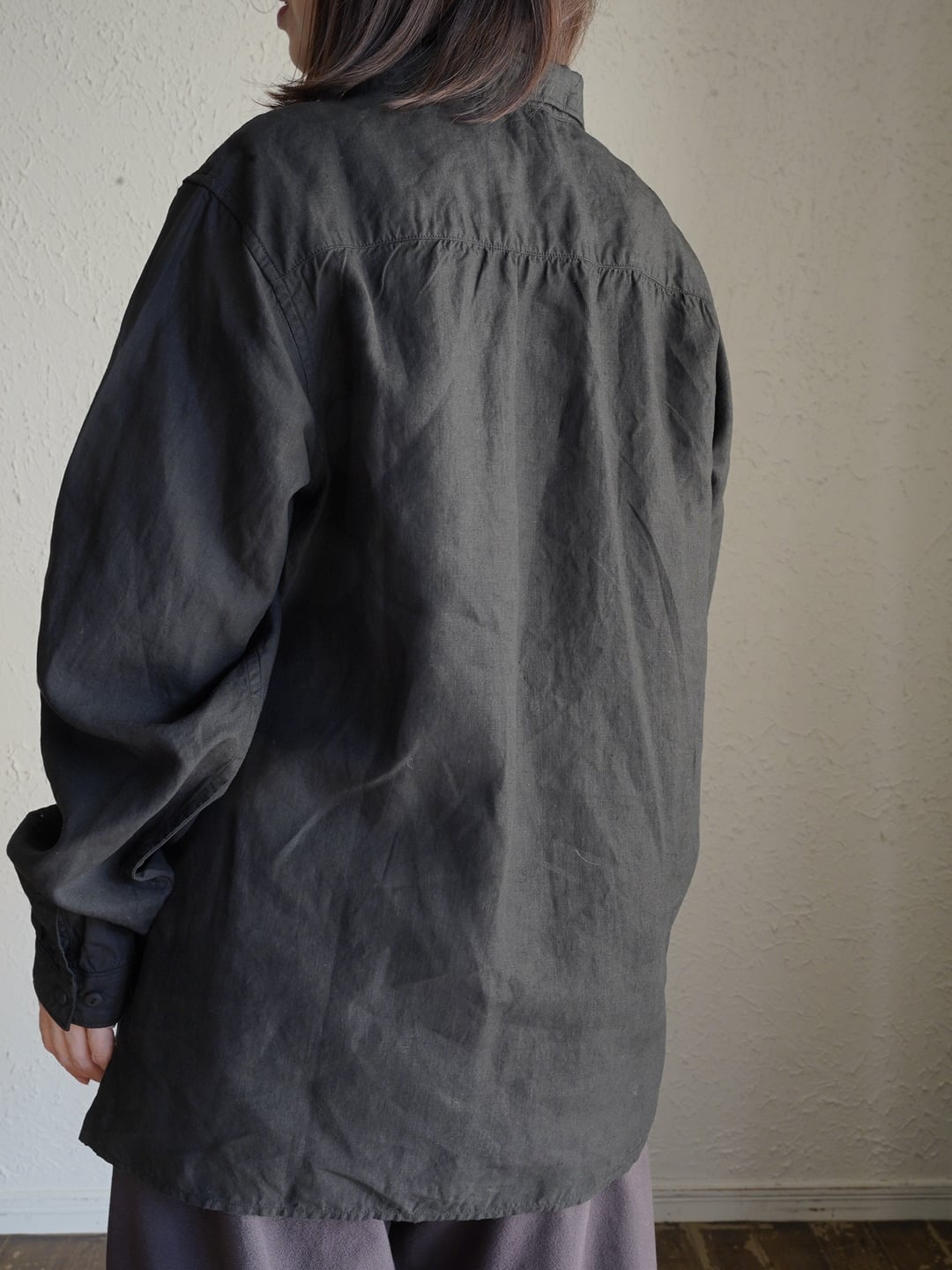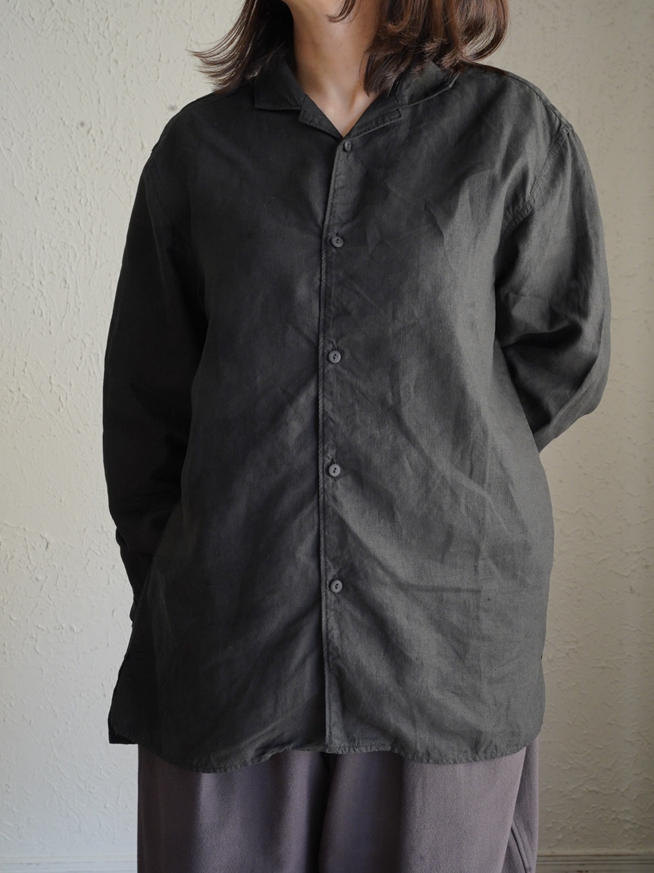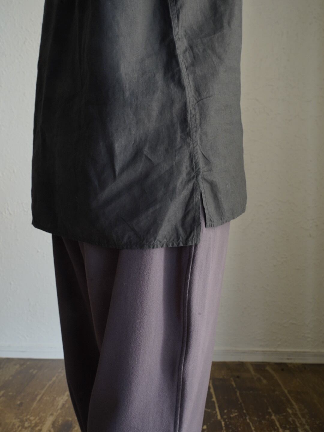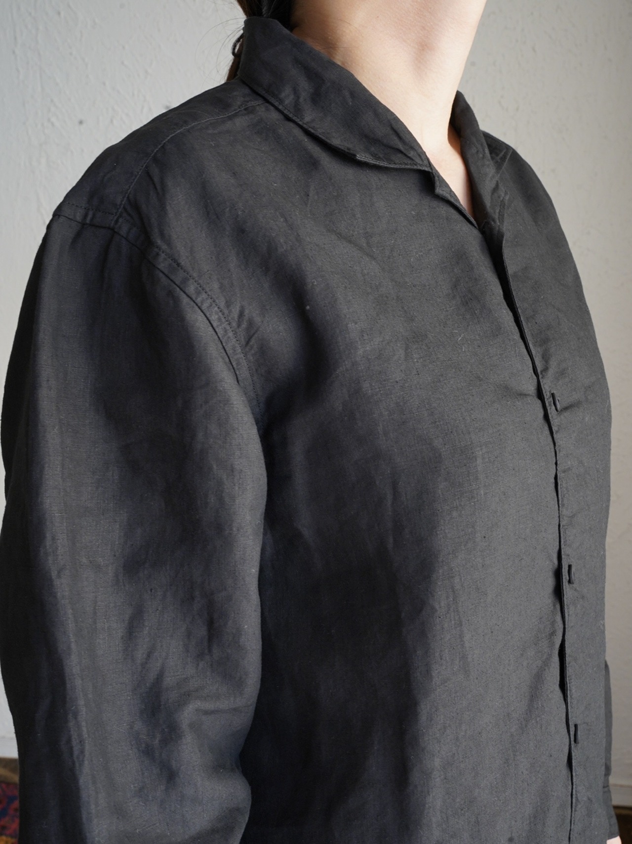シャツは現代の民族服を構成する洋服としての提案になります。構成は洋服のルールに則りながら、極力デザインを削ぎ落とし、機能性に基づいたパターンメイクとしています。具体的には袖山をいせ込み、袖底を高めに設定することで腕周りの運動量を、背中のヨークにタックやギャザーではなく、いせを入れることで背中の運動量を確保しています。新しい定番となるベーシックなシルエットです。ボタンには綿素材を圧縮したボタンを使用しているため、製品染めによりボタンも染まります。