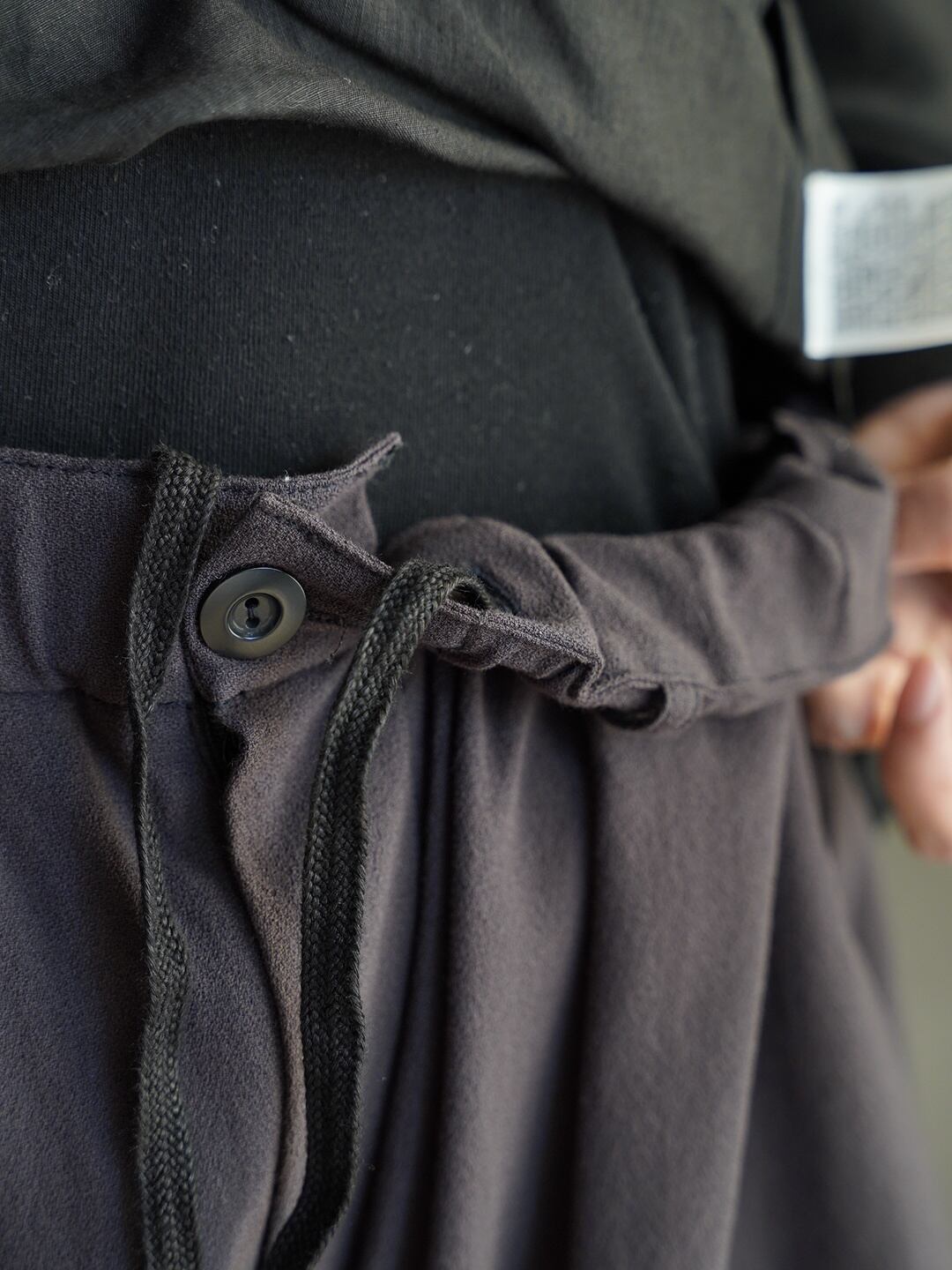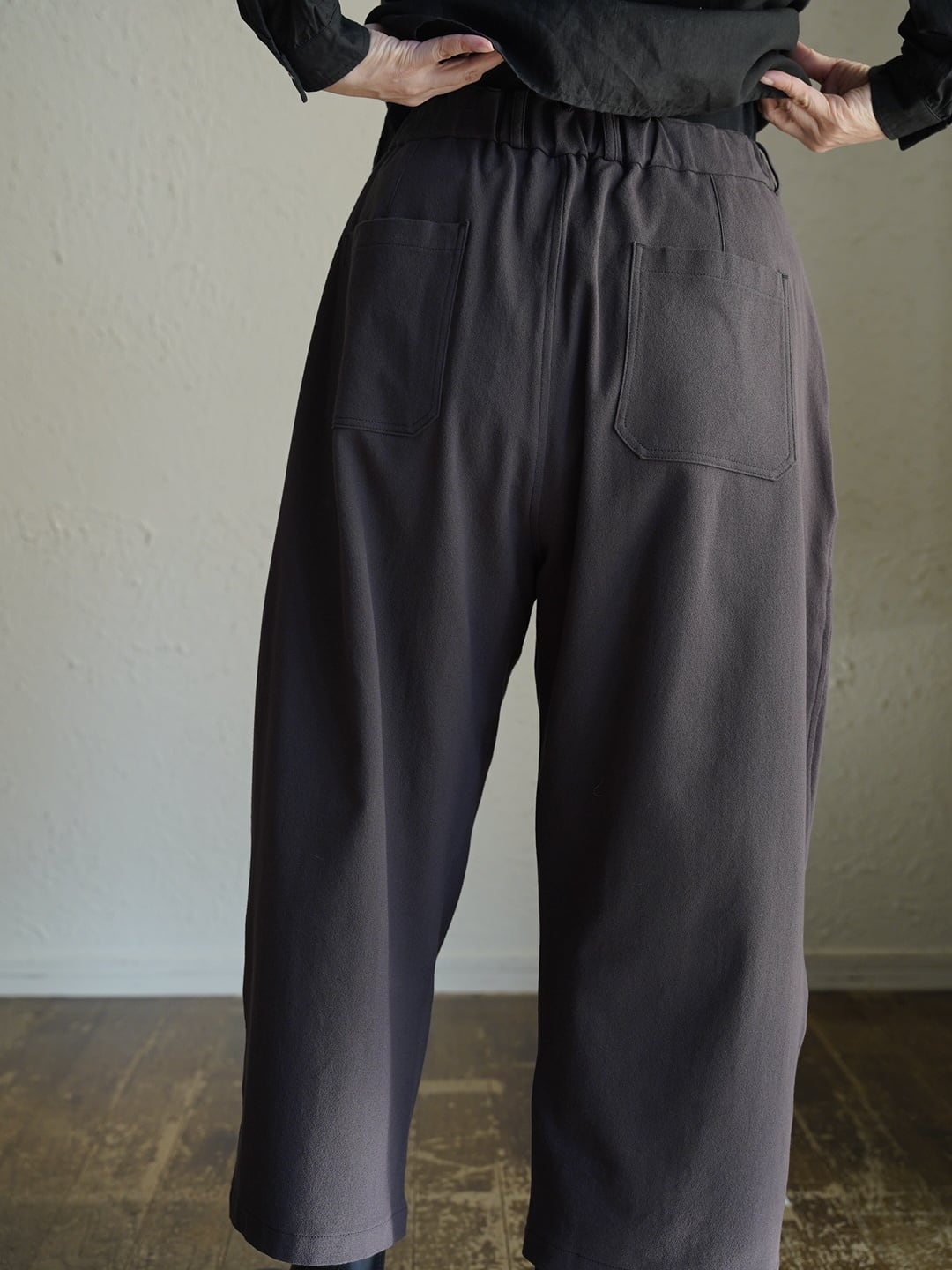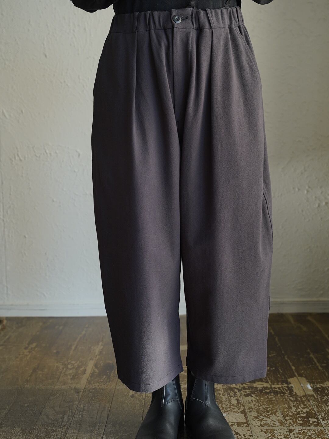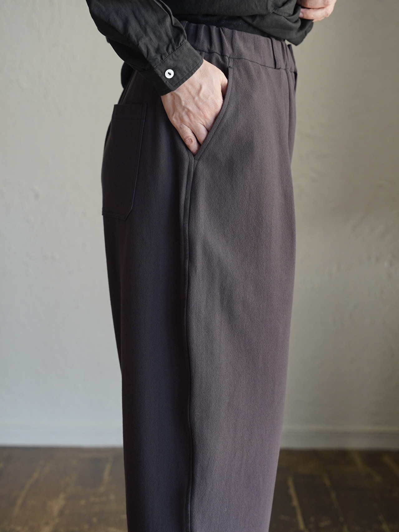 ボリューム感を表現するため、パンツの前に大きなタックを入れています。比較的短めの丈で、ゆとりのあるシルエットが特徴です。体型を問わず、身体との間に適度な空間を保ち、生地の質感と相まって快適に着用できます。ウエストベルト全体に伸縮素材を入れ、前開きの仕様を採用しています。ボタンには環境負荷の少ないナットボタンを使用しています。ウエスト寸の調整は、ベルト裏に配した大麻の組紐でも可能です。