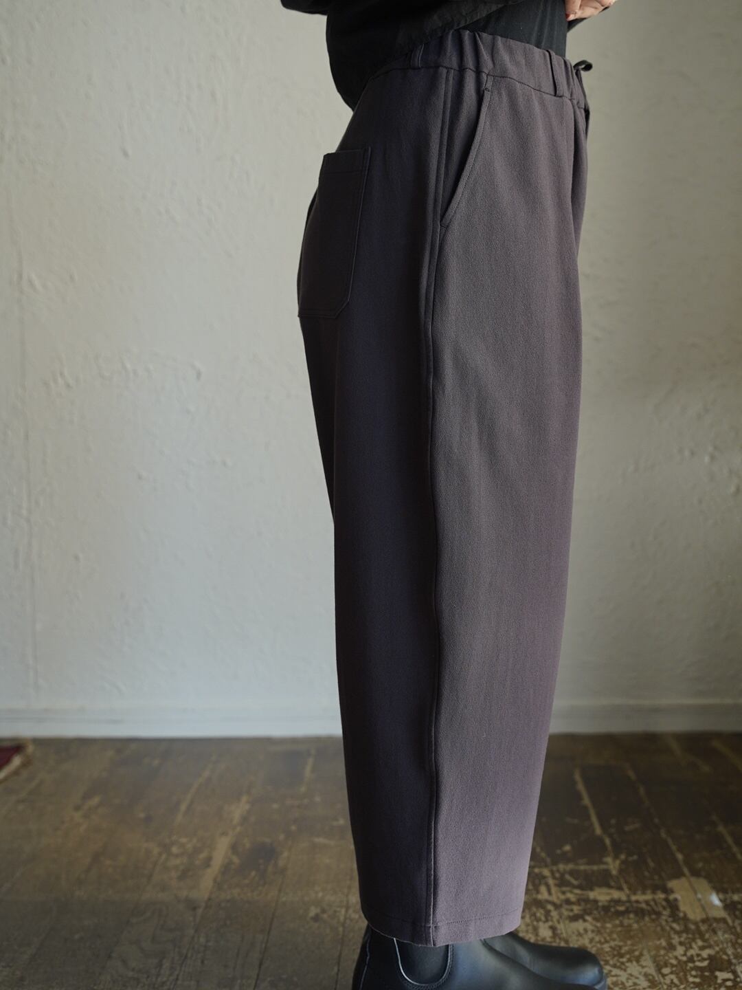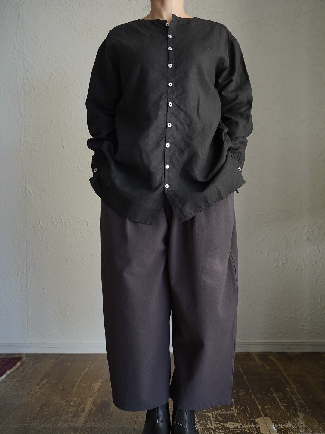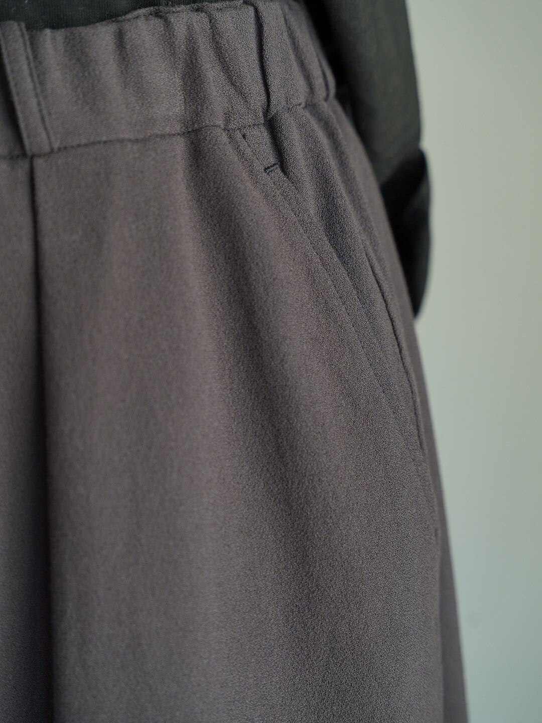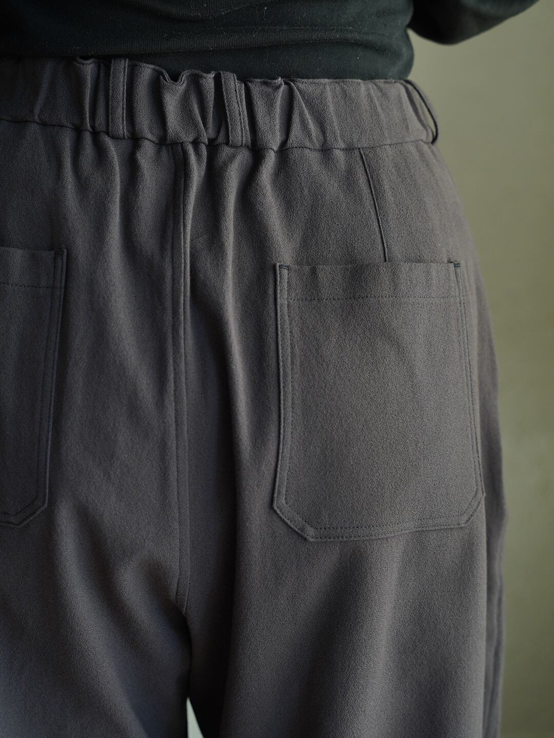 ボリューム感を表現するため、パンツの前に大きなタックを入れています。比較的短めの丈で、ゆとりのあるシルエットが特徴です。体型を問わず、身体との間に適度な空間を保ち、生地の質感と相まって快適に着用できます。ウエストベルト全体に伸縮素材を入れ、前開きの仕様を採用しています。ボタンには環境負荷の少ないナットボタンを使用しています。ウエスト寸の調整は、ベルト裏に配した大麻の組紐でも可能です。