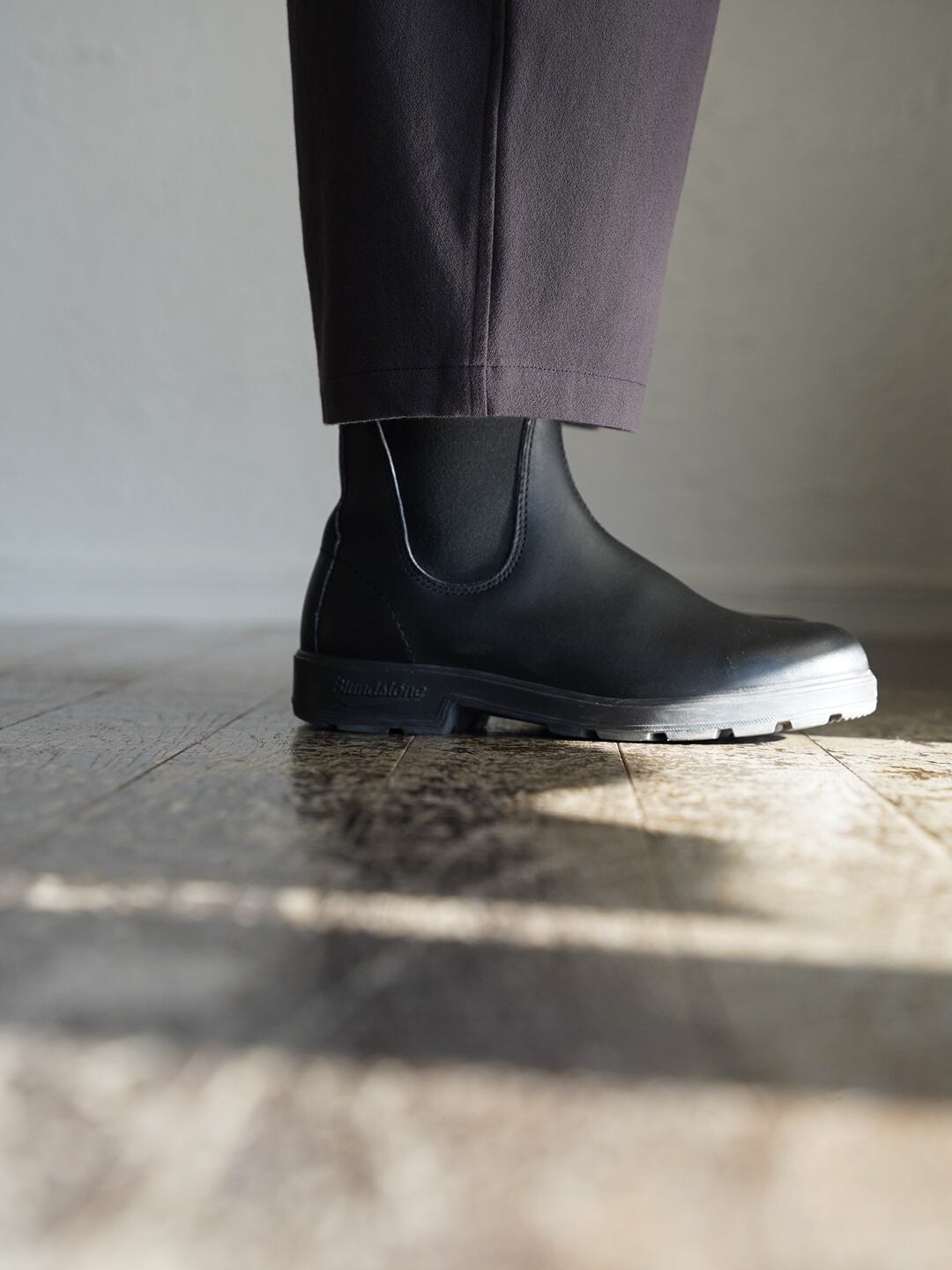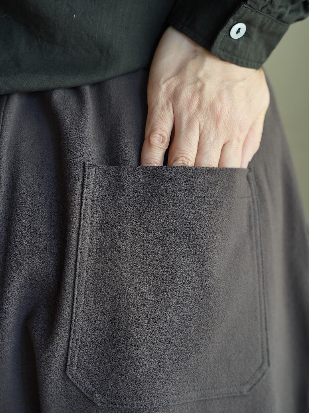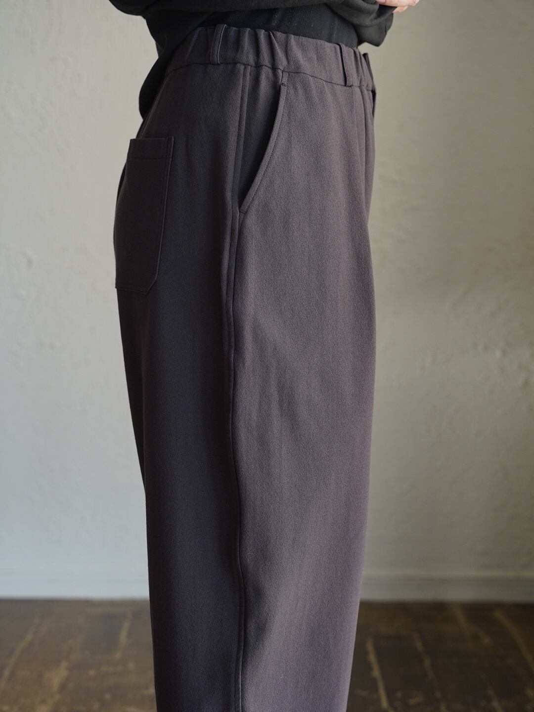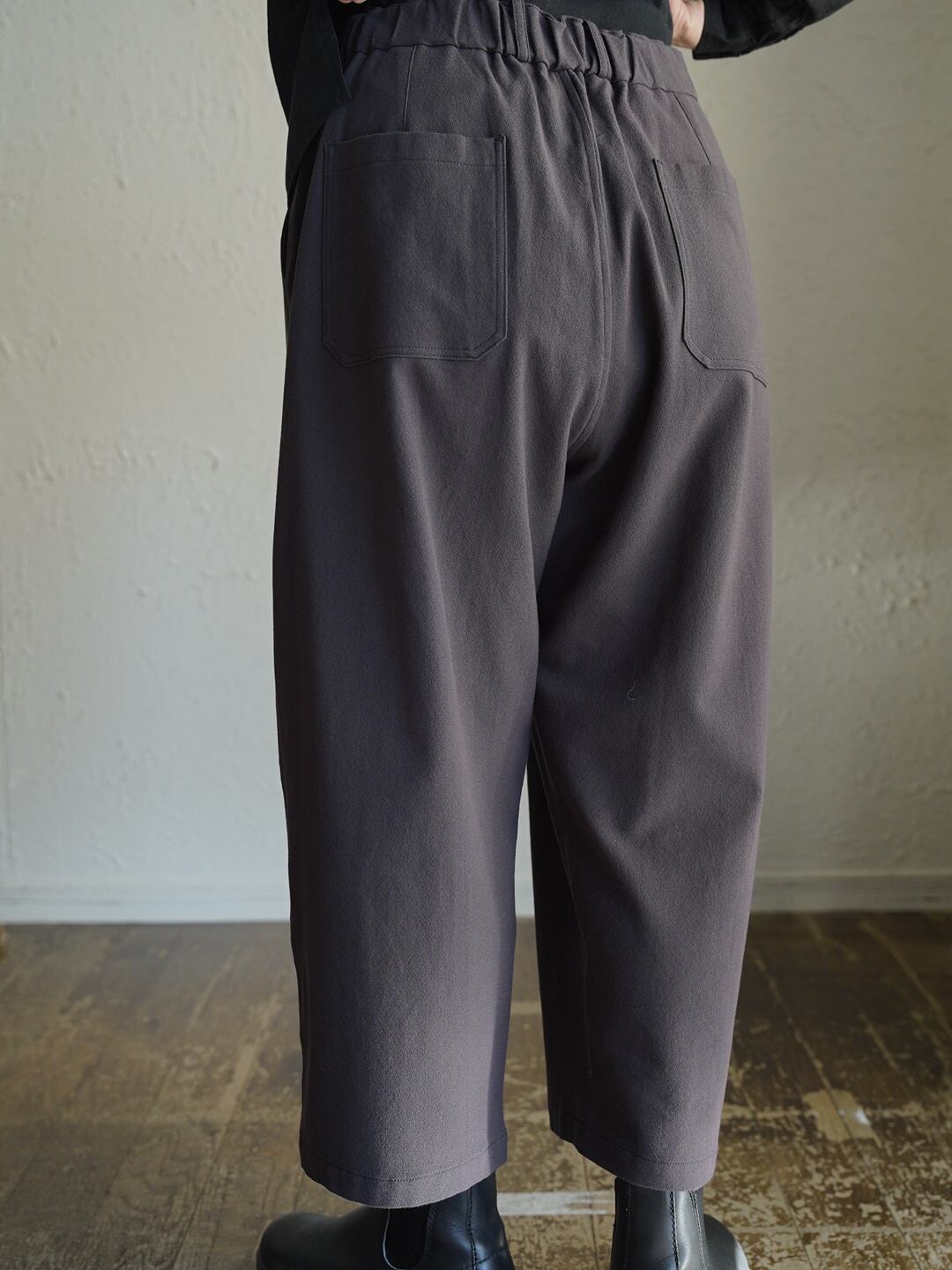 ボリューム感を表現するため、パンツの前に大きなタックを入れています。比較的短めの丈で、ゆとりのあるシルエットが特徴です。体型を問わず、身体との間に適度な空間を保ち、生地の質感と相まって快適に着用できます。ウエストベルト全体に伸縮素材を入れ、前開きの仕様を採用しています。ボタンには環境負荷の少ないナットボタンを使用しています。ウエスト寸の調整は、ベルト裏に配した大麻の組紐でも可能です。