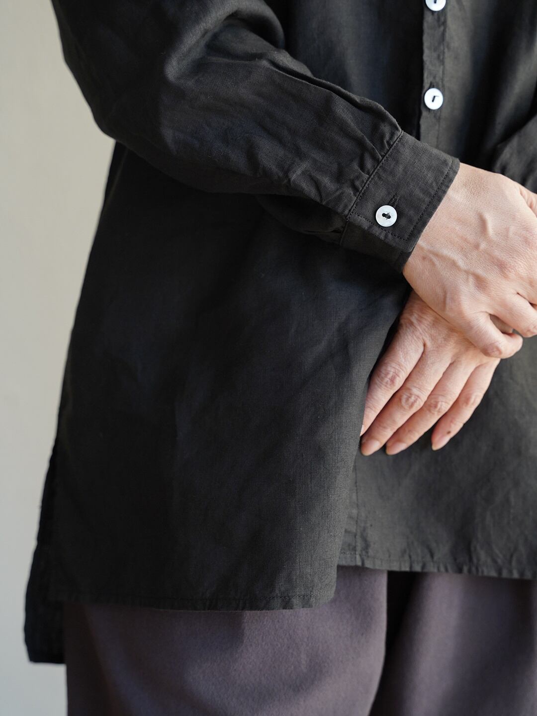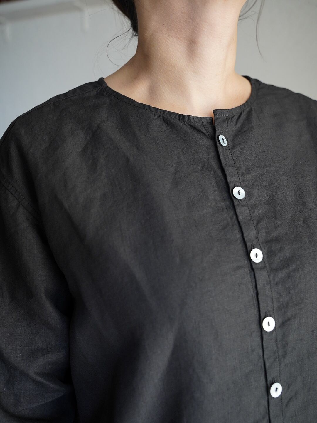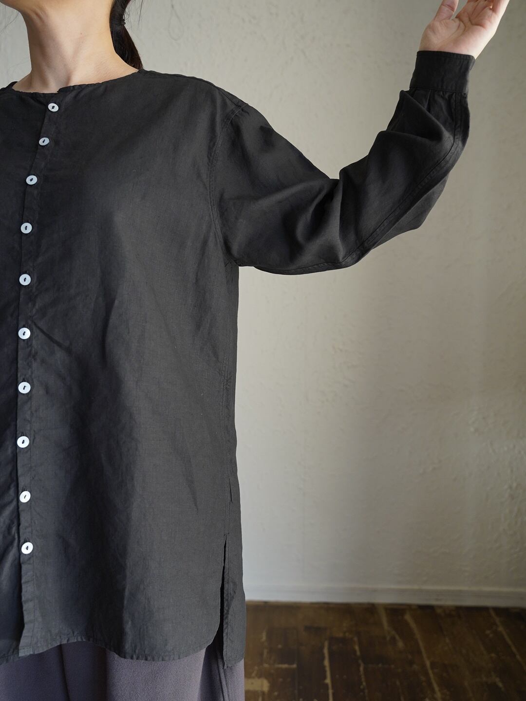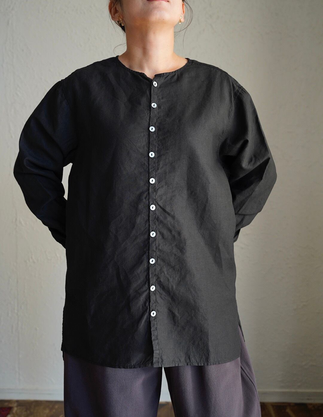 身体とのゆとりを意識したシャツ仕様のアイテムですが、一番上を開けたり、一つだけ留めたりすることで、羽織のようにも使用が可能です。また、縫製糸に全て綿糸の30番を使った柔らかな仕上がりで、素肌でも快適に着用が可能です。前立てには高瀬貝の釦を使用しています。