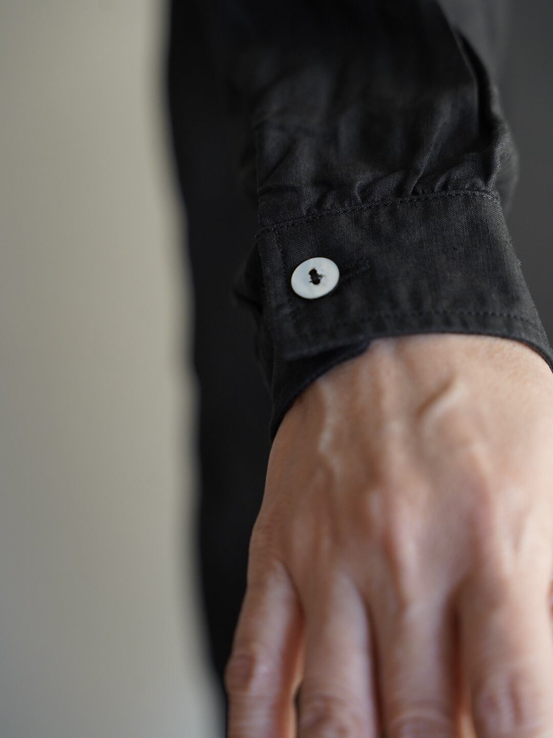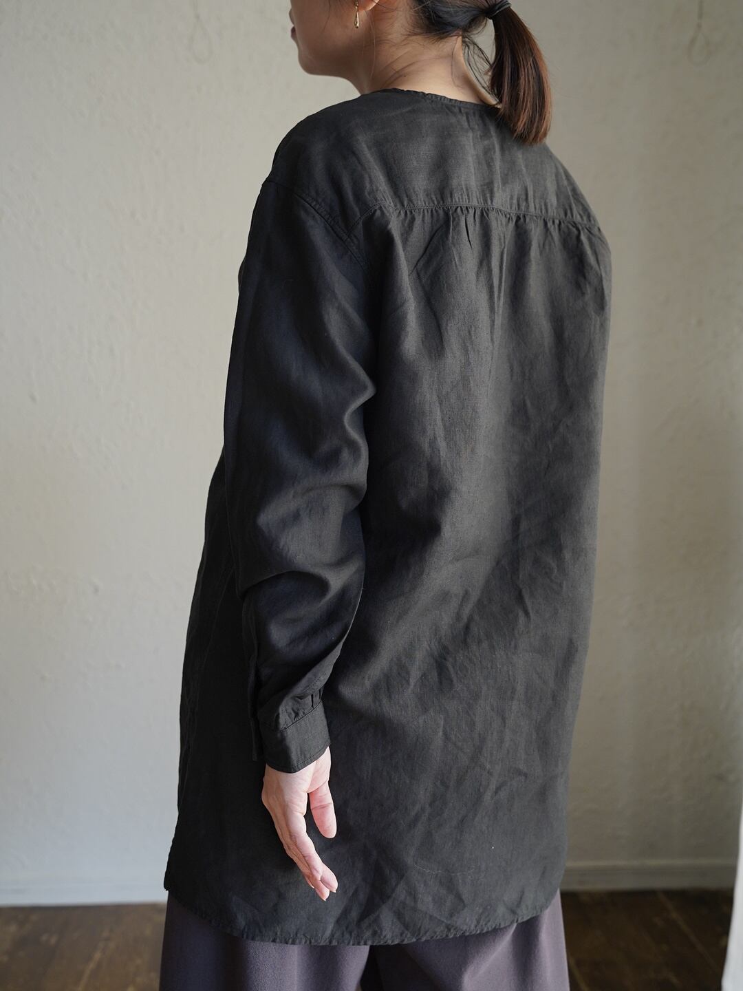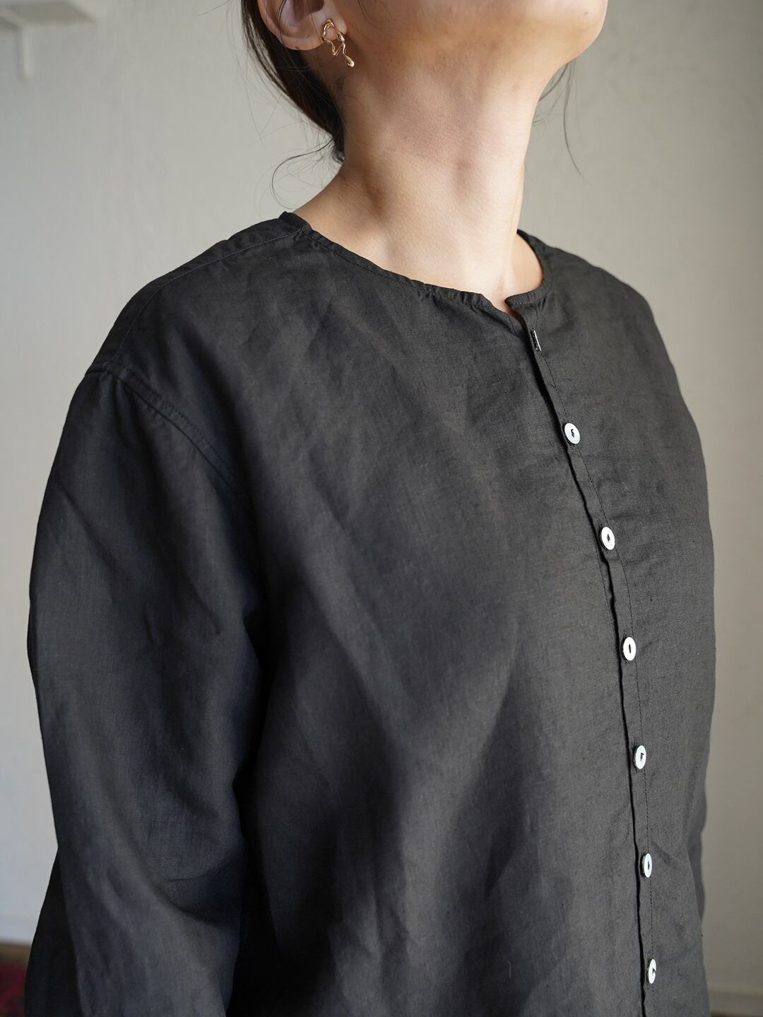 身体とのゆとりを意識したシャツ仕様のアイテムですが、一番上を開けたり、一つだけ留めたりすることで、羽織のようにも使用が可能です。また、縫製糸に全て綿糸の30番を使った柔らかな仕上がりで、素肌でも快適に着用が可能です。前立てには高瀬貝の釦を使用しています。