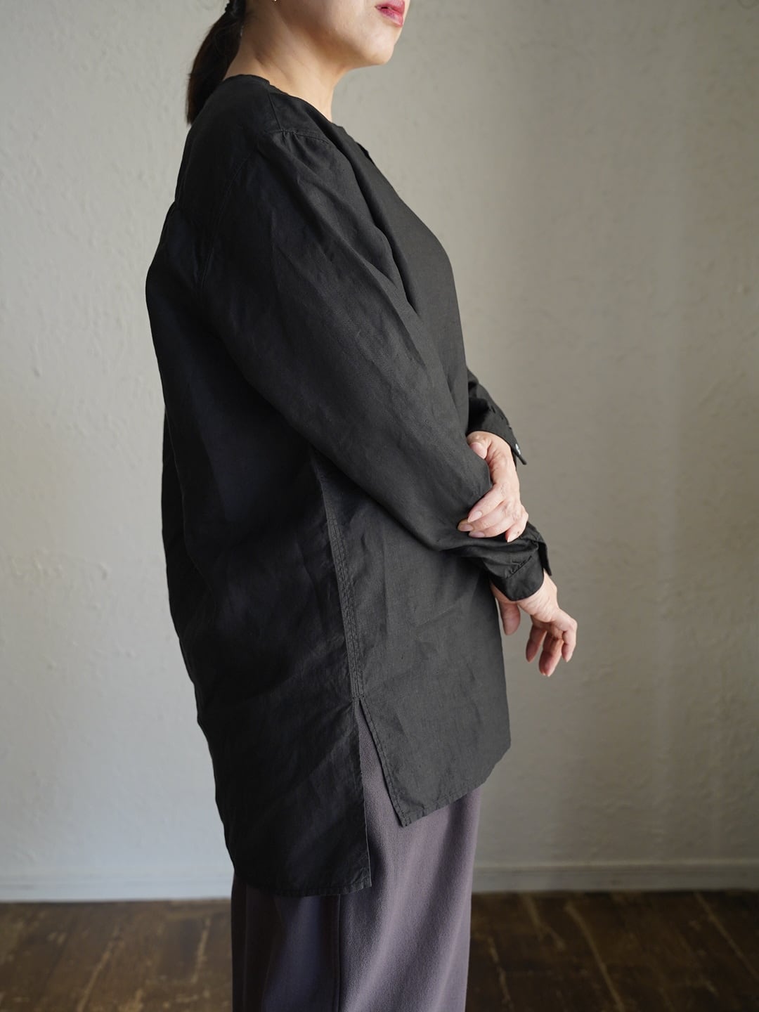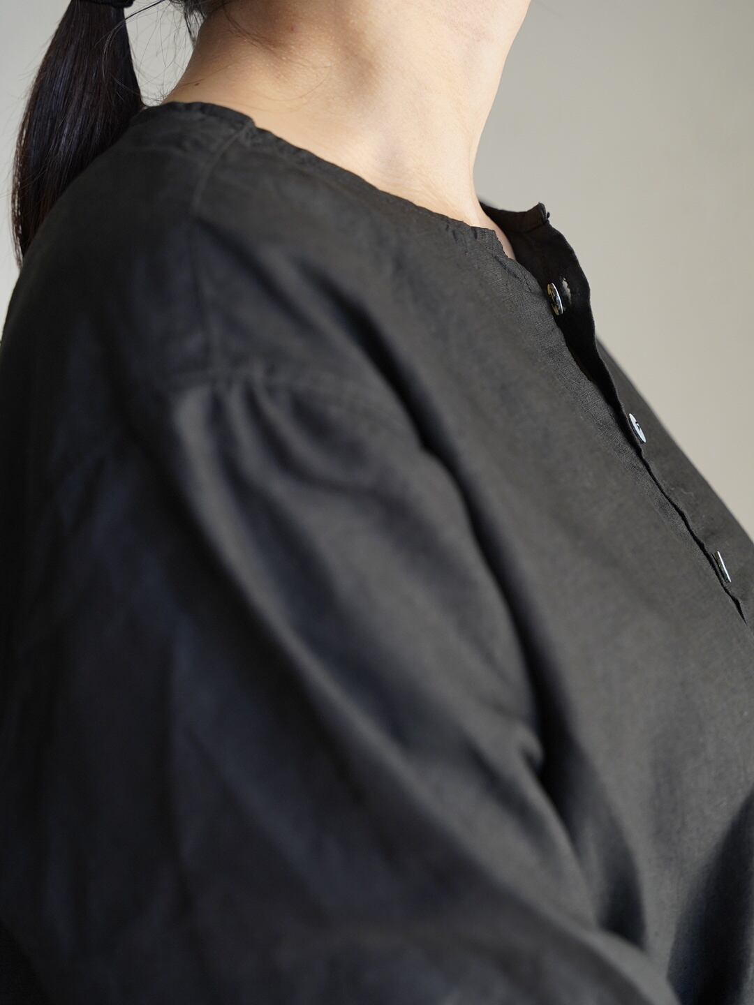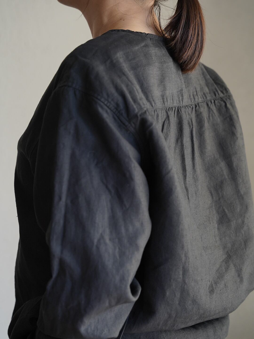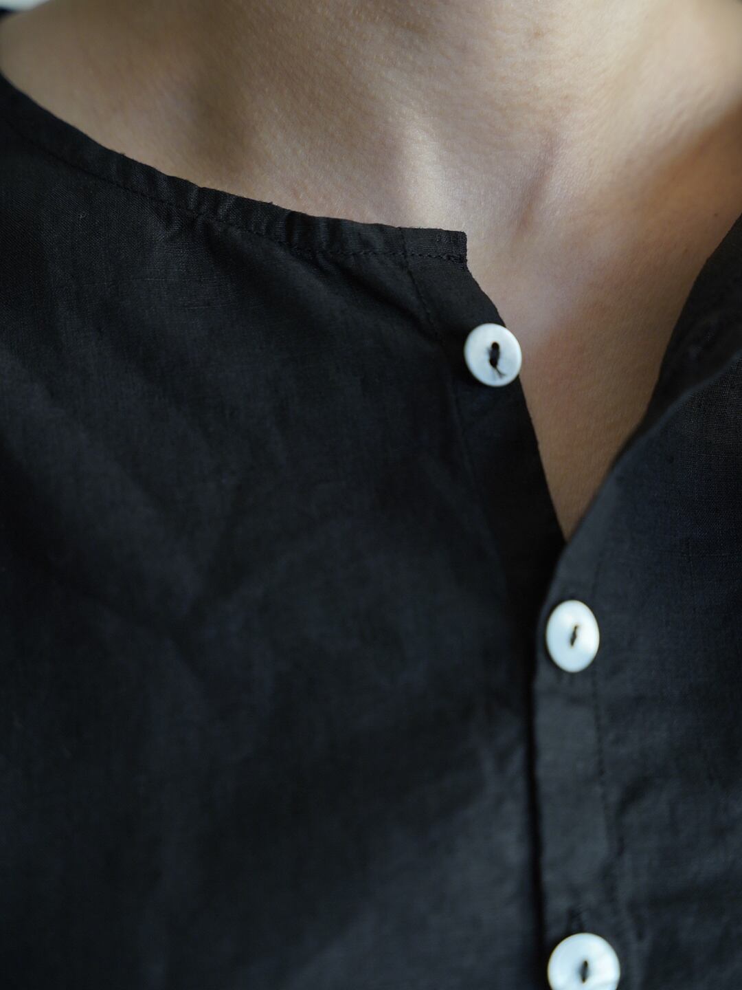 身体とのゆとりを意識したシャツ仕様のアイテムですが、一番上を開けたり、一つだけ留めたりすることで、羽織のようにも使用が可能です。また、縫製糸に全て綿糸の30番を使った柔らかな仕上がりで、素肌でも快適に着用が可能です。前立てには高瀬貝の釦を使用しています。
