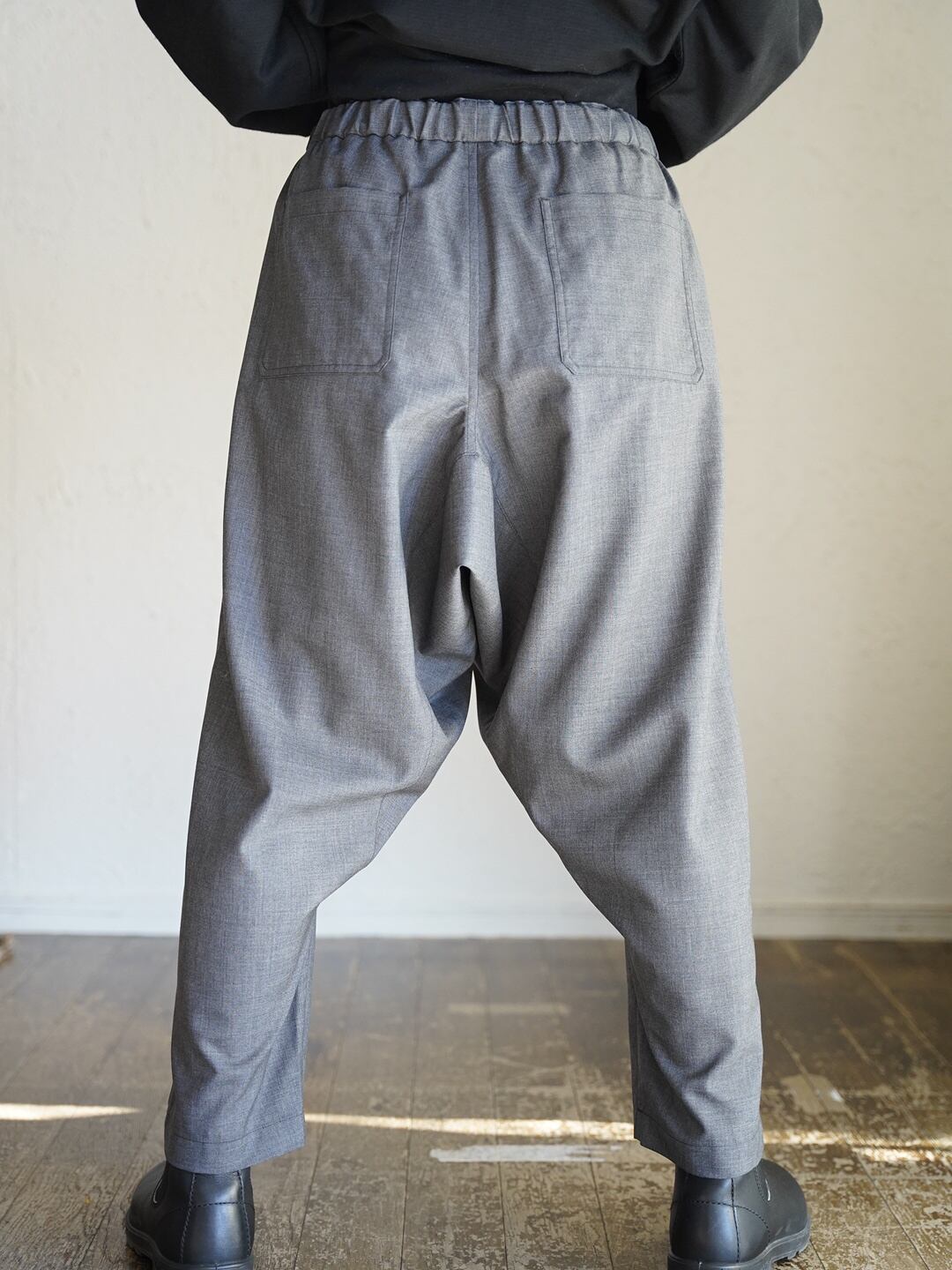 民族衣装に見られる股下のマチの仕様を大胆に解釈したデザインを採用しています。股下を深く設定することで、足の動きを妨げずに十分な運動量を確保しています。同時に、マチの付け方によってボリューム感を表現しています。また、ウエスト部分は小さめのゴム上がりで設計されており、ベルトループが無くとも、内側の紐を使用して着用が可能です。