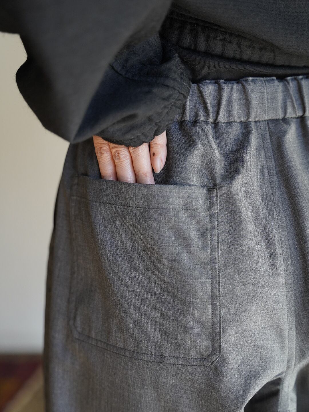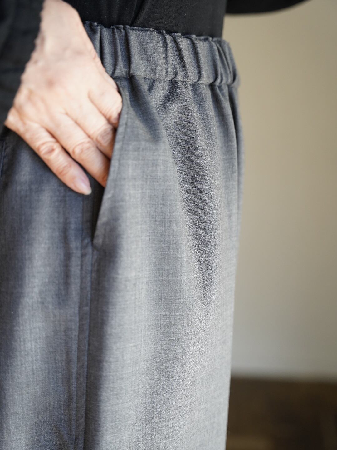 細番手の上質な糸を使用したウール100%の素材で、夏にも穿けるくらい肌触りが良く、シャリ感があります。ウールは吸放湿性に優れているため、汗をしっかり吸収し放出することで、常に快適な状態を保つことができます。また、温度変化にも柔軟に対応し、冷えすぎた室内でも体温の調整を助け、身体の負担を軽減します。こちらの素材は非常に軽量で、加工によりシワになりにくい性質も持っています。