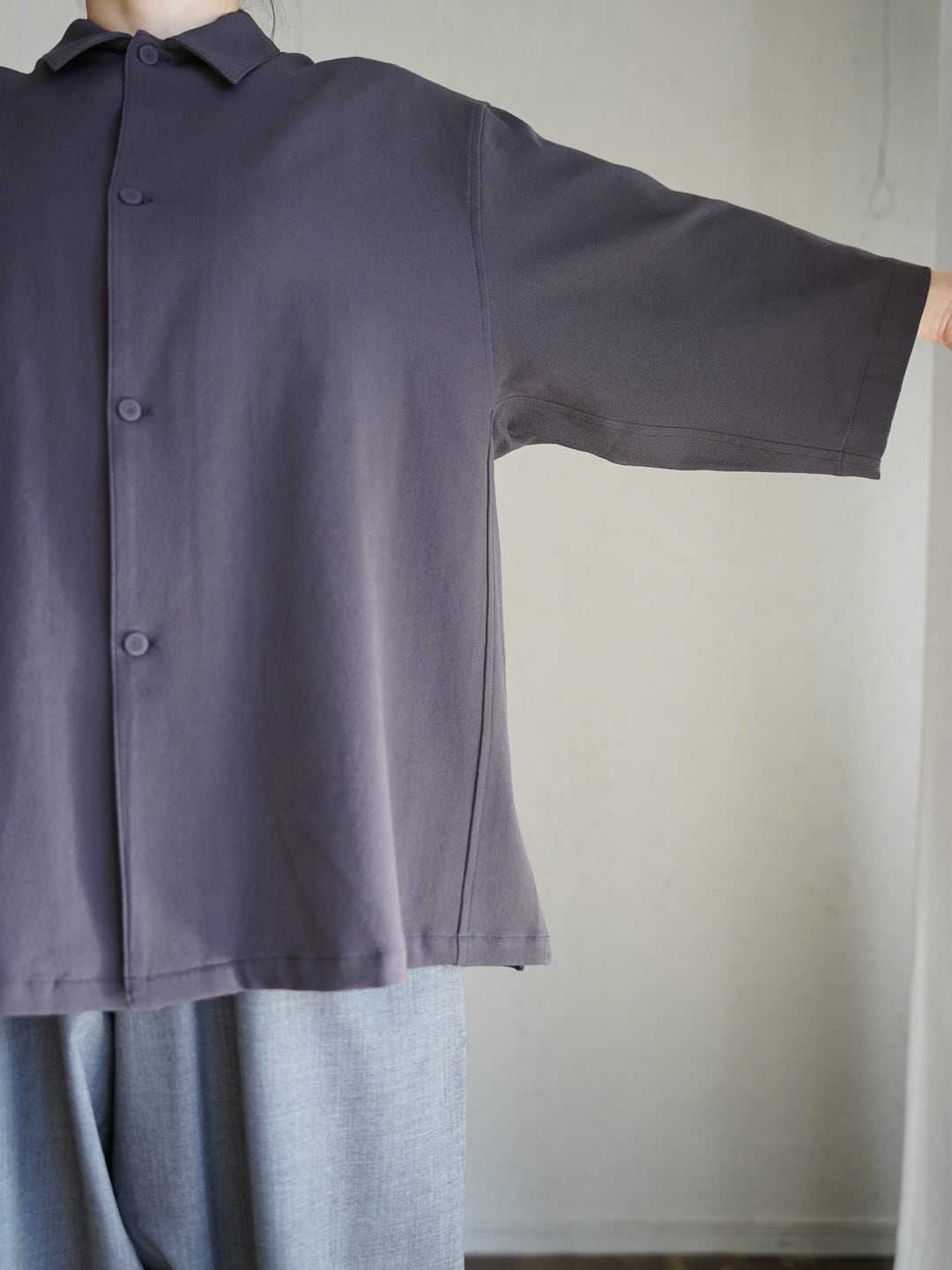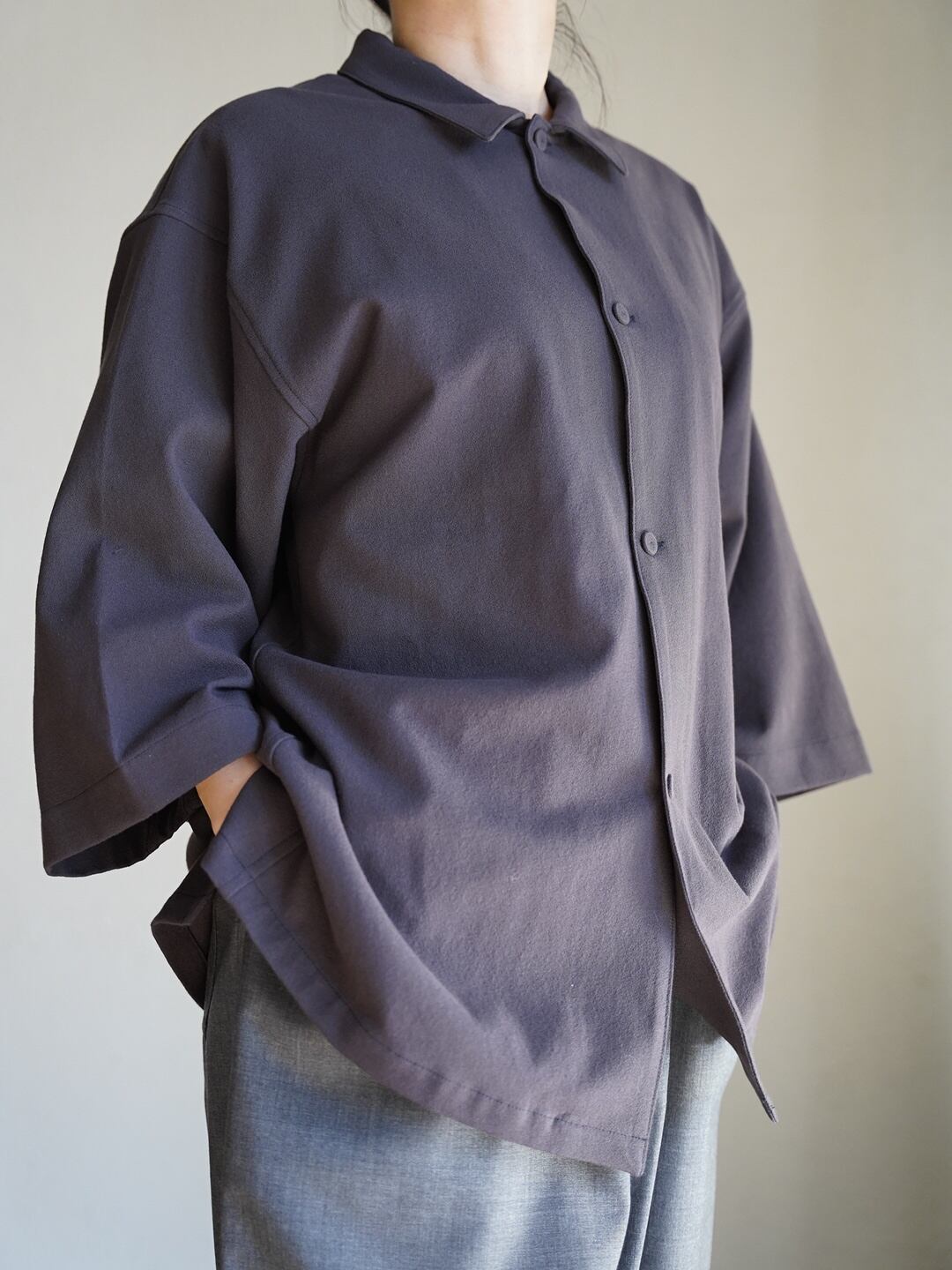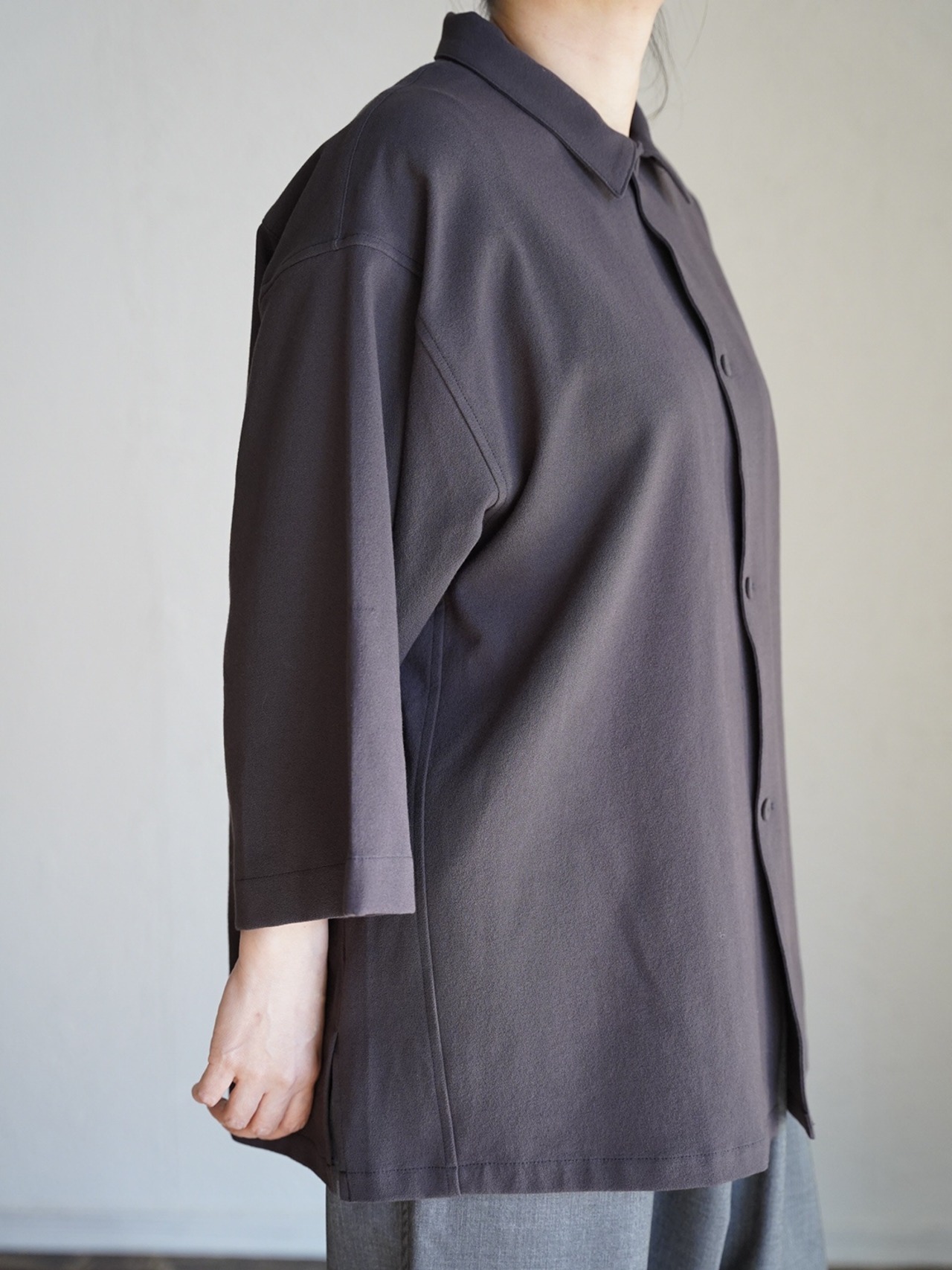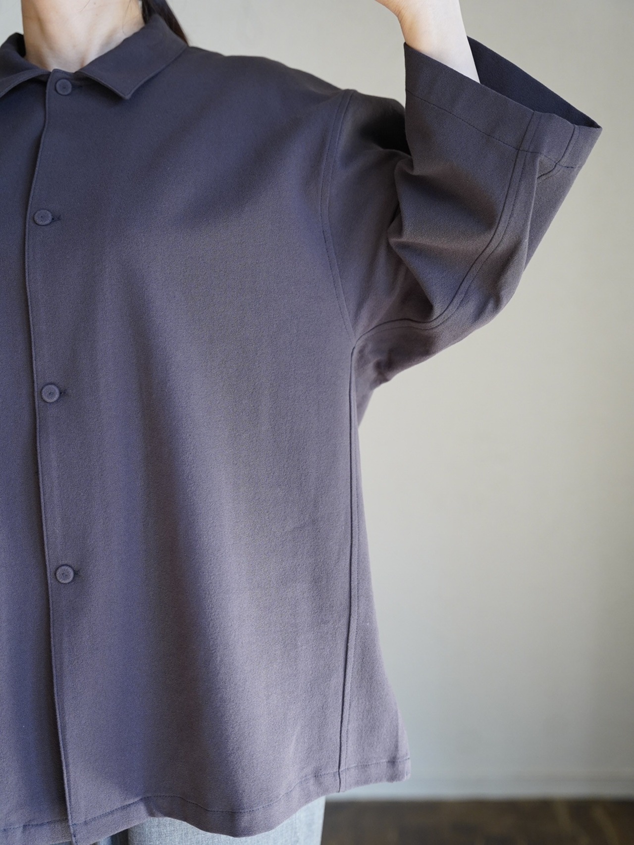 身幅と袖幅を広めにとった、八分袖が特徴のリラックス感のあるシャツです。しっかりとした生地感と立体的な衿の印象により、半袖ジャケットのような感覚でも着用できます。全体的にゆとりを持たせたシルエットで、身体との間に適度な空間が生まれるため、ストレスなく着用できます。ボタンには本体生地を使用した包みボタンを採用し、全体をやわらかくマットな印象に仕上げています。