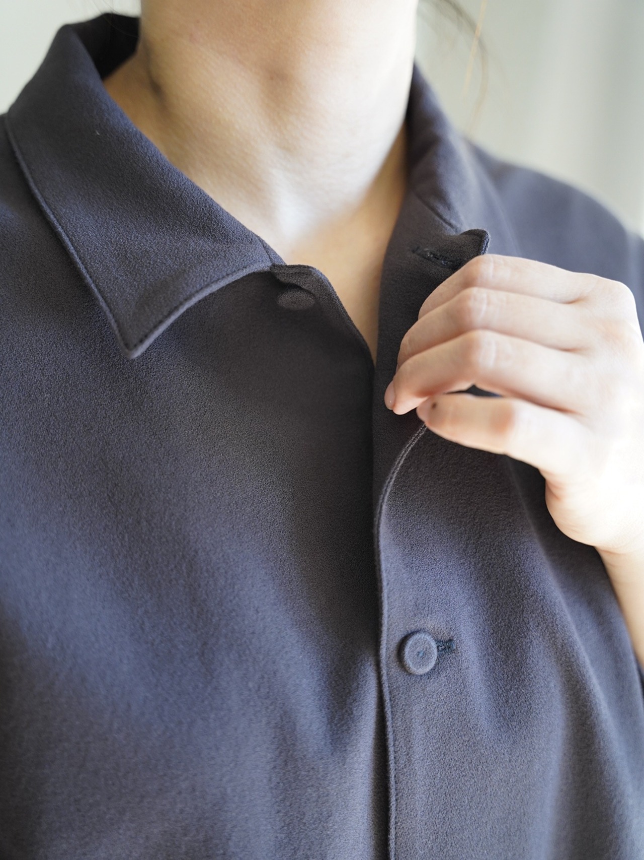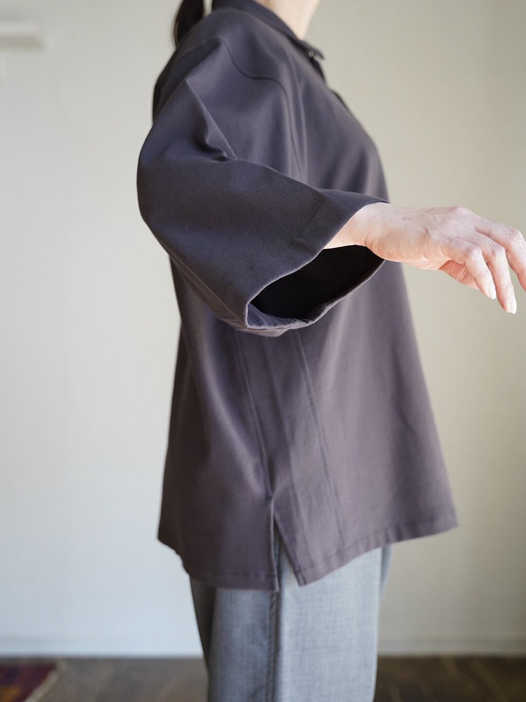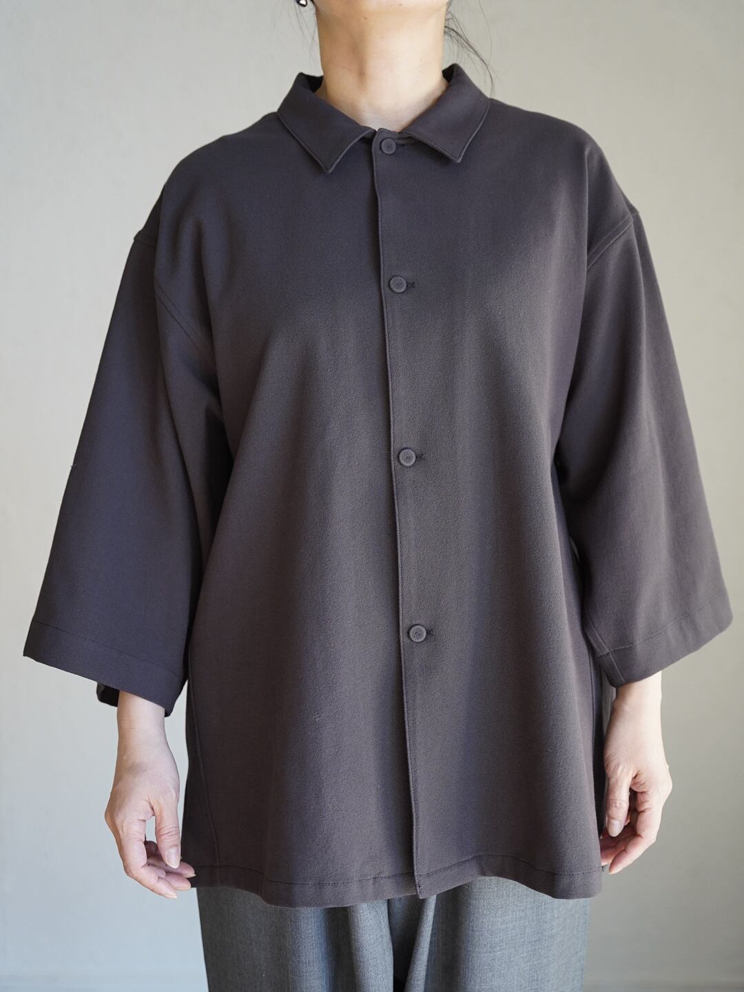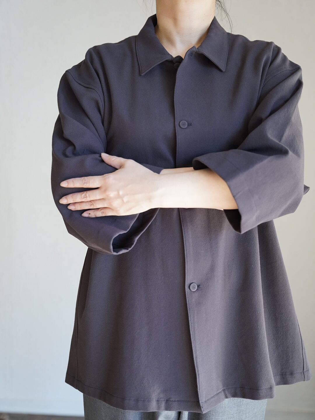身幅と袖幅を広めにとった、八分袖が特徴のリラックス感のあるシャツです。しっかりとした生地感と立体的な衿の印象により、半袖ジャケットのような感覚でも着用できます。全体的にゆとりを持たせたシルエットで、身体との間に適度な空間が生まれるため、ストレスなく着用できます。ボタンには本体生地を使用した包みボタンを採用し、全体をやわらかくマットな印象に仕上げています。