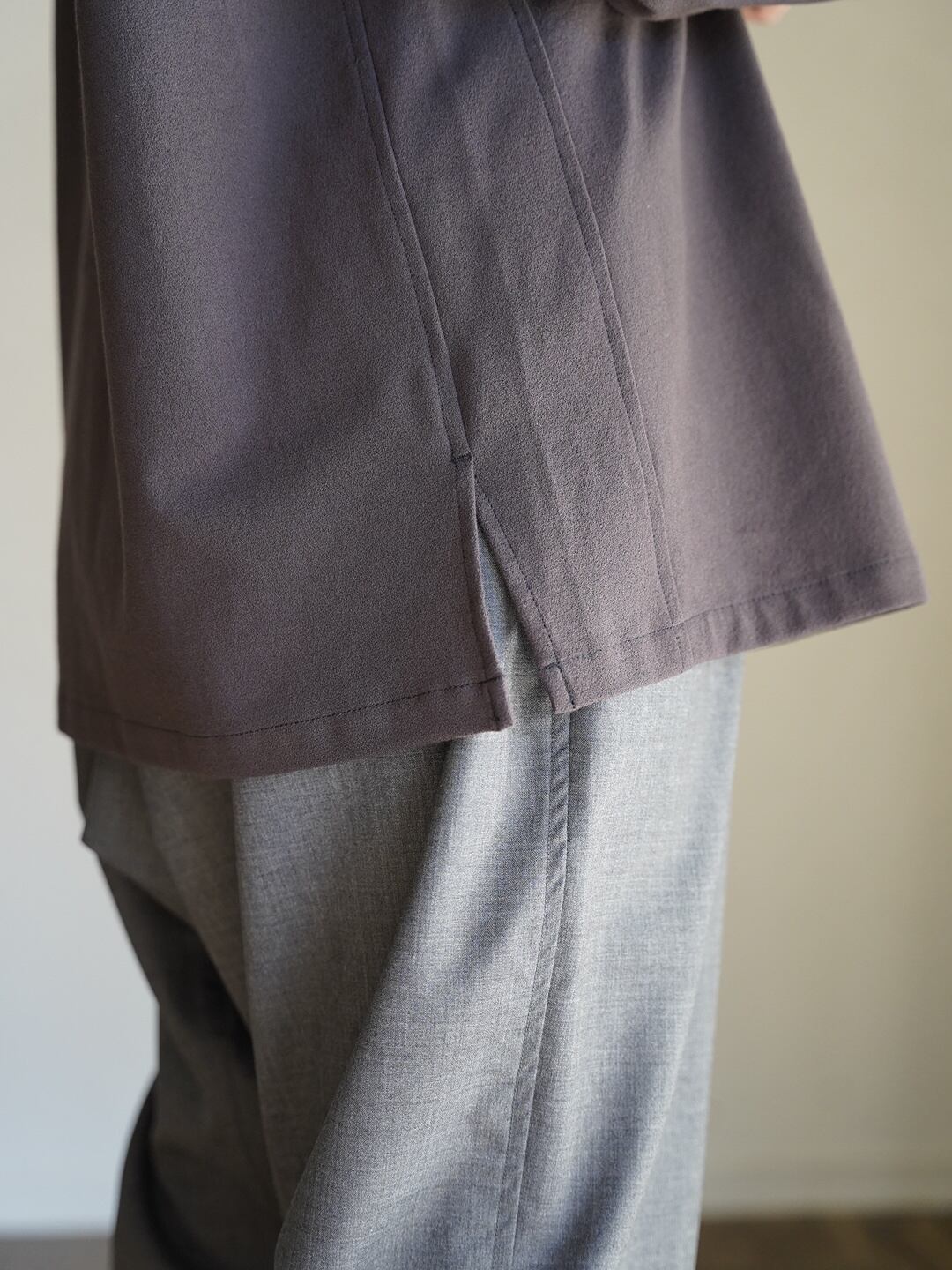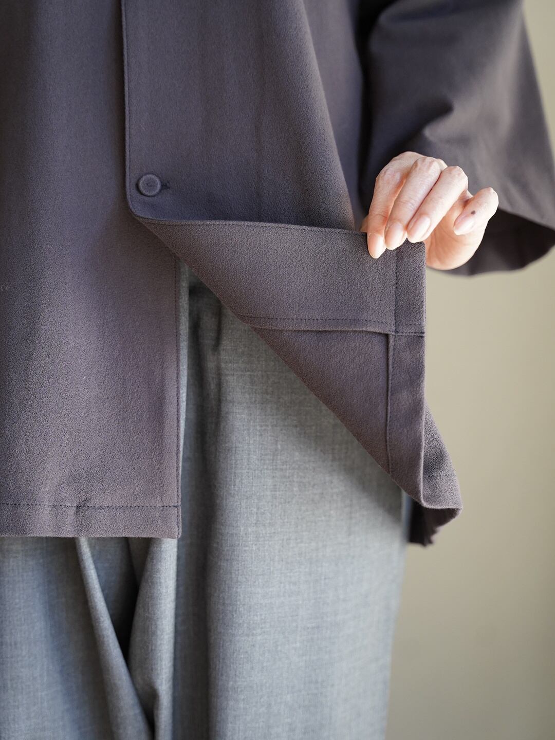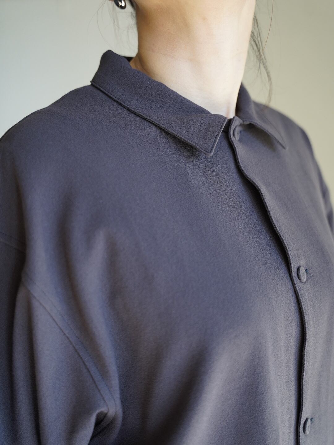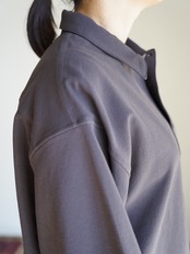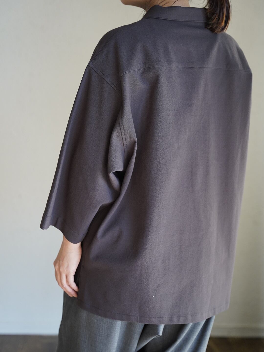 身幅と袖幅を広めにとった、八分袖が特徴のリラックス感のあるシャツです。しっかりとした生地感と立体的な衿の印象により、半袖ジャケットのような感覚でも着用できます。全体的にゆとりを持たせたシルエットで、身体との間に適度な空間が生まれるため、ストレスなく着用できます。ボタンには本体生地を使用した包みボタンを採用し、全体をやわらかくマットな印象に仕上げています。