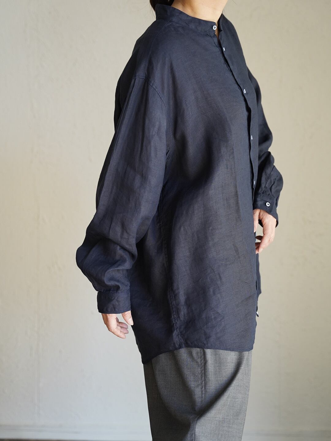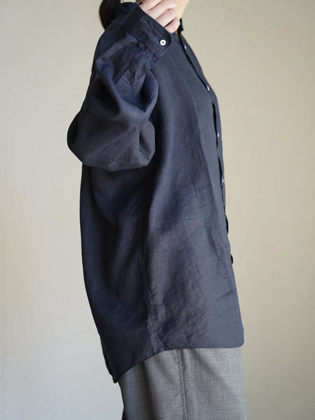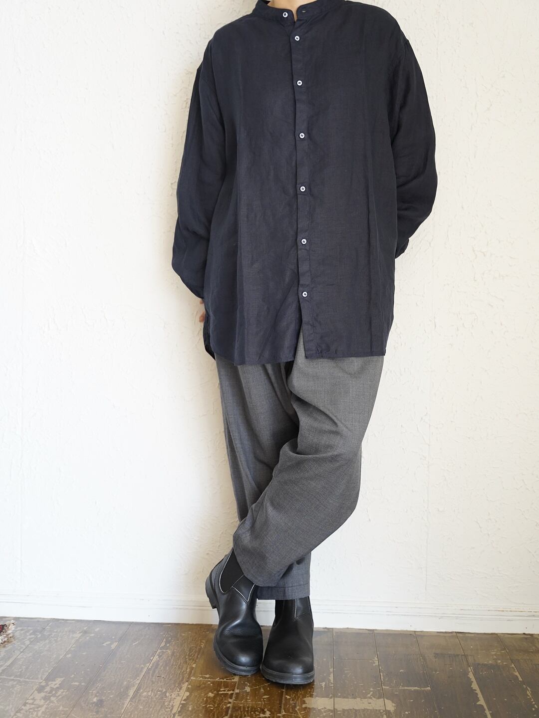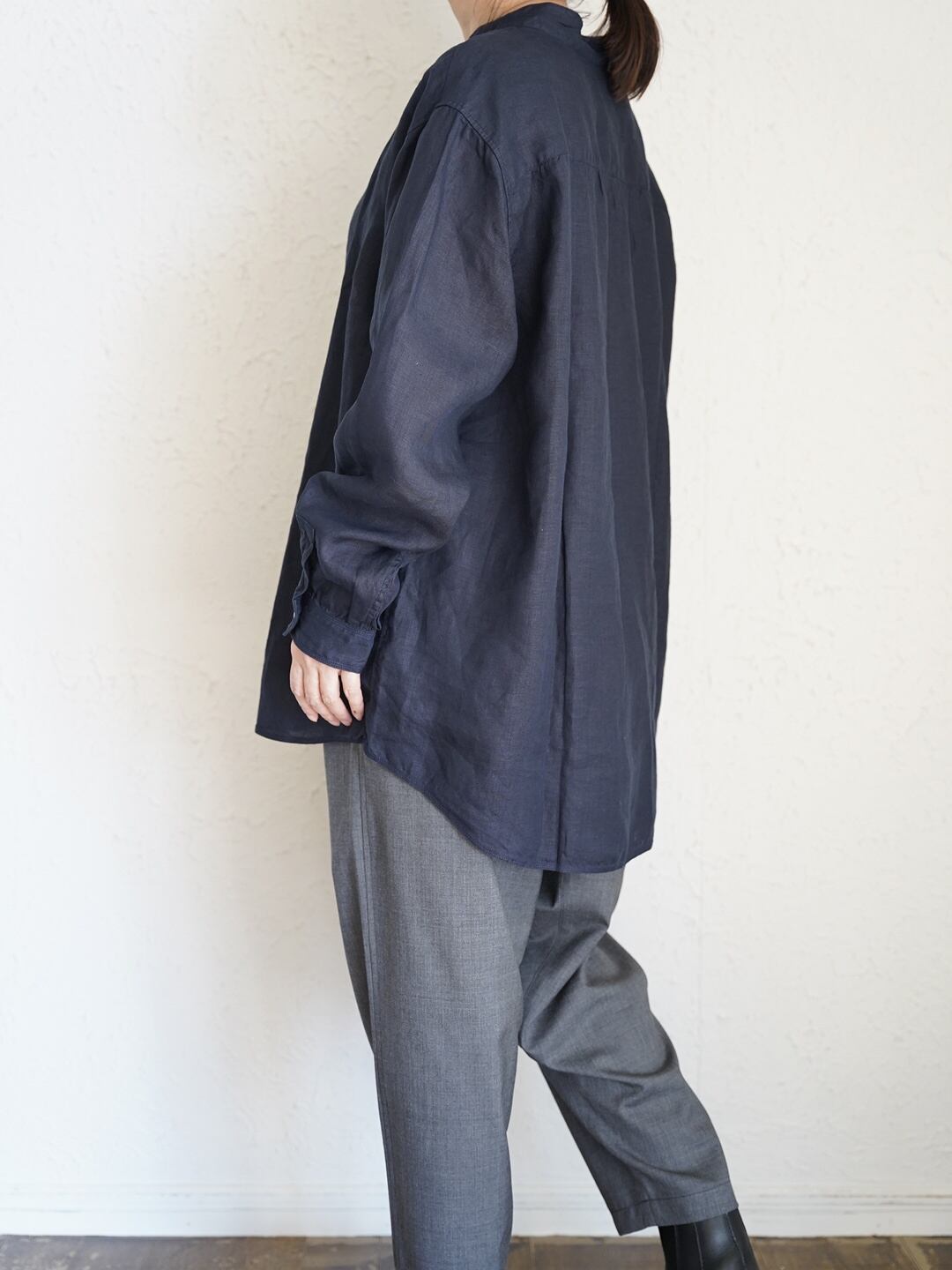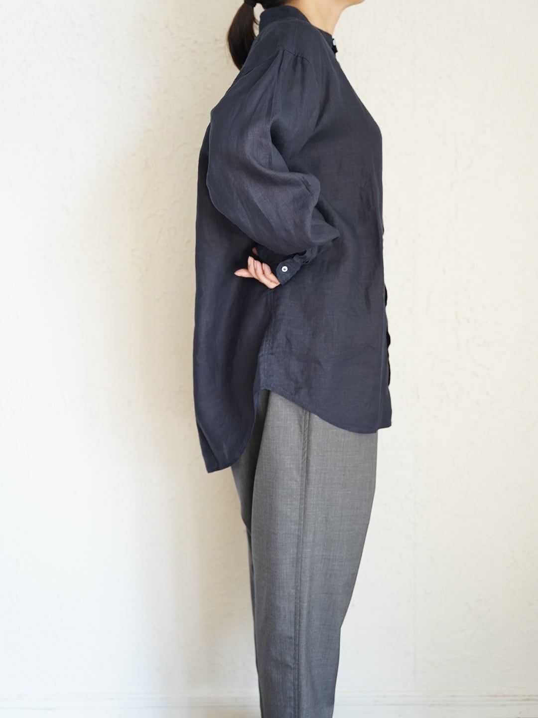 シャツは現代の民族服を構成する洋服としての提案になります。構成は洋服のルールに則りながら、極力デザインを削ぎ落とし、機能性に基づいたパターンメイクとしています。具体的には袖山をいせ込み、袖底を高めに設定することで腕周りの運動量を、背中のヨークにタックやギャザーではなく、いせを入れることで背中の運動量を確保しています。オーバーサイズでゆったりとしたシルエットです。