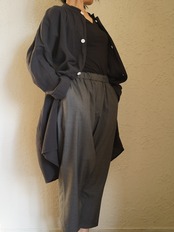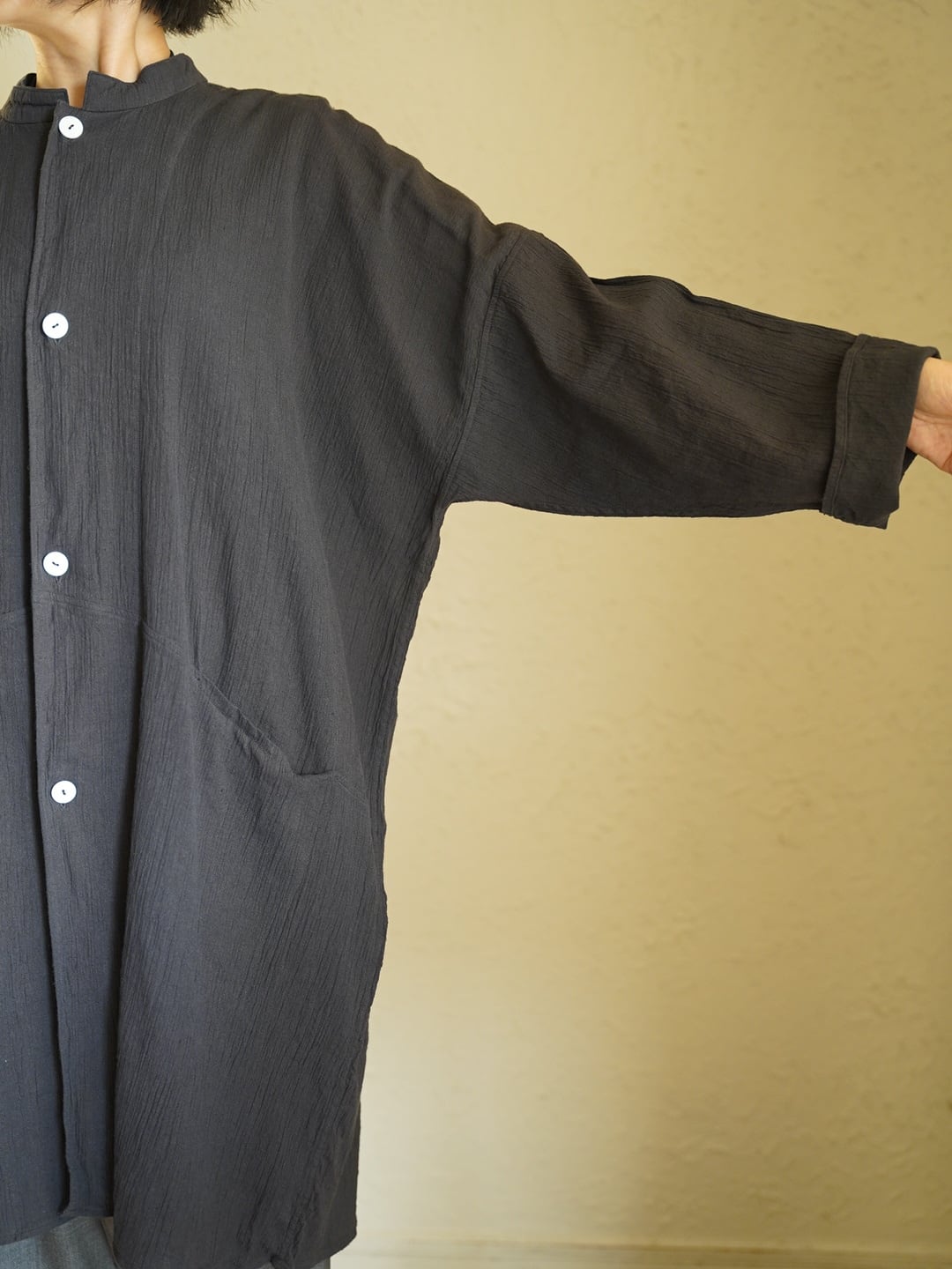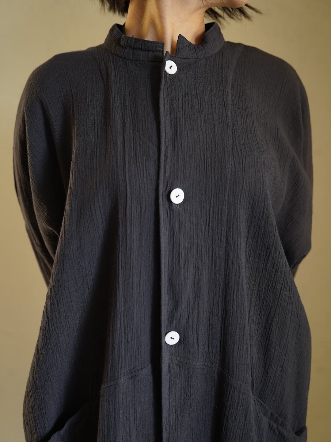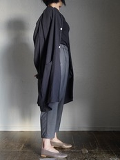 デザインには直線的なパターンを採用し、平面的な構造となっています。緩やかに肩傾斜が入る事で多くの方の体型に自然に馴染み、身体との空間を意識したゆったりとしたシルエットになっています。両サイドにはポケットがつき、ボタンには淡水貝を使用しています。