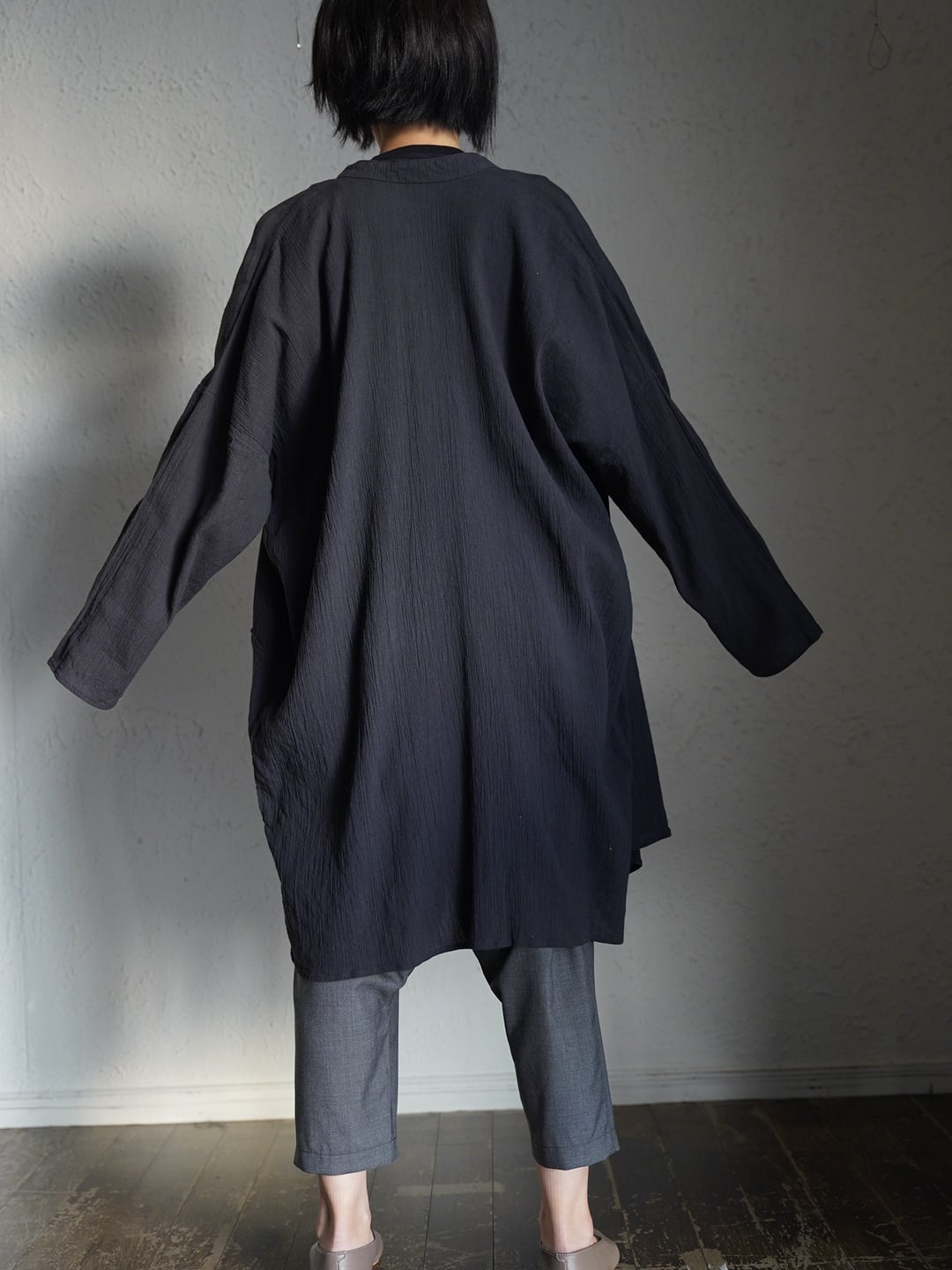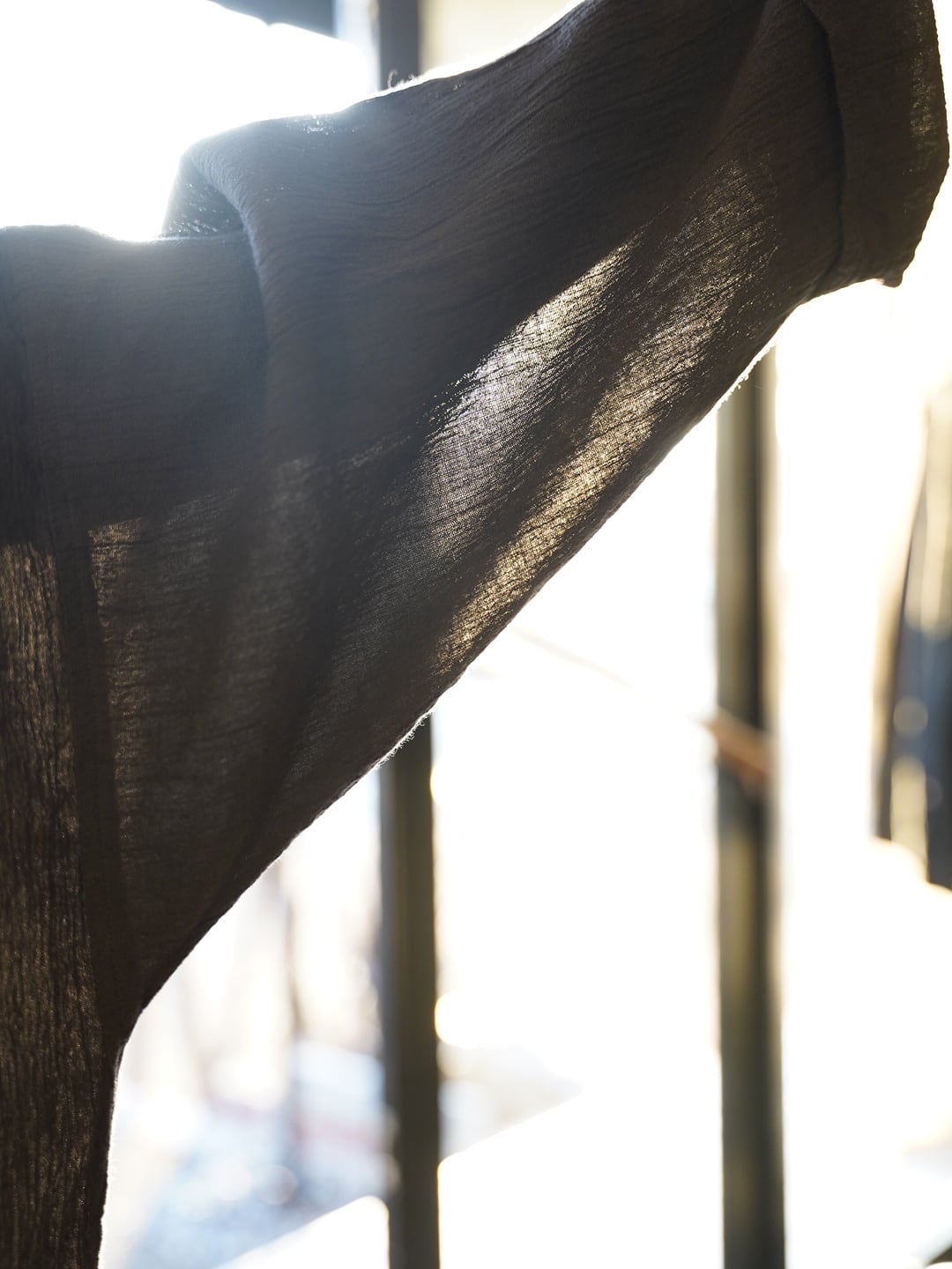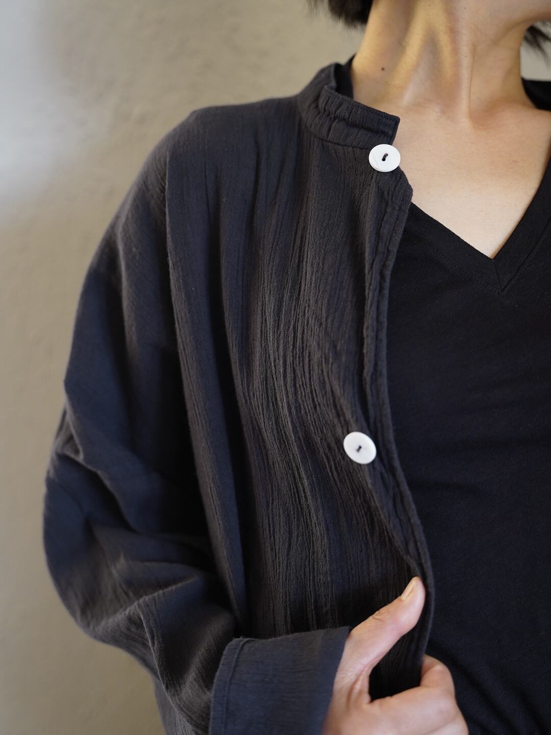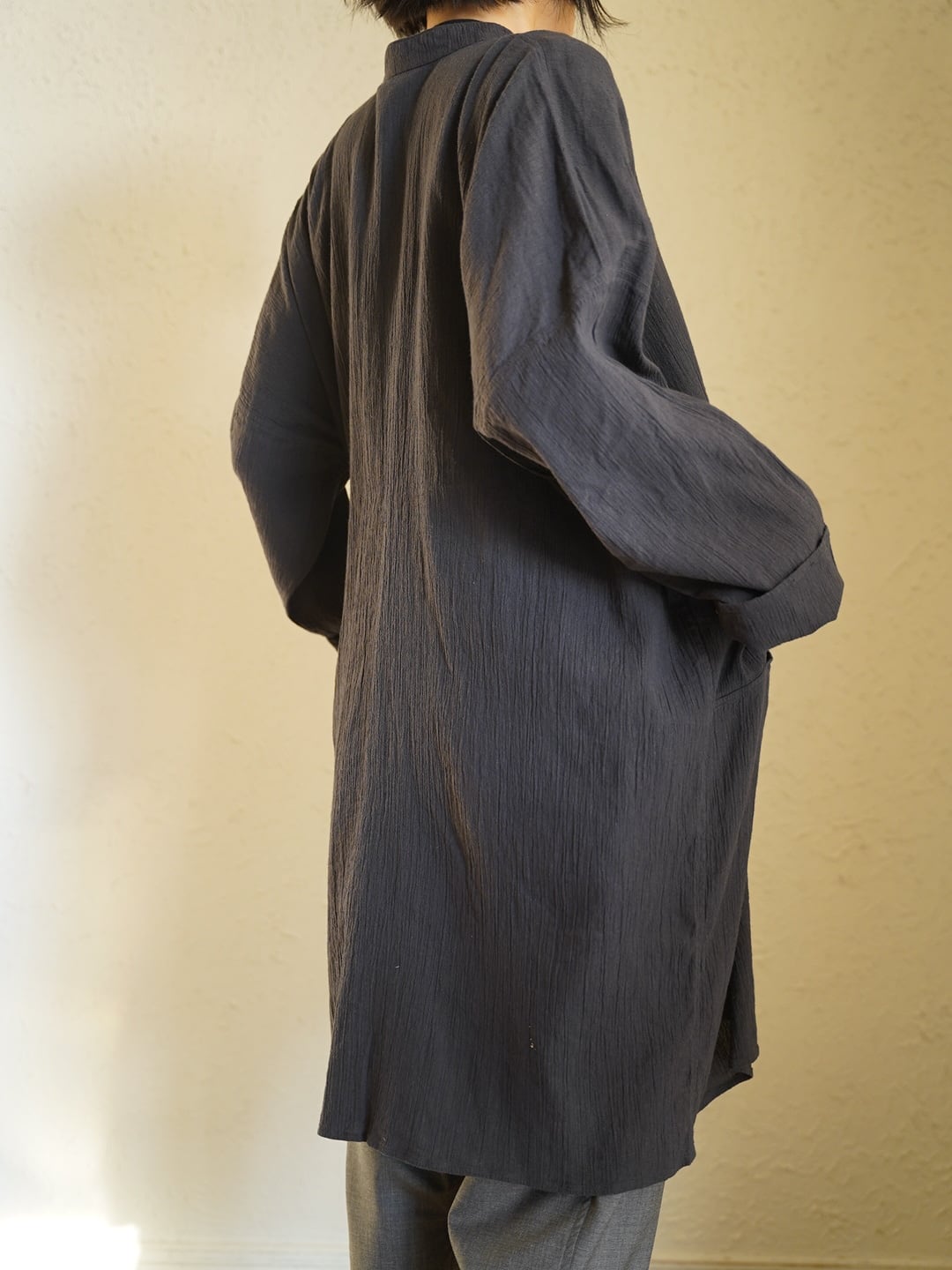 こちらの生地は伝統的な高島縮をベースにしながら、経糸に大麻の糸を、緯糸にオーガニックコットンの糸を使用することで、より高い強度と快適性を求めています。化繊による伸縮ではなく、糸の撚りによって生まれるシボ感、伸縮感は長期の着用でも失われません。肌にもまとわりつかない為、非常に涼しく、長く着用いただけます。