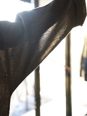 滋賀県、高島を産地とする高島縮は主に天然繊維の緯糸に強く撚りをかけ、独自の加工を施す事でシボ感を固定させる、独自の製法で作られています。