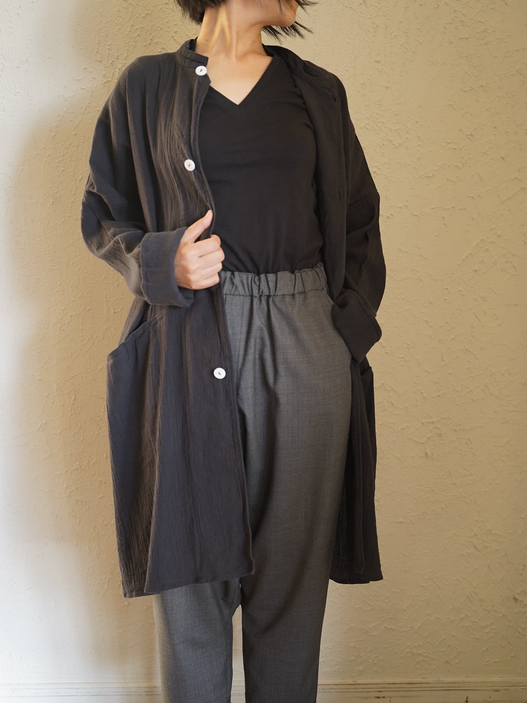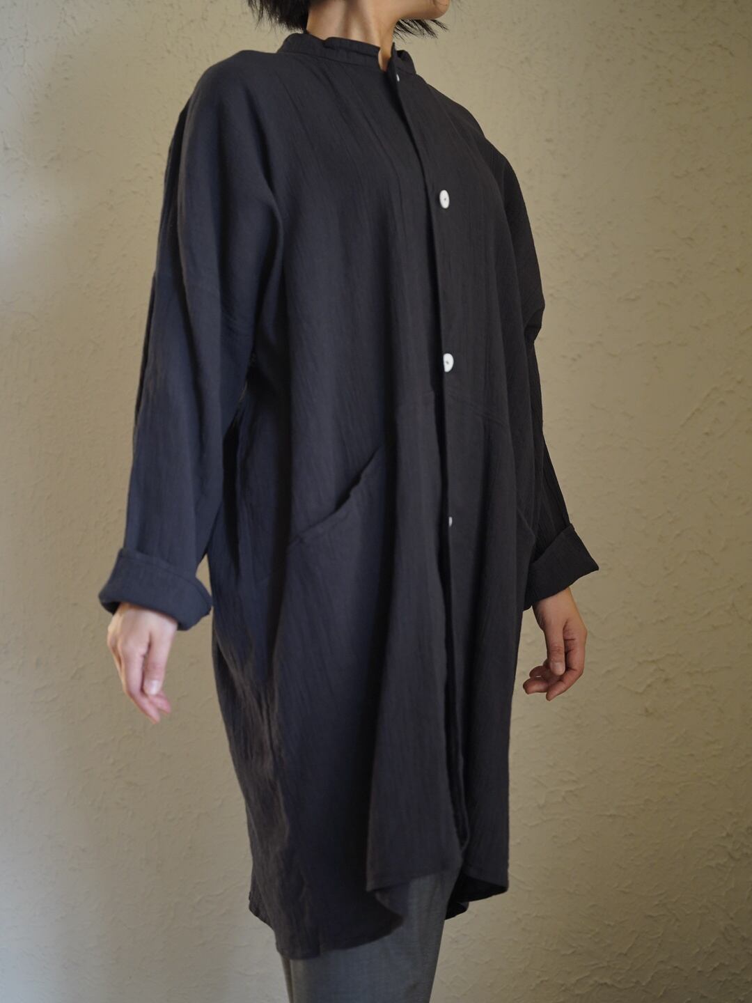 デザインには直線的なパターンを採用し、平面的な構造となっています。緩やかに肩傾斜が入る事で多くの方の体型に自然に馴染み、身体との空間を意識したゆったりとしたシルエットになっています。両サイドにはポケットがつき、ボタンには淡水貝を使用しています。