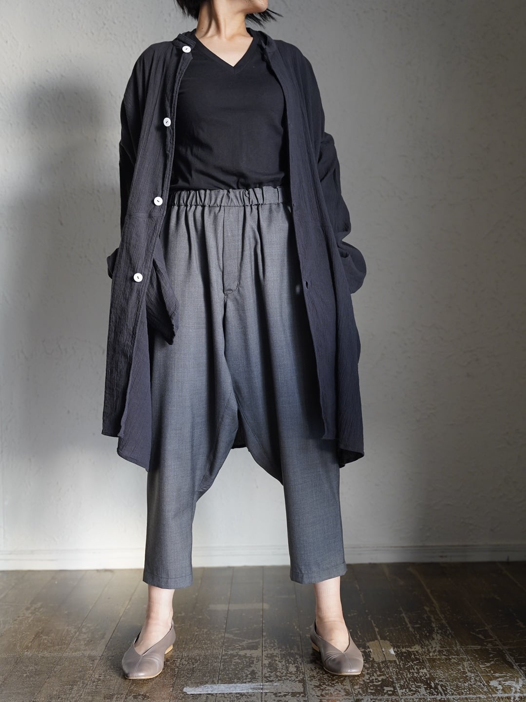 こちらの生地は伝統的な高島縮をベースにしながら、経糸に大麻の糸を、緯糸にオーガニックコットンの糸を使用することで、より高い強度と快適性を求めています。化繊による伸縮ではなく、糸の撚りによって生まれるシボ感、伸縮感は長期の着用でも失われません。肌にもまとわりつかない為、非常に涼しく、長く着用いただけます。