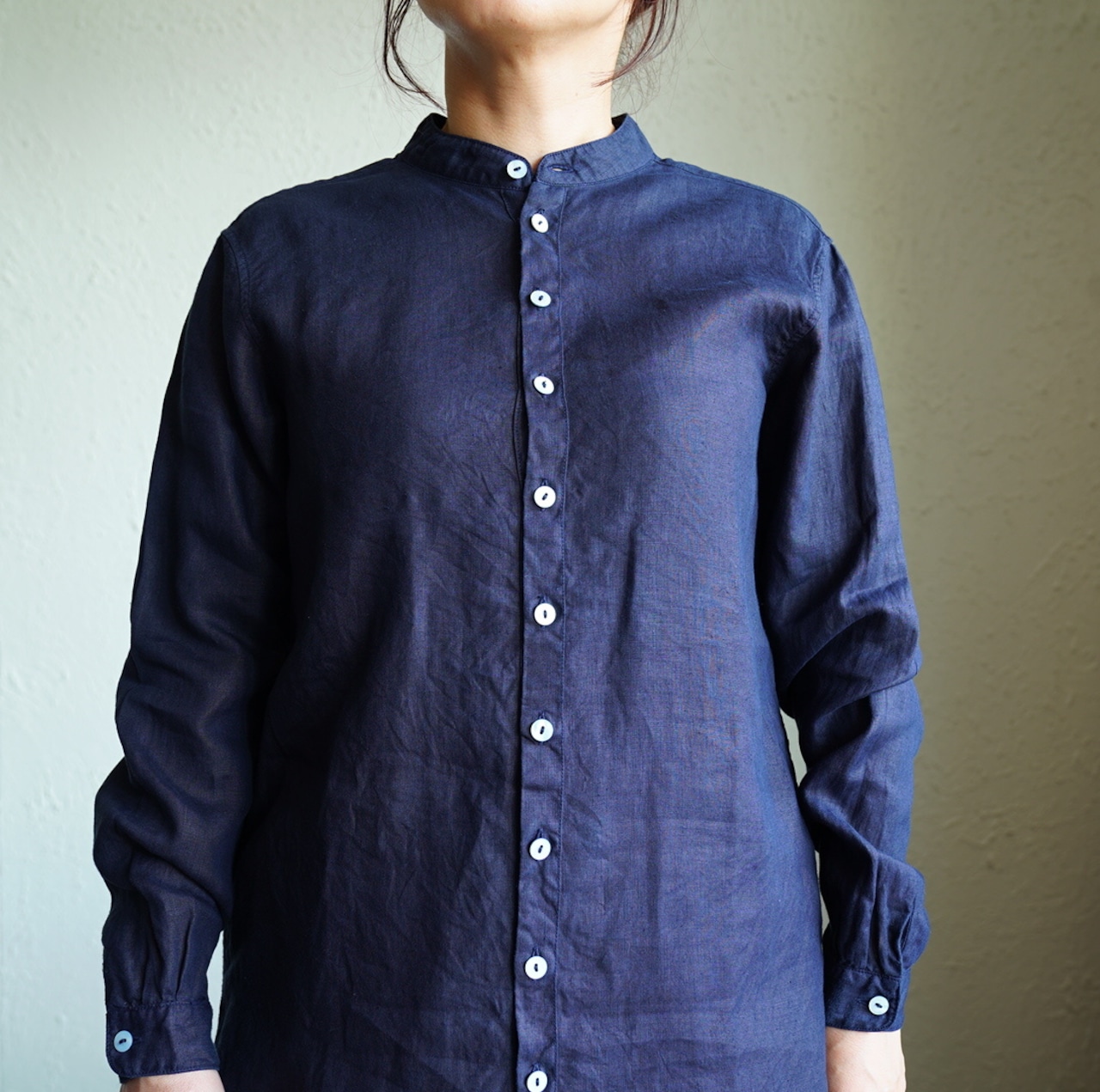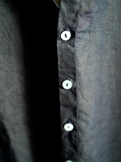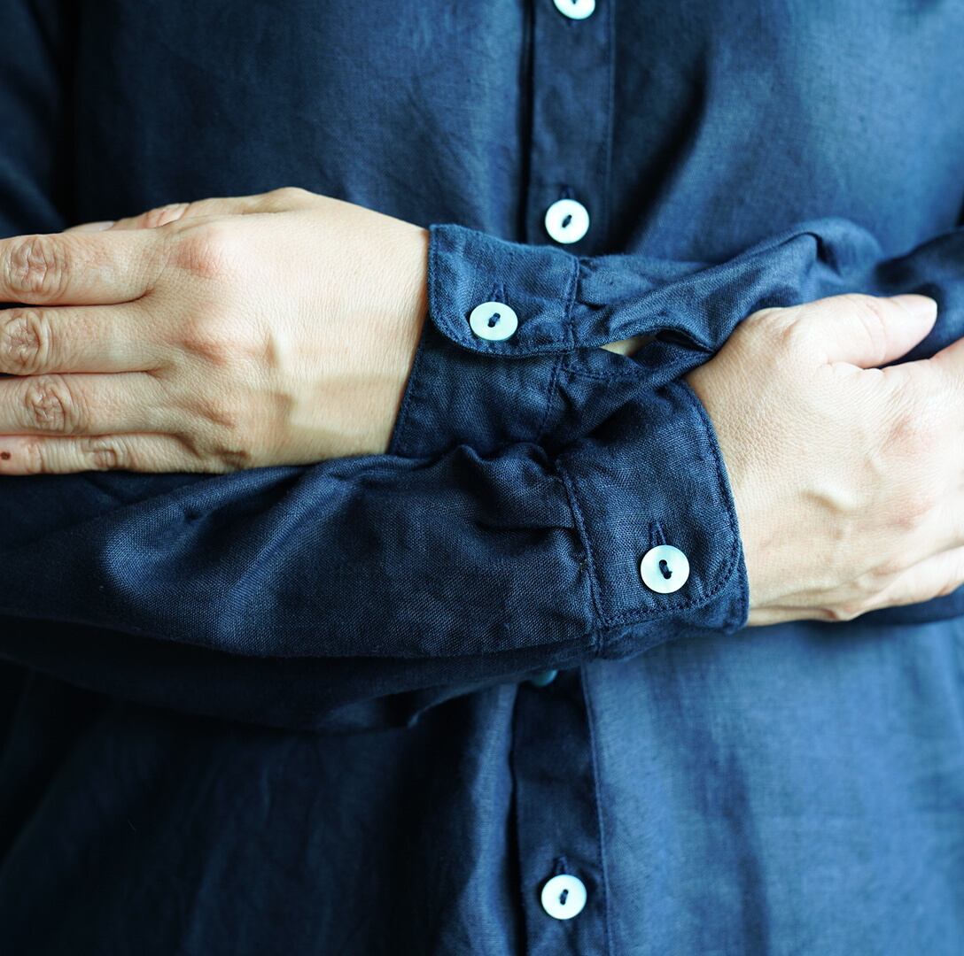 大麻100%の糸を経糸、緯糸に使用しています。大麻は強靭な繊維ですが、経年変化で肌に徐々に馴染んでゆき、麻から綿のような質感の変化が楽しめます。大麻の特性であるひんやりとした触感は洗濯を繰り返しても継続し、真夏でも快適に着用が可能です。シャツは現代の民族服を構成する洋服としての提案になります。構成は洋服のルールに則りながら、極力デザインを削ぎ落とし、機能性に基づいたパターンメイクとしています。具体的には袖山をいせ込み、袖底を高めに設定することで腕周りの運動量を、背中のヨークにタックやギャザーではなく、いせを入れることで背中の運動量を確保しています。ボタンには薄い白蝶貝を用いてます。ポケットは付いていませんが左右脇に深いスリットが入っている為、パンツのポケットを不自由なく使用できます。丈の短いSH-27 の展開もあります。MITTANは世界に遺る衣服や生地にまつわる歴史を元に、現代の民族服を提案しています。