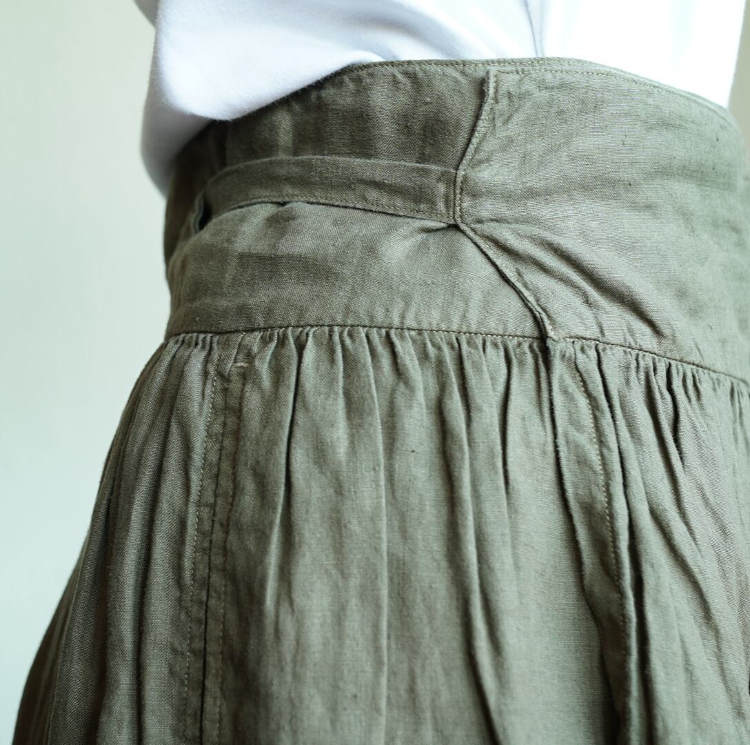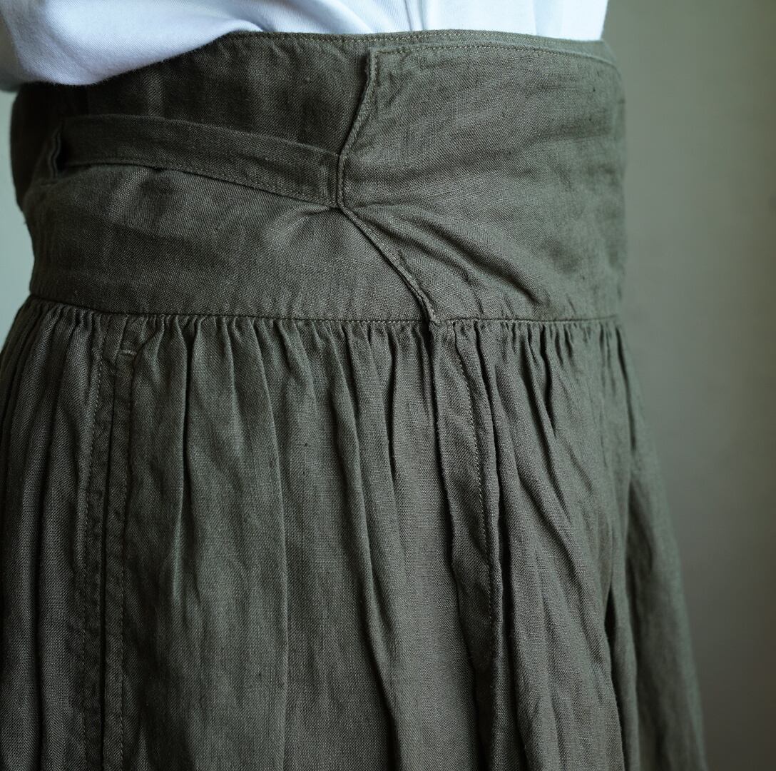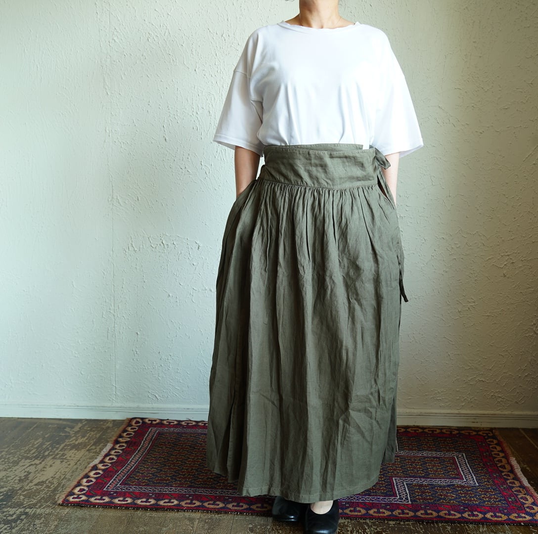 長い紐を使いウエストを結ぶ、分量感のある巻きスカートです。ウエストの位置はハイウエストでもローウエストでも、お好みの位置で着用することができます。巻きスカートなので、サイズに合わせて調整することも可能です。仕様により左前でも右前でも巻くことができます。両サイドにはポケットもあり、機能性も兼ね備えています。