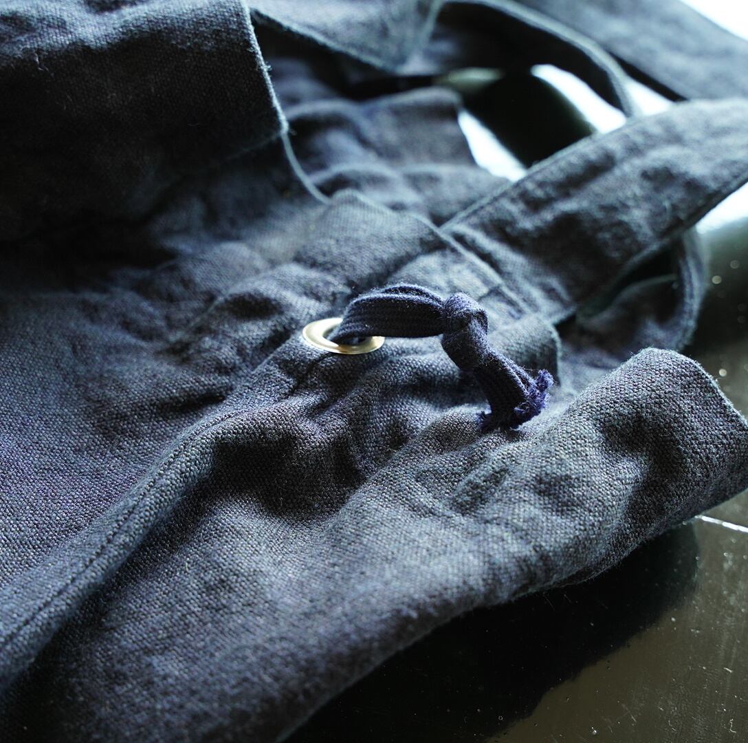 過去に廃盤になったものの、本企画の為に再び生産した生地を使用しています。二種類の麻、亜麻(リネン)と苧麻(ラミー)の国内紡績の混紡糸を経糸と緯糸に使用することでハリ感と適度な厚みが表現されています。また、亜麻独特のたわみ感が苧麻と混紡されることで軽減されています。着用を繰り返すことでまるで古布のような風合いになります。