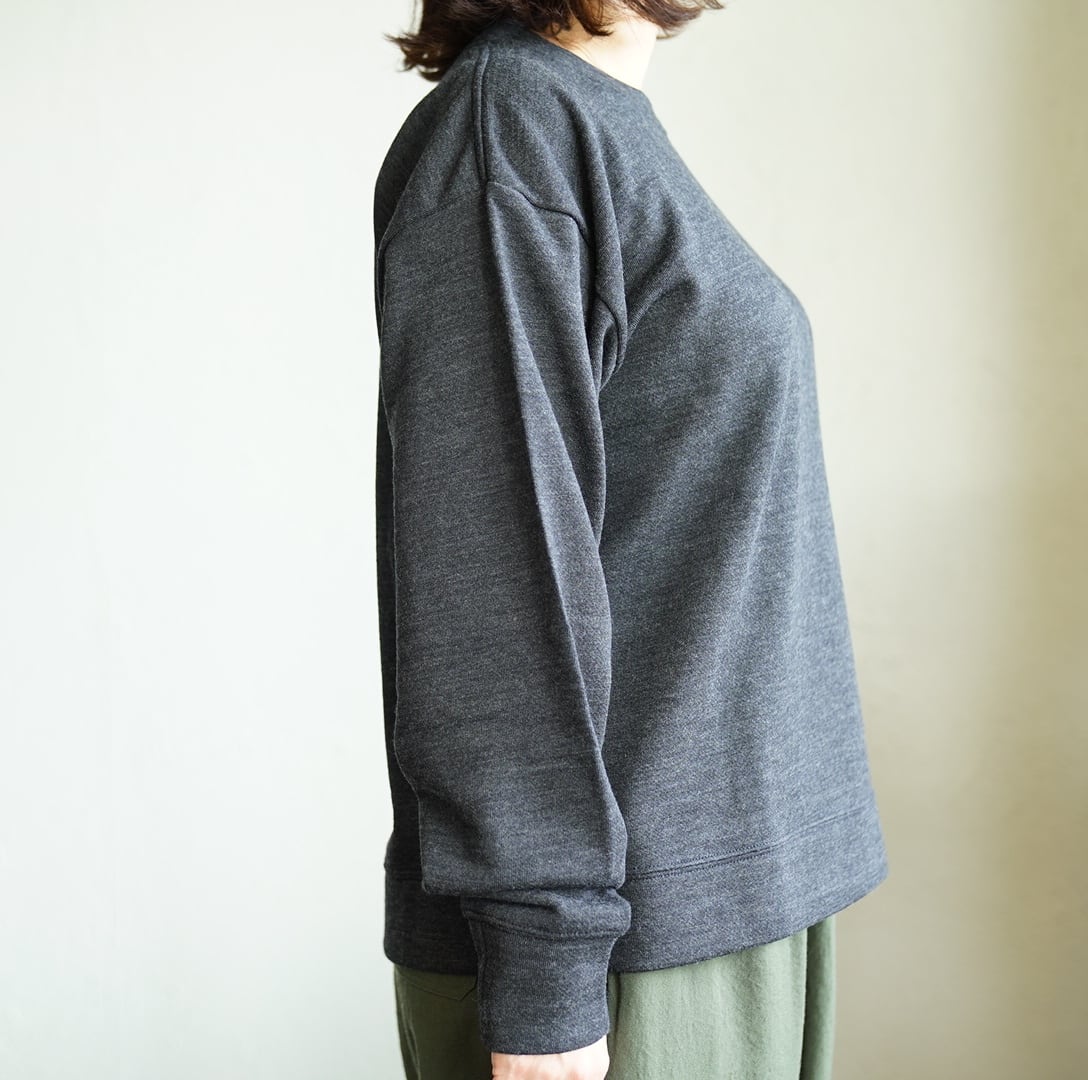 トレーナー型のデザインですが、全てを同素材で表現し、緩い肩傾斜と浅いアームホールによって、より平面的なシルエットを表現しています。肩から後ろ襟ぐりにかけてはタコバインダー仕様を採用しており、頻繁な着用に耐える強度を考慮しています。これにより、長く快適にご利用いただけます。
