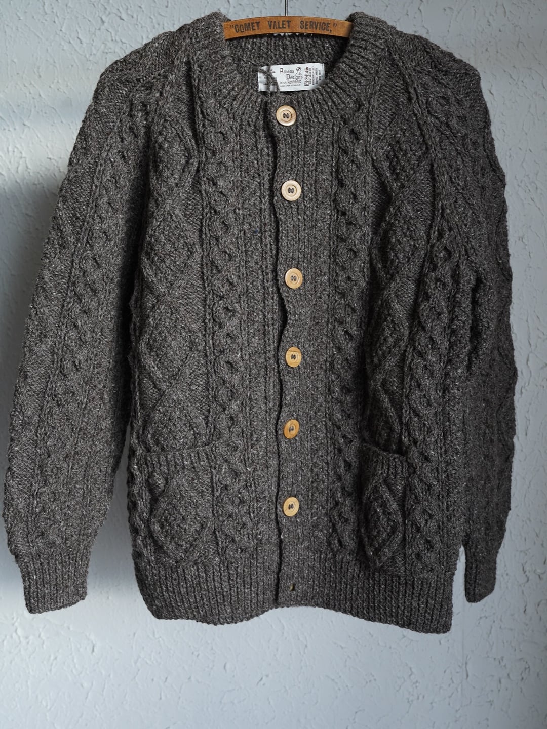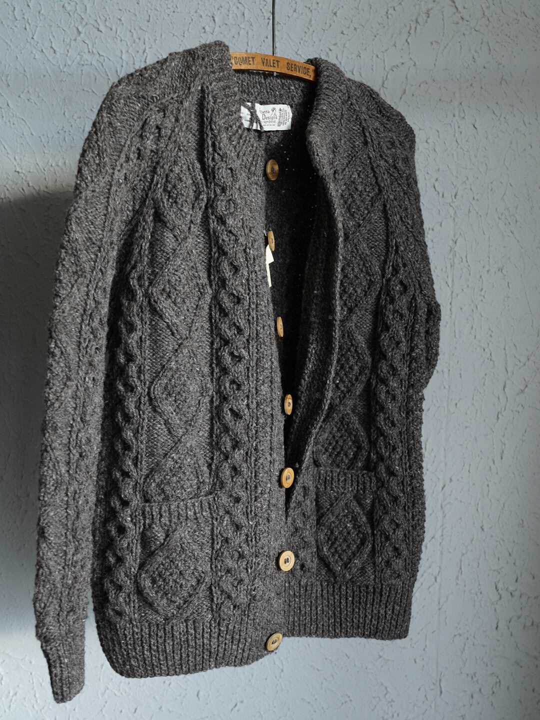 素朴なウール、優しい印象の大き目のウッドボタン、伝統的なアランの編み目も特徴です。