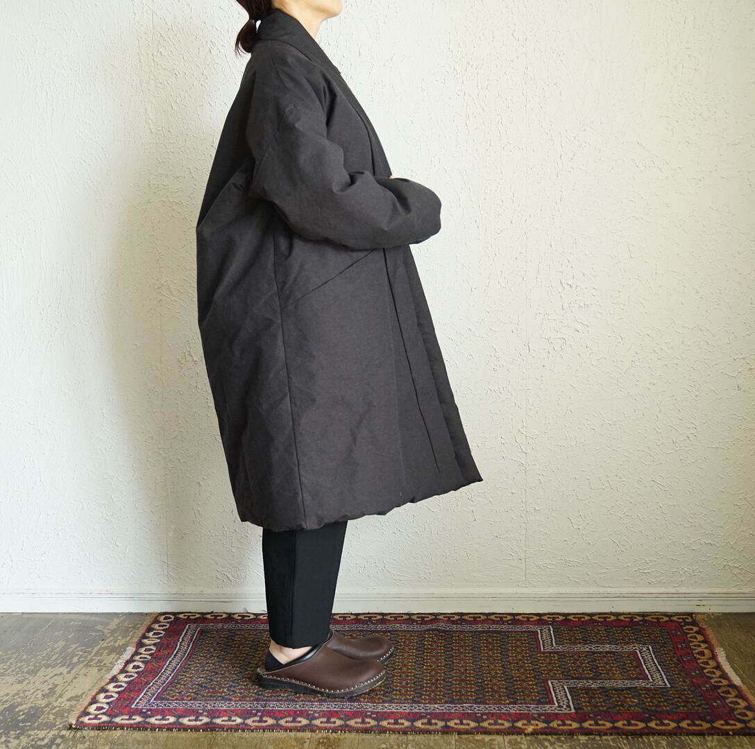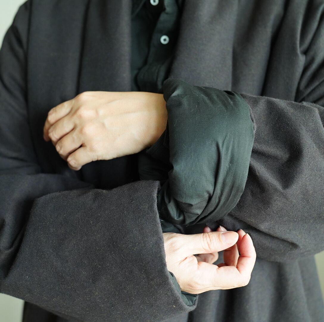 静岡の浜松の工房で縫製された防寒用の着物「丹前」をベースとした中綿入りのコートです。表地は経糸は綿、緯糸は毛の同じく浜松産の高密度生地を使用。裏地にも高密度の綿生地を使用し、中の綿を挟み込むこと空気の層ができ、真冬も対応できるくらい暖かな素材となっています。
