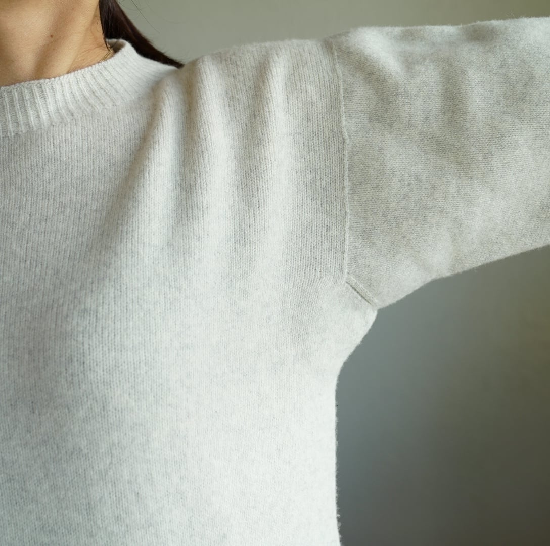 ホールガーメントという糸から1着まるごとの状態で、編み機から直接編成される機械を使って作っています。ホールガーメントは縫い代が無いのが特徴で、構造上の制約も多く無縫製の分かえって平面的に仕上がる事もあるのですが、逆にその特性を生かした平面的なセーターとなっています。肩傾斜は水平で、襟ぐり以外は直線で構成されています。リブは伸びてもスチームアイロンや水を通すと元に戻ります。