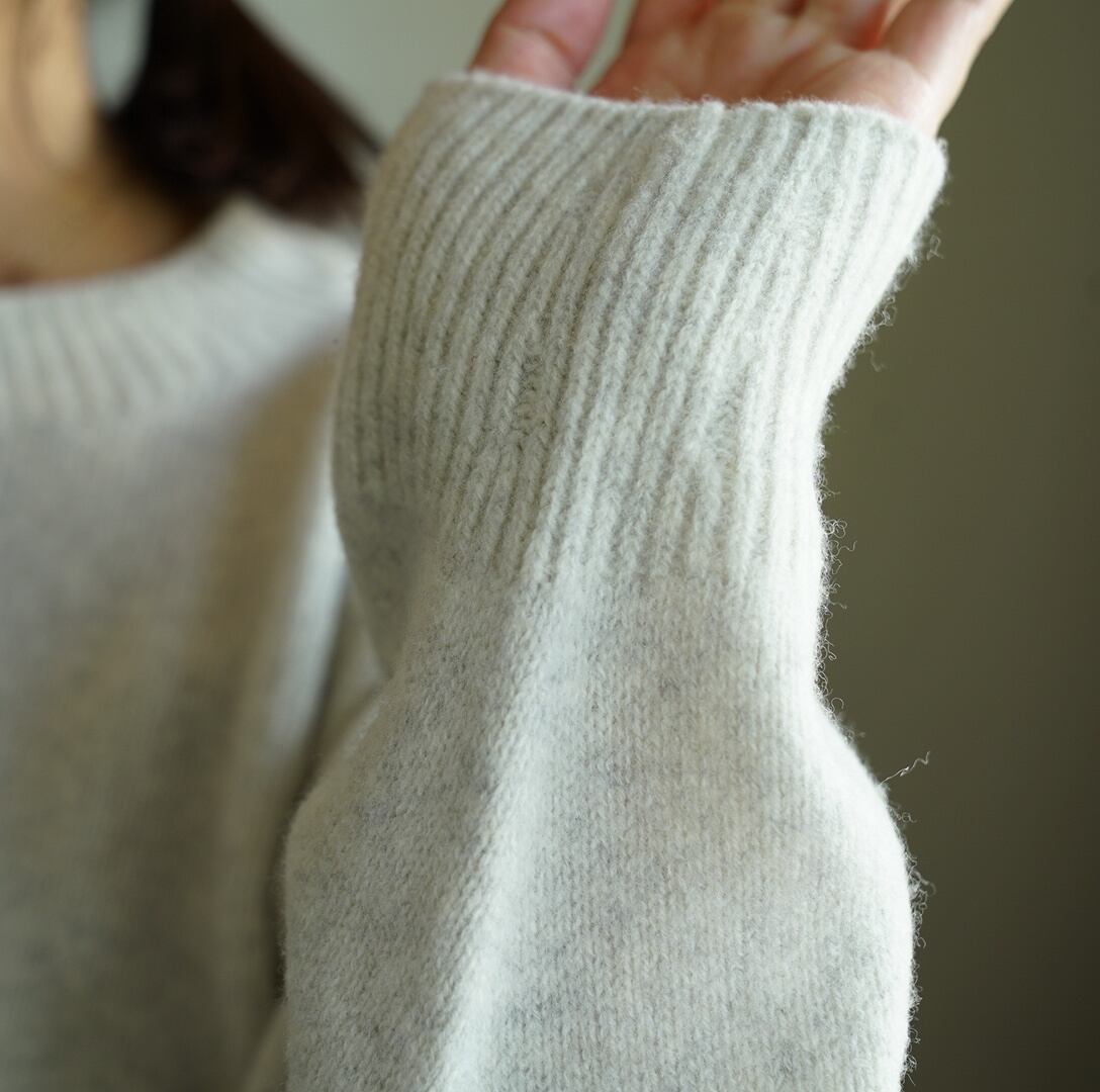 糸は南米ウルグアイのウルグアイ産の平均繊度15.5マイクロンの超極細メリノウールを使用しています。滑らかでありながら嵩高性があり、カシミヤに近い肌触りで、糸を2本取りにすることで、適度なボリュームが生まれたミドルゲージのニットになります。原料を大阪は泉州の紡績工場、深喜毛織さんが紡績しています。編み立ての工場は福島の葛尾村にあり、愛知県岡崎に本社工場を持つ金泉ニットさんが国の自立・帰還支援雇用創出企業立地補助金を活用して設立されました。